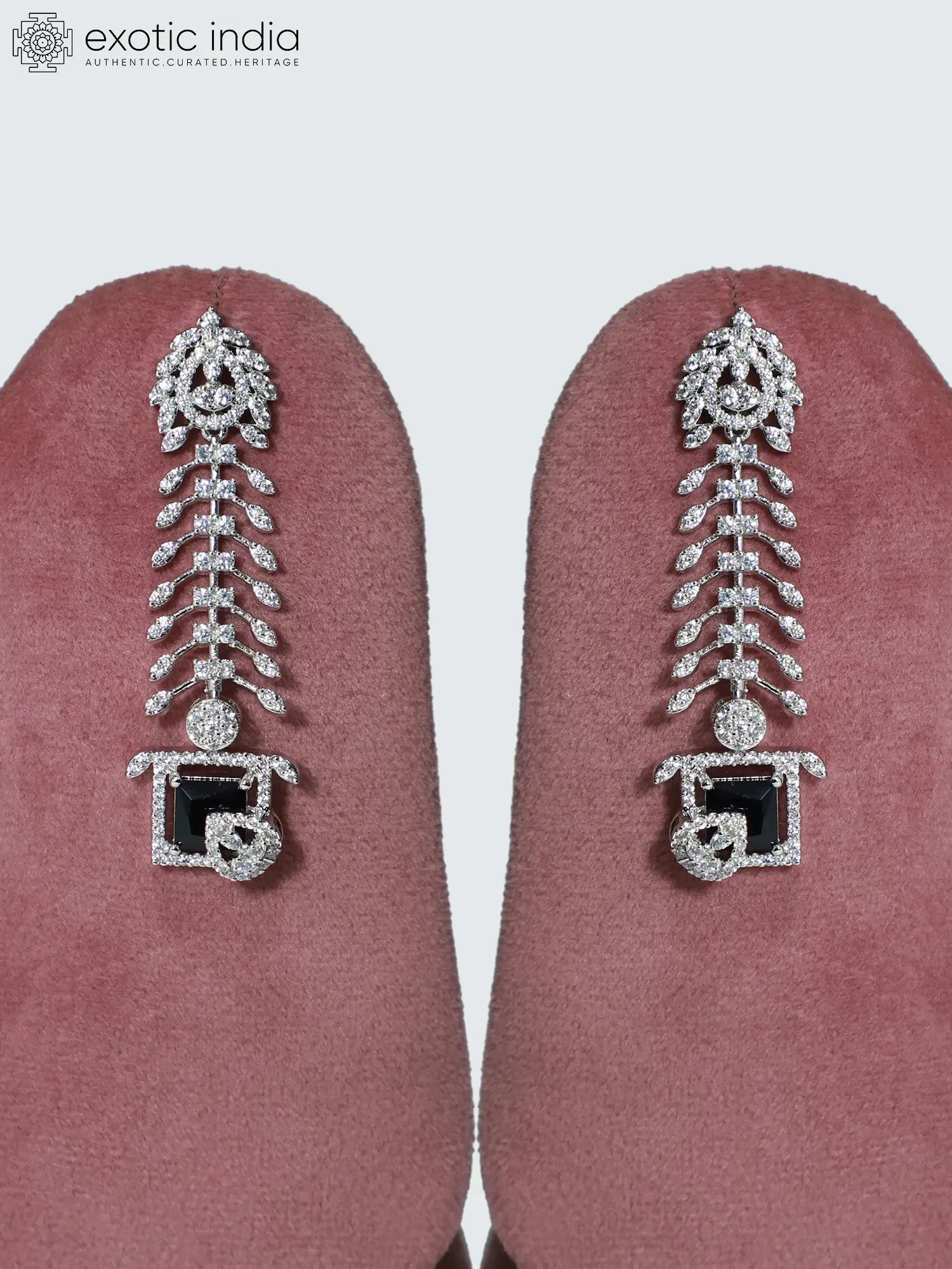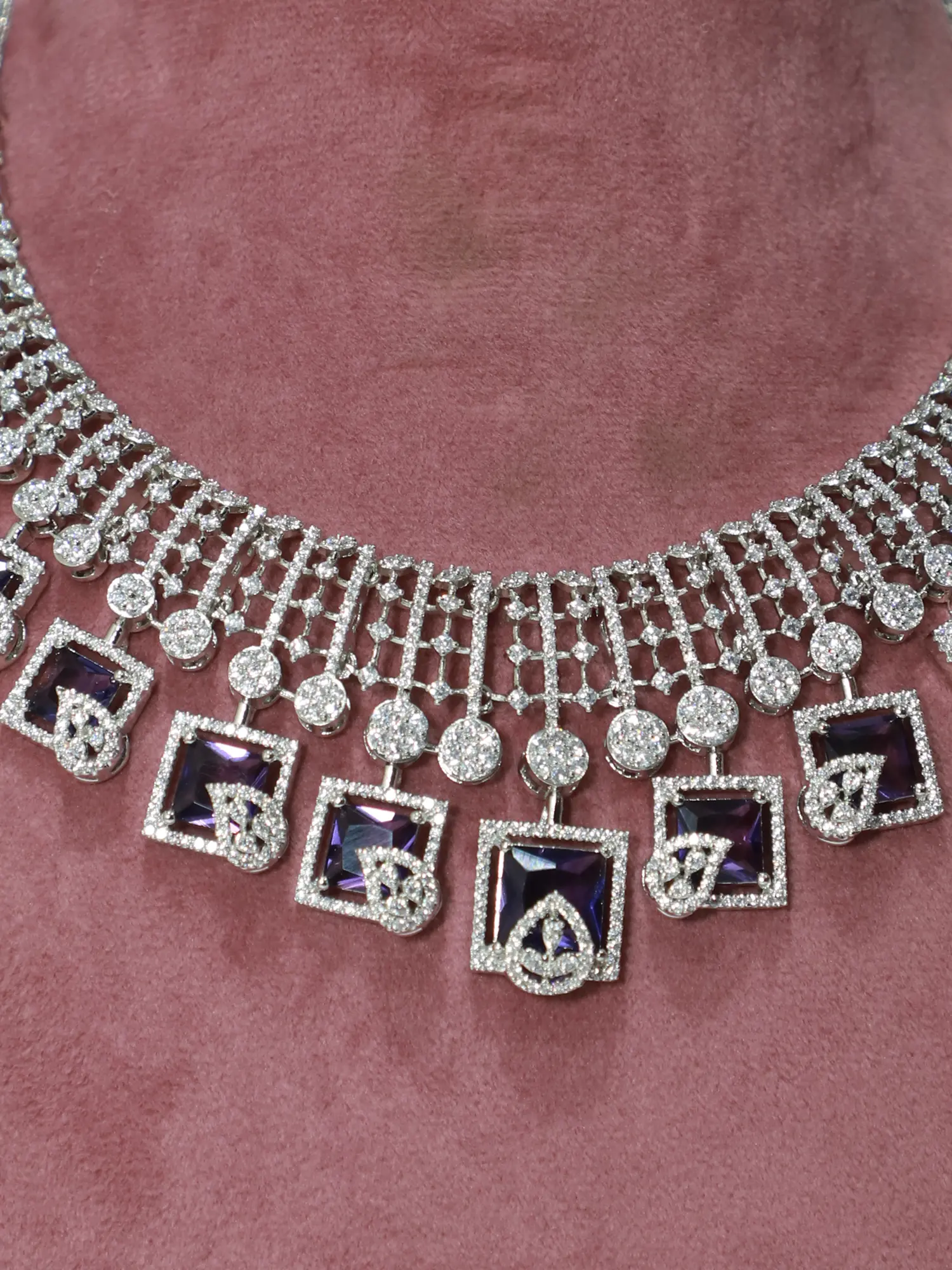 Features a striking necklace and matching earrings adorned with dazzling American diamonds.