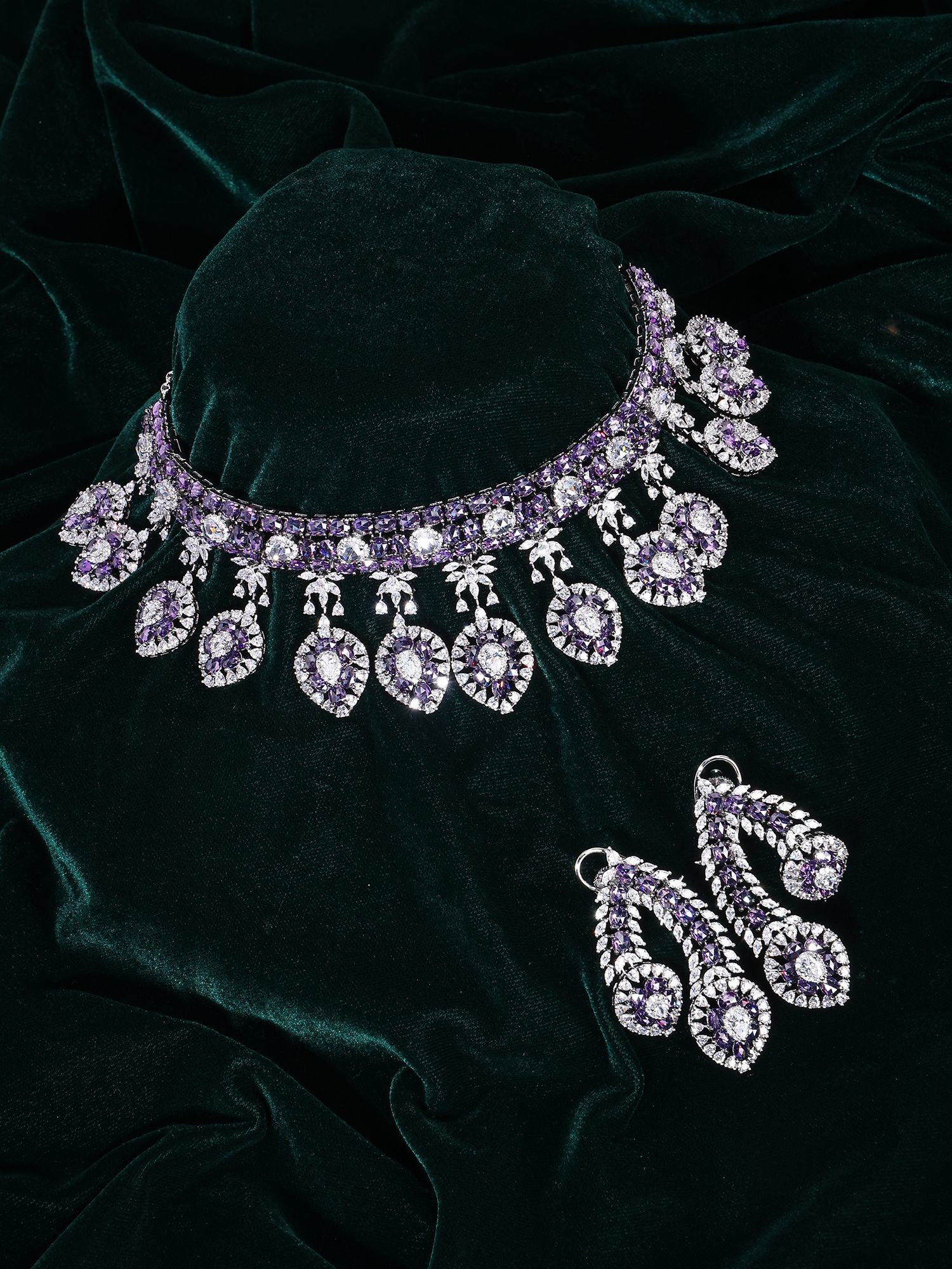 Floral American Diamond Necklace and Earrings Set with Pink Gemstones