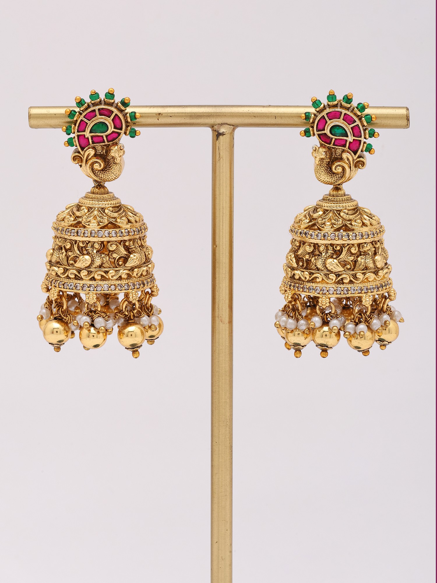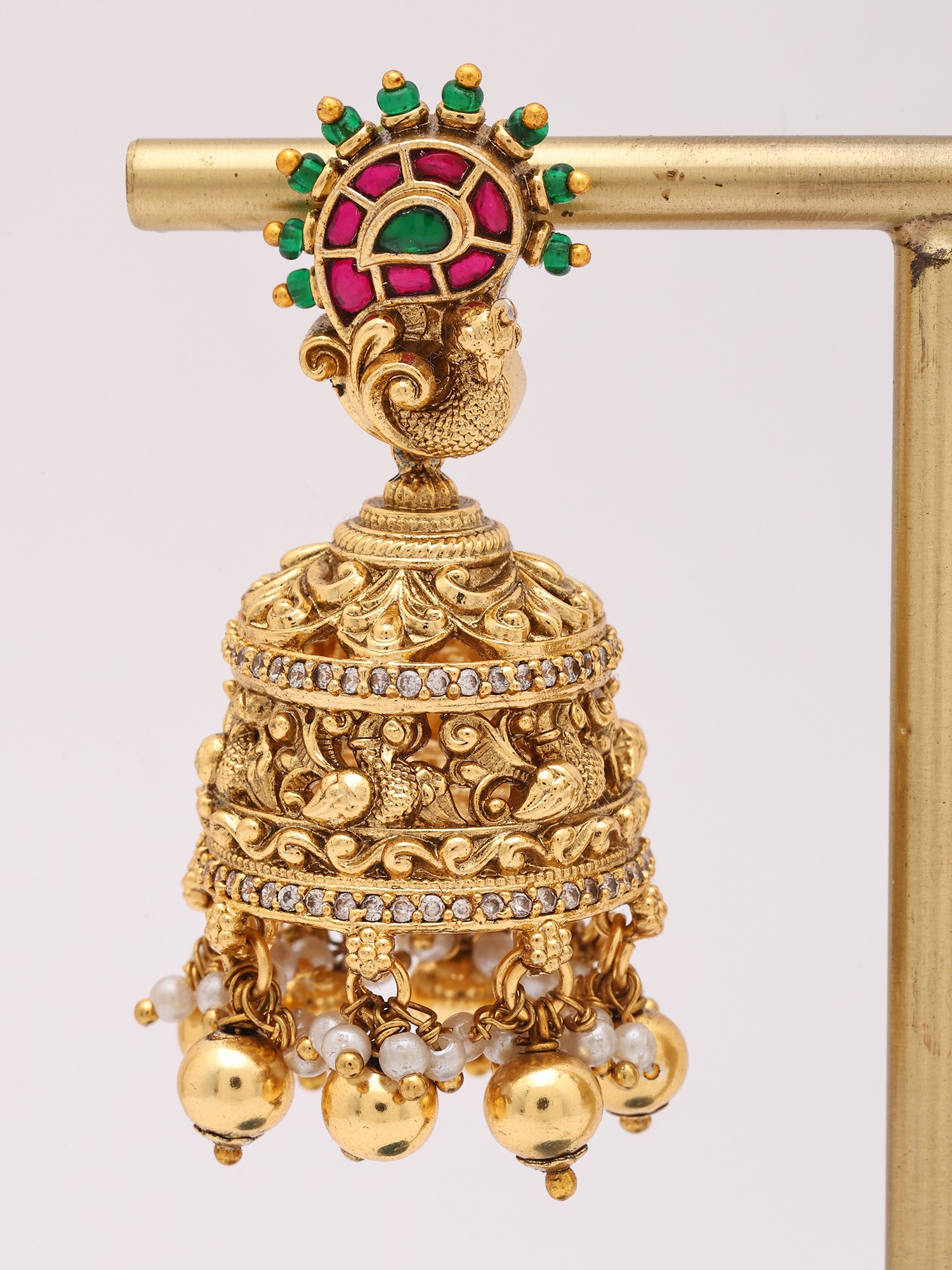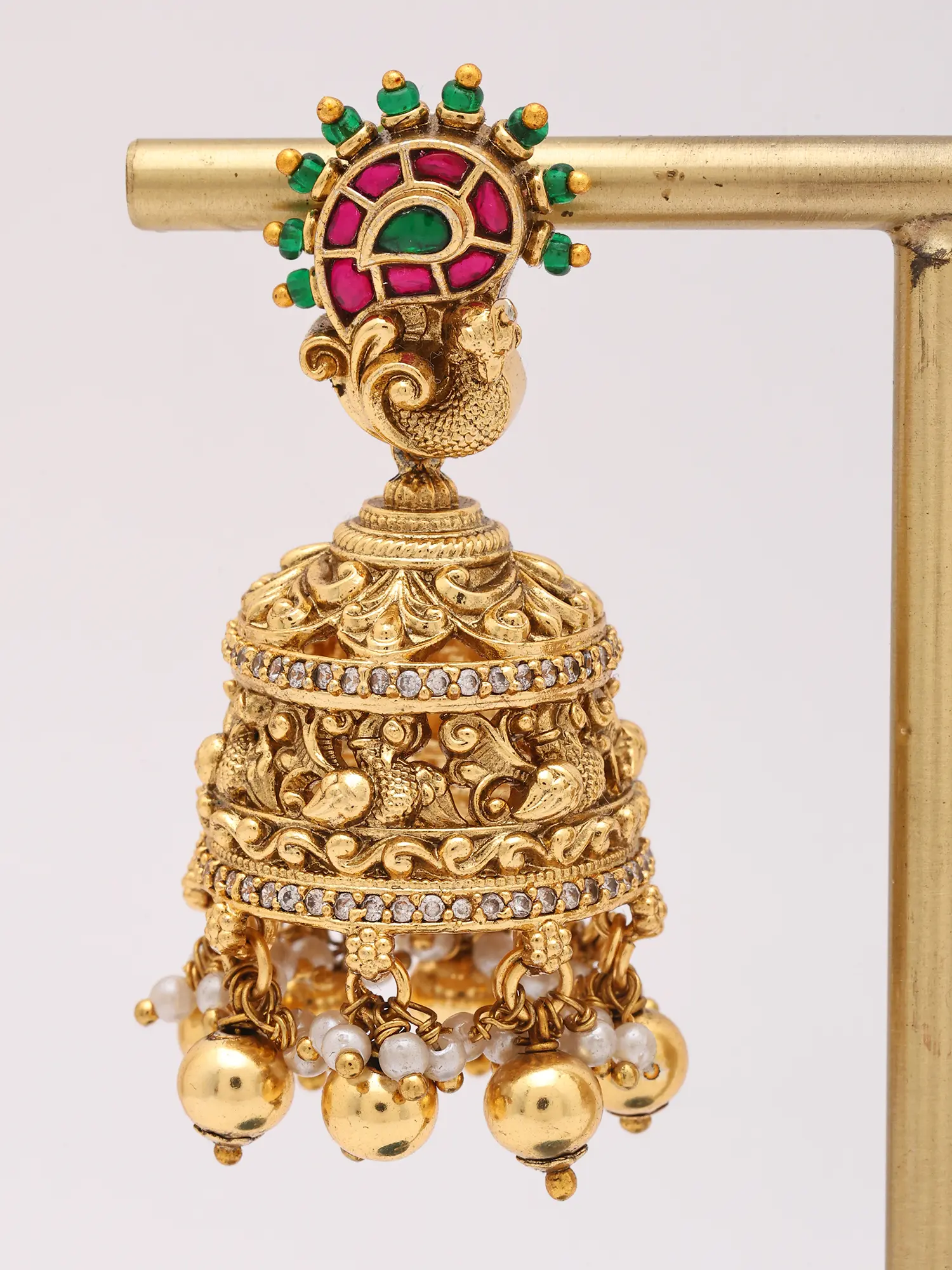 The captivating design features a striking peacock motif at the apex, adorned with rich, vibrant stones that echo the gemstone hues of emerald and ruby. Below, the bell-shaped jhumka form unfolds with a symphony of intricate carvings and a scattering of tiny, shimmering accents. Suspended from the base, luminous pearls and golden spheres sway gently, adding a playful yet elegant movement that catches the light beautifully, with a height of 2.15 inches and a width of 0.80 inches.