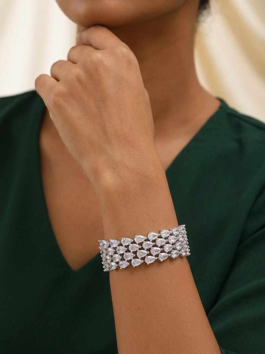 You'll be mesmerized by the radiant play of light across the meticulously faceted pear-cut stones. Arranged in a sophisticated, multi-layered design, they create a breathtaking visual effect. This piece boasts a substantial presence, measuring a graceful 0.5 inches in width and a versatile 7.5 inches in length, ensuring a comfortable yet striking statement on your wrist.