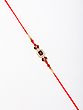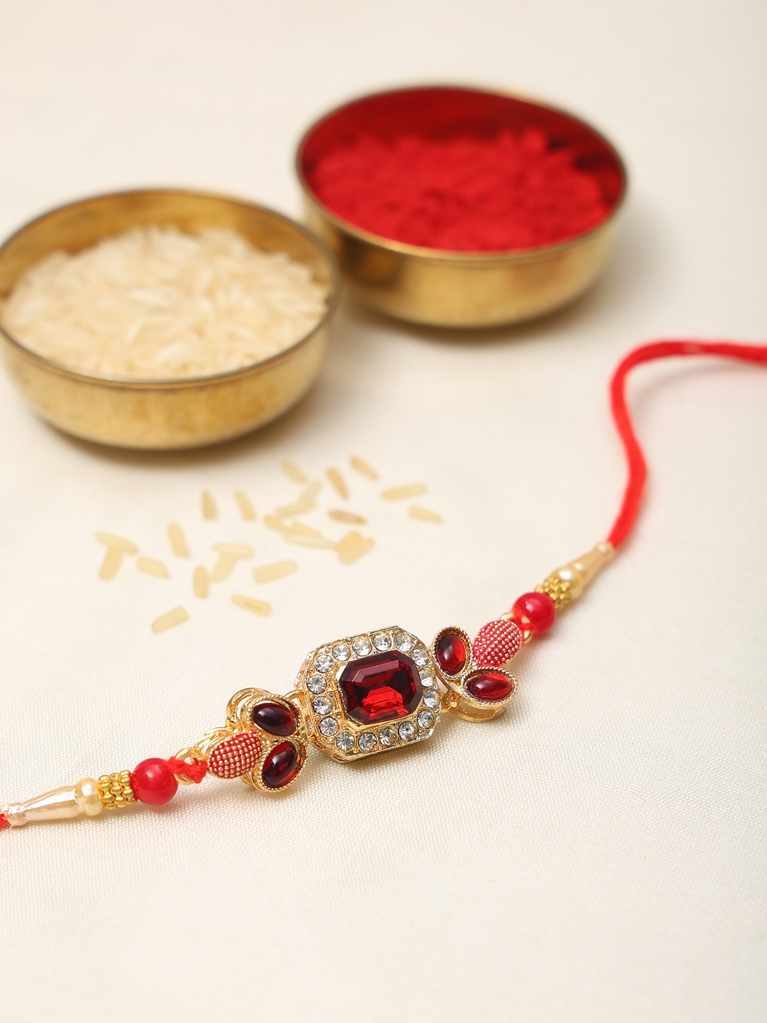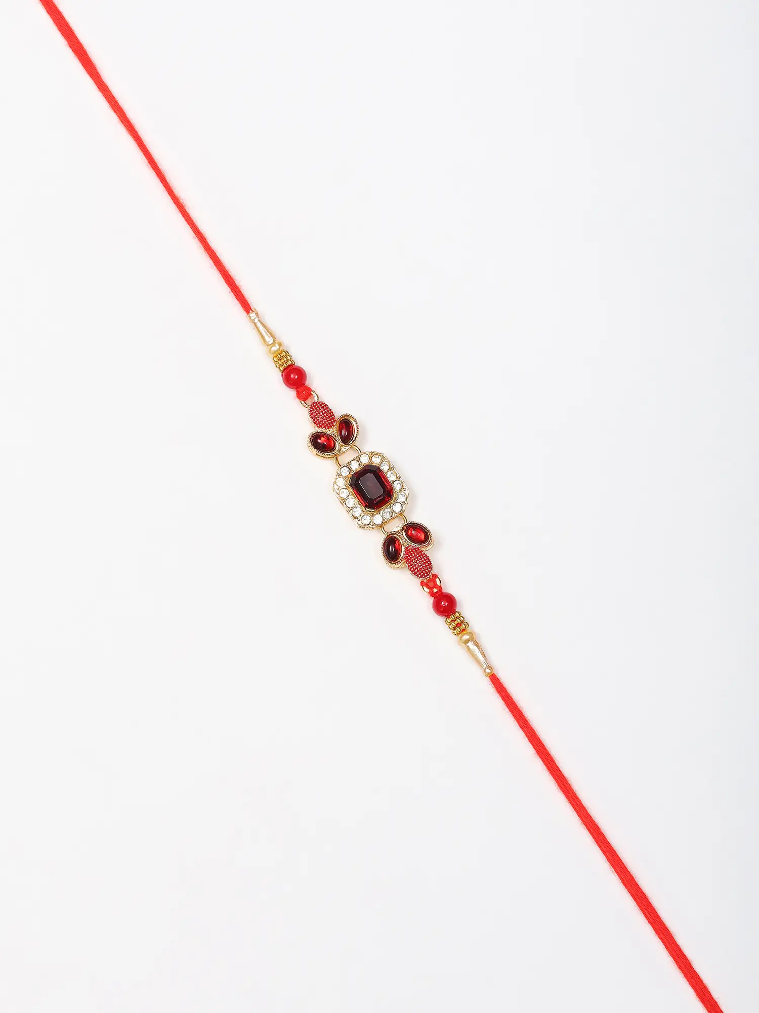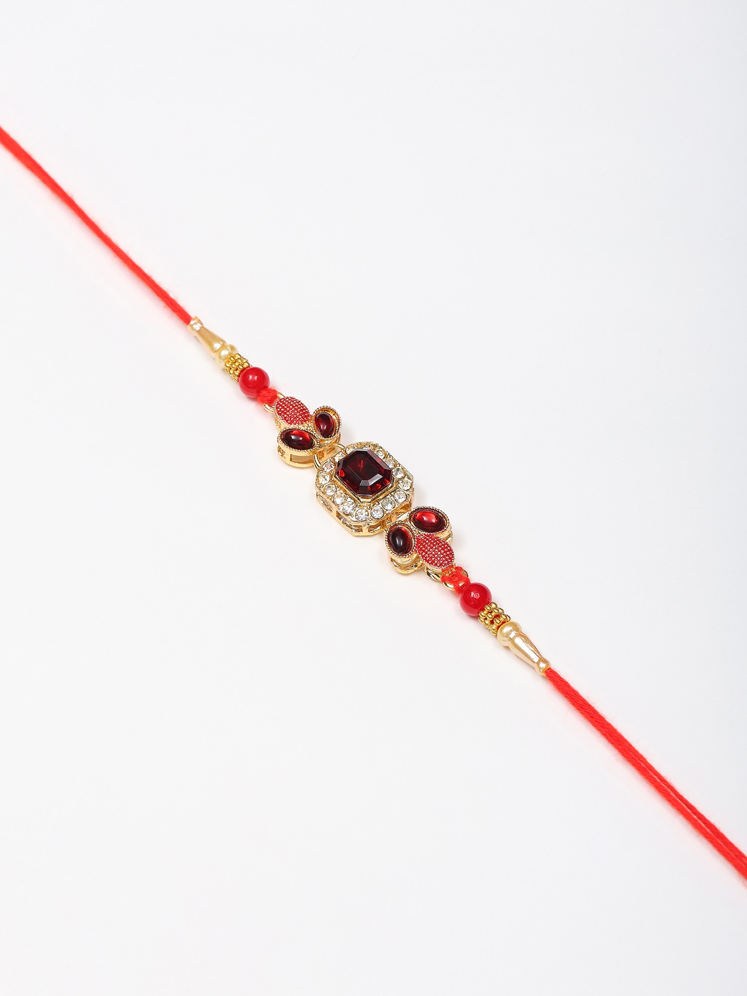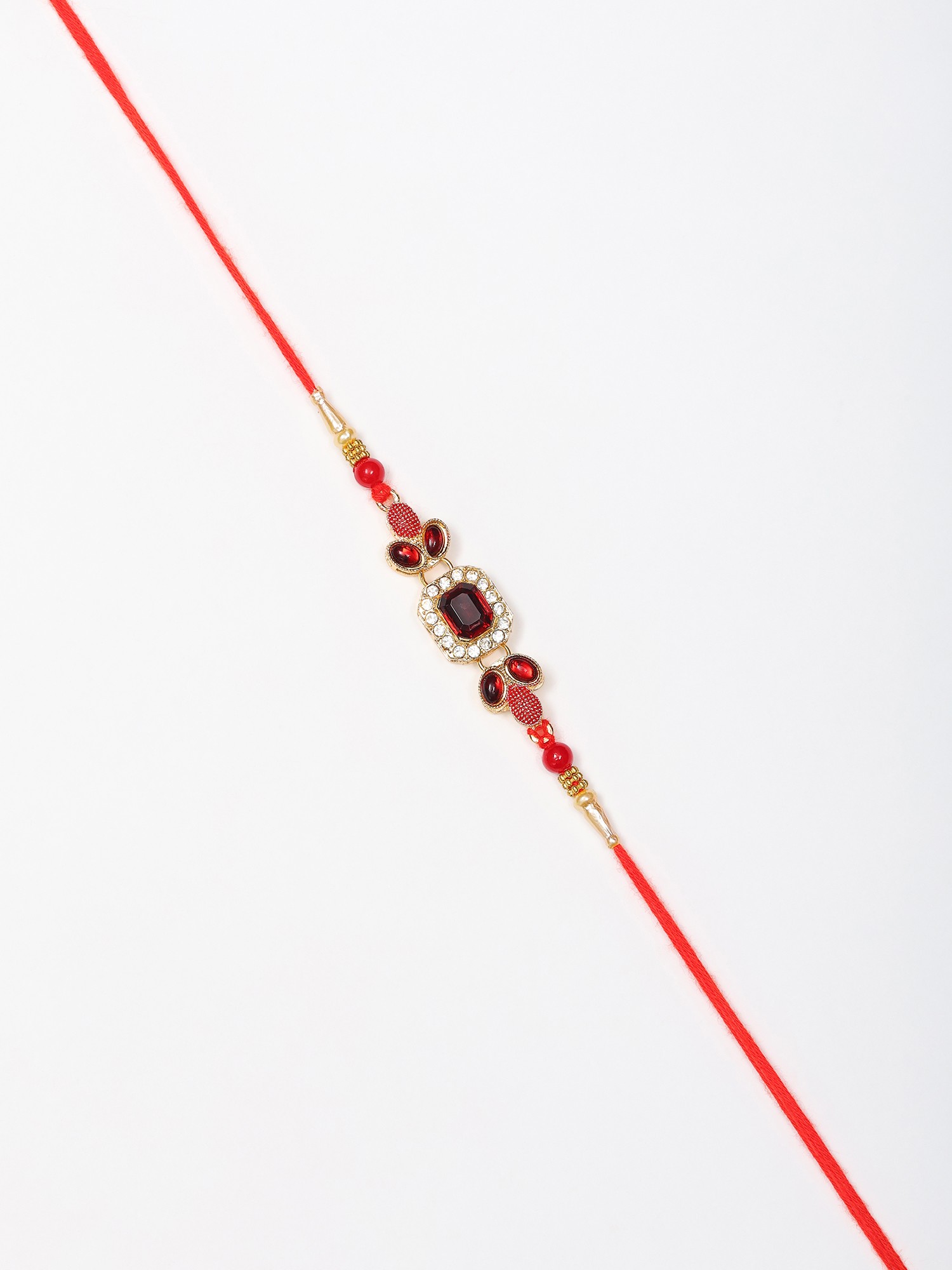 Adorned with meticulously placed stones, this Rakhi captures attention with its vibrant and radiant design. The central studded stone creates a focal point, exuding an air of sophistication and charm. Intricate metalwork surrounds the stone, showcasing an array of stunning details. The Rakhi is connected by a traditional Mauli thread, symbolizing protection and auspiciousness. The thread, with its traditional red hue, adds a cultural and spiritual touch to the piece, making it a truly special token of your affection.