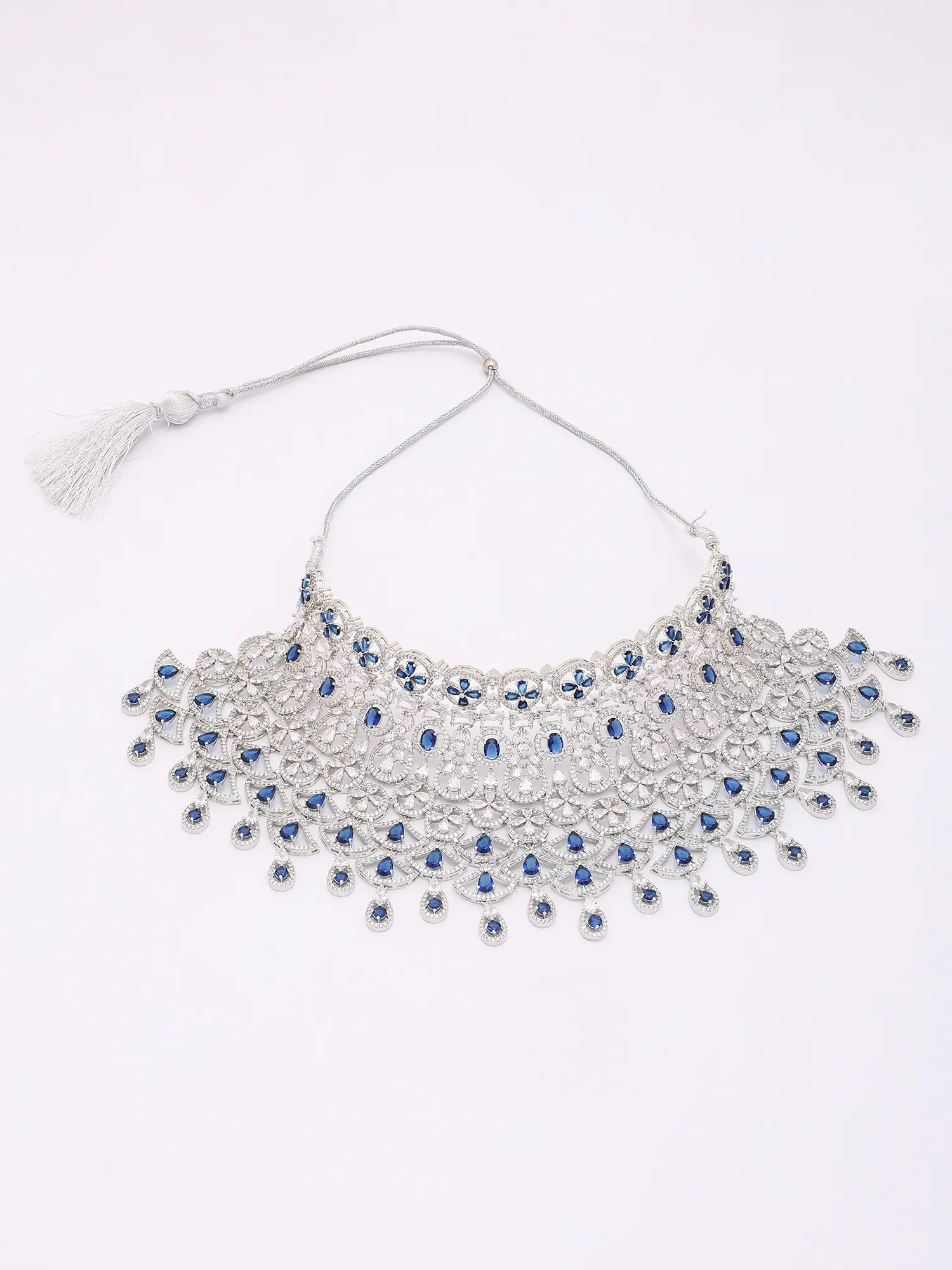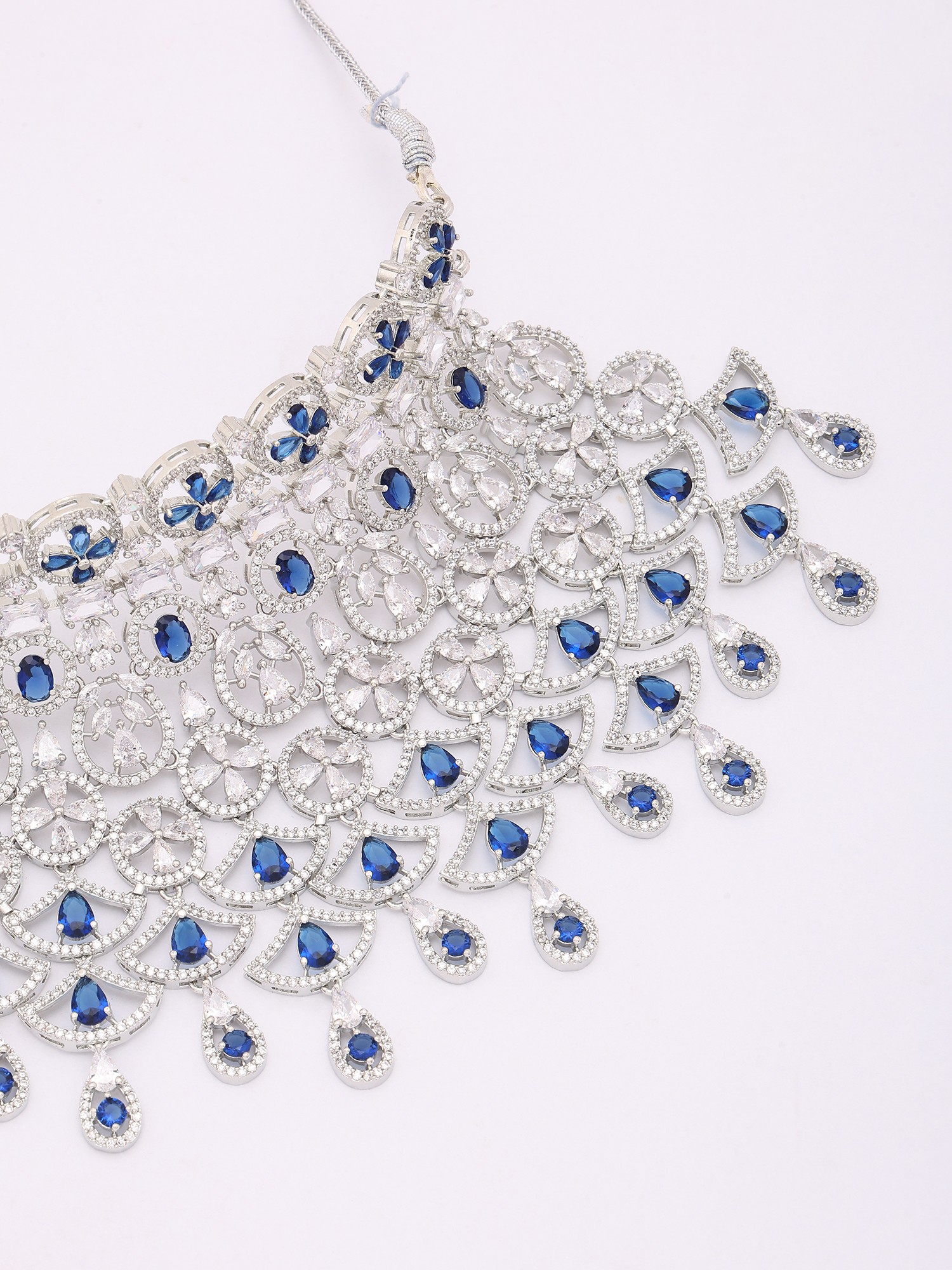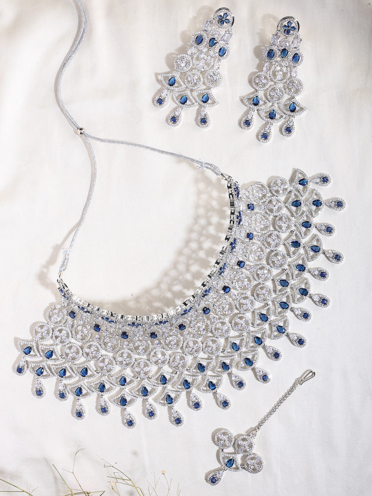 Royal Blue American Diamond Bridal Necklace Set with Maang Tikka