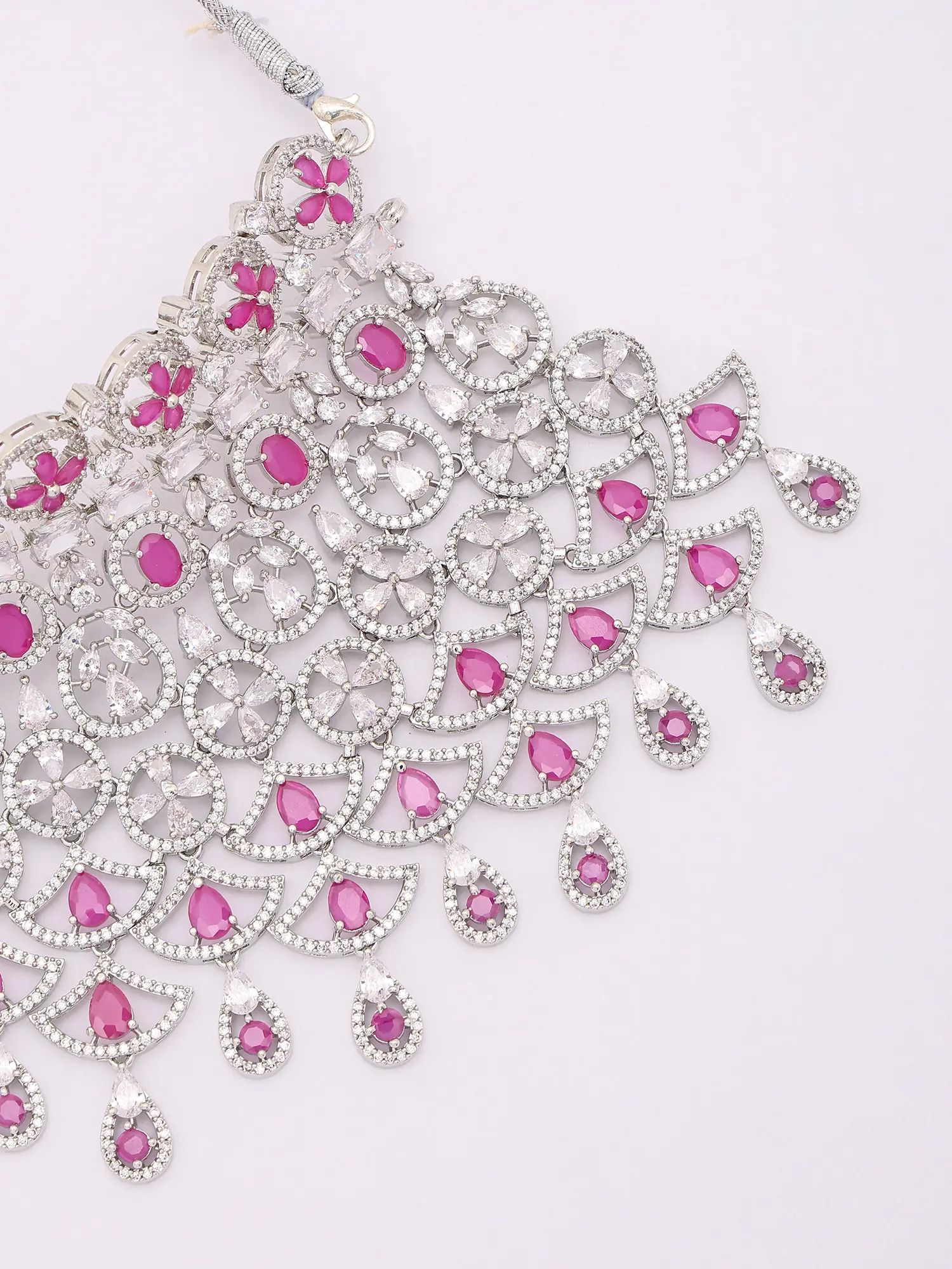 Features a dazzling necklace set adorned with sparkling American diamonds and vibrant ruby-colored stones.