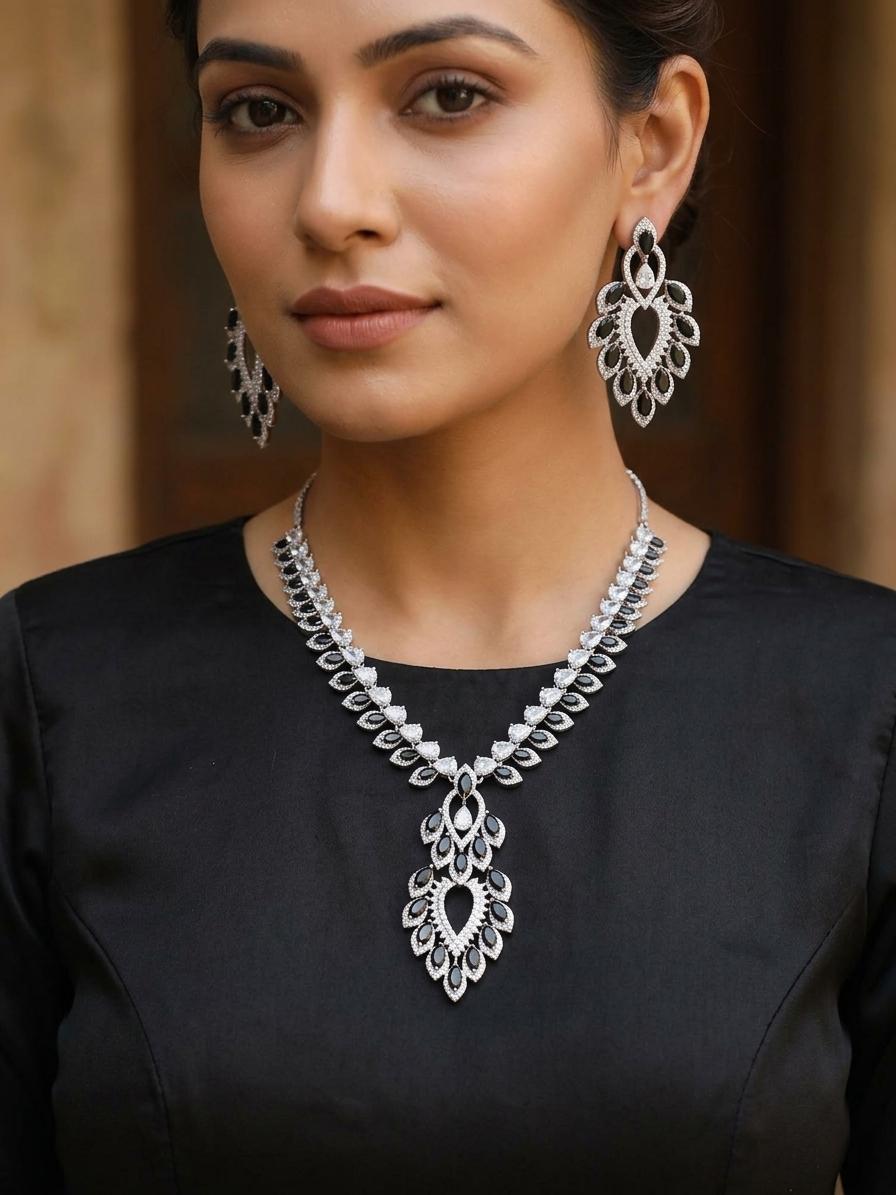 Adorn yourself with this exquisite necklace and earring set, designed to capture the light and turn heads. The intricate floral and leaf design, carefully studded with shimmering stones, creates a look that is both sophisticated and contemporary. This set is perfect for adding a touch of glamour to any outfit, whether you're dressing up for a special occasion or simply want to elevate your everyday style. This timeless set is a perfect gift for yourself or a loved one, promising lasting beauty and impeccable style.