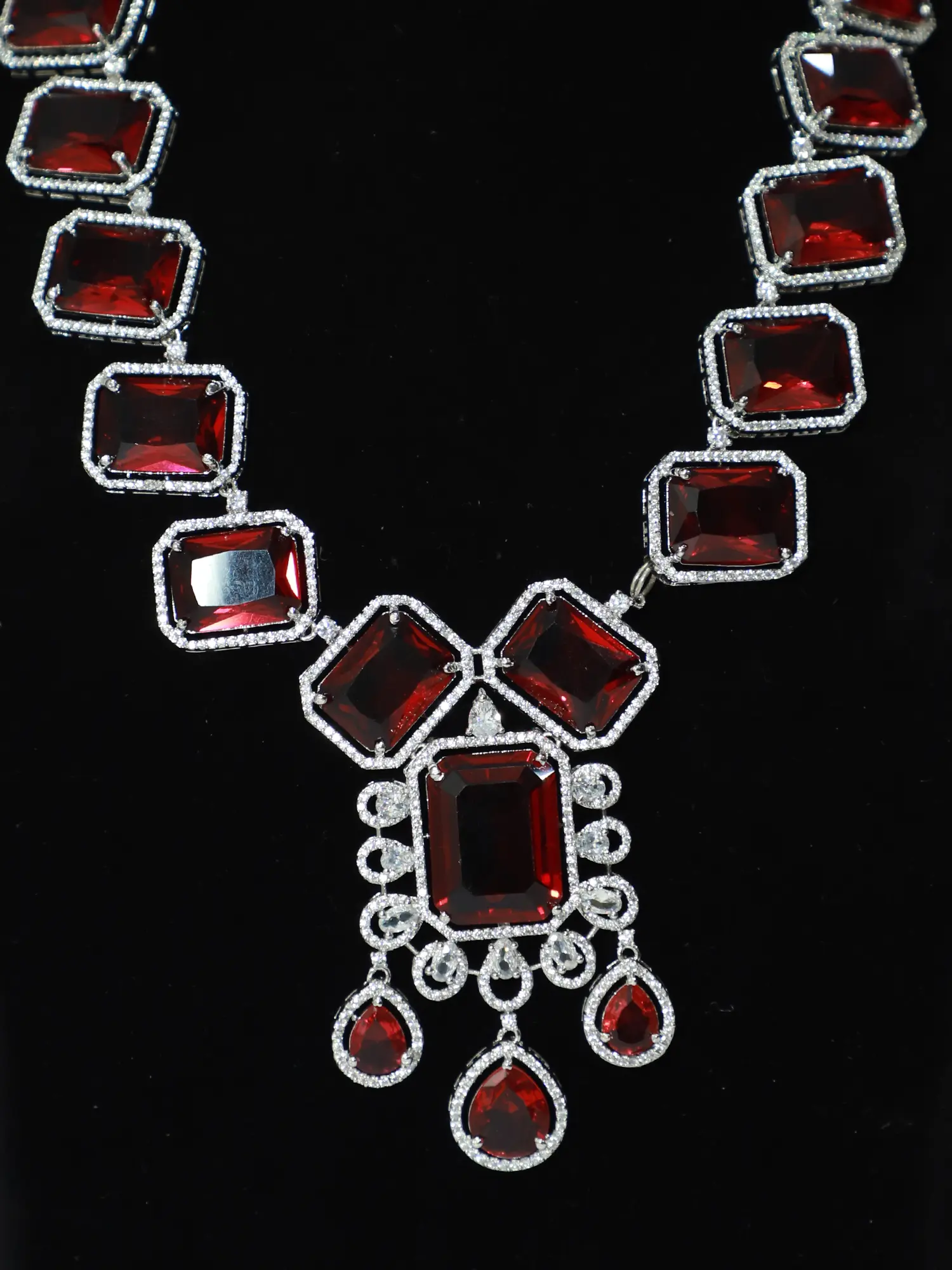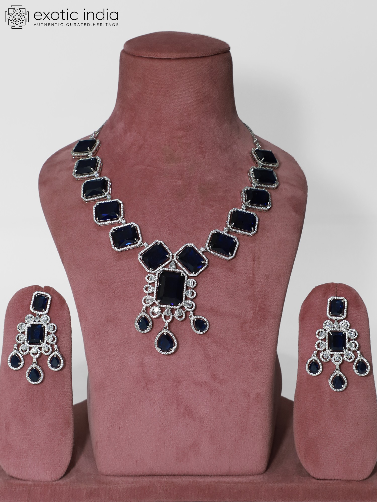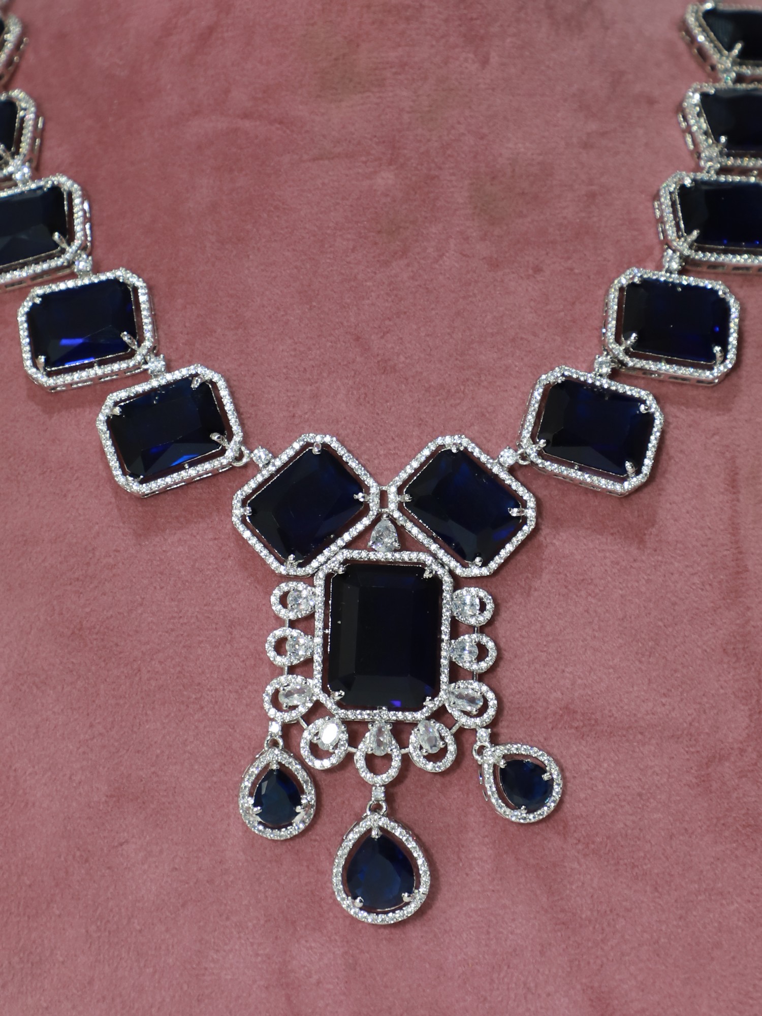Indulge in the allure of this exquisite necklace and earrings set, meticulously crafted to capture attention and elevate your style. Each piece showcases a sophisticated silver-tone finish, lending a touch of timeless glamour. The intricate design is enhanced by the brilliance of sparkling American Diamonds, creating a dazzling effect that will leave you feeling radiant. This set is ideal for special occasions, formal events, or even to add a touch of luxury to your everyday look.