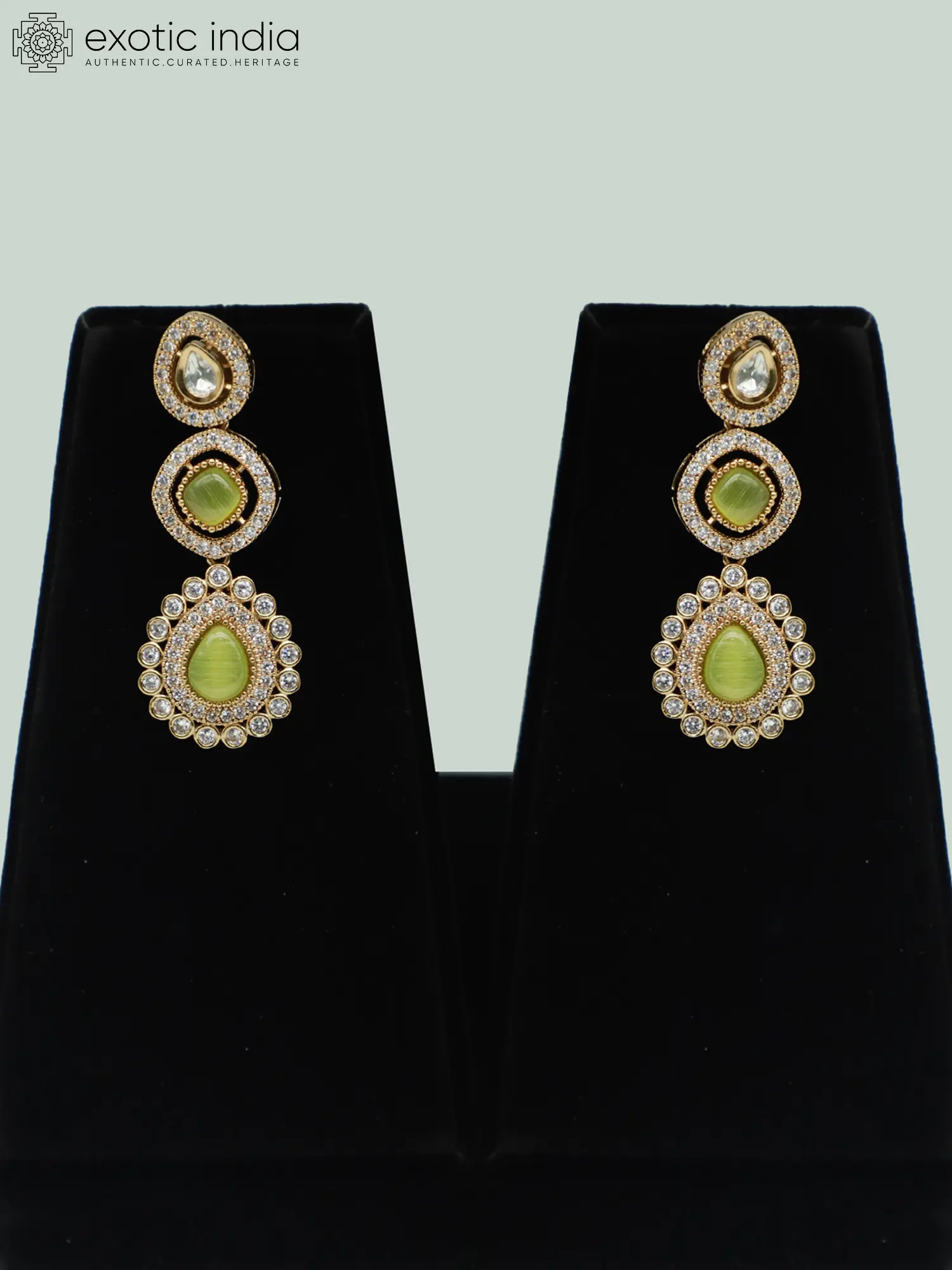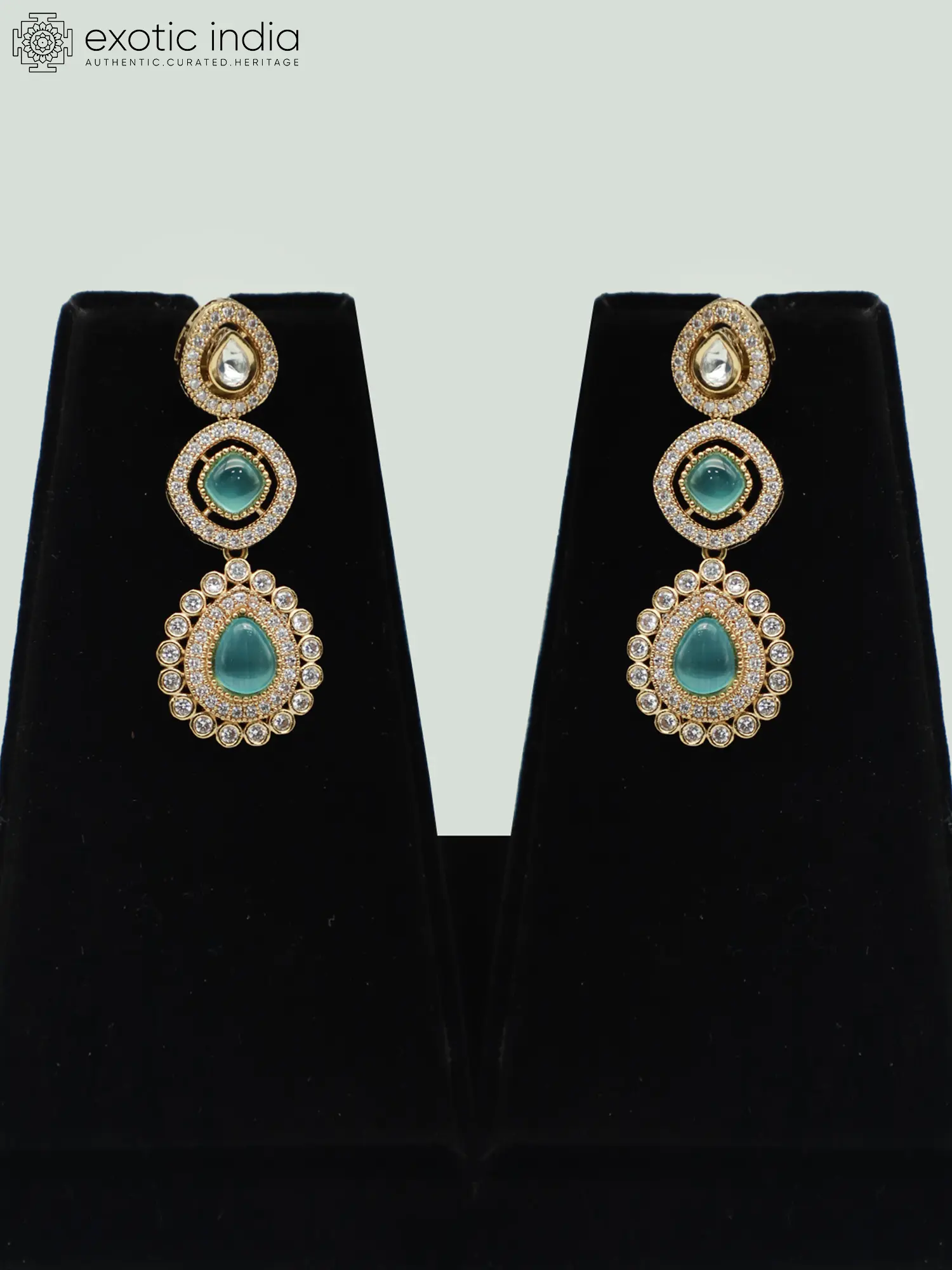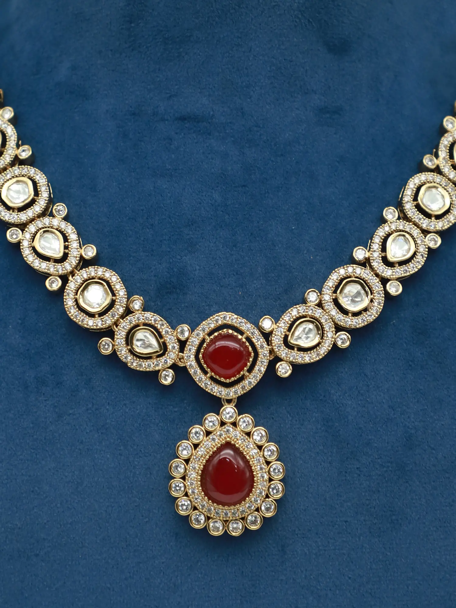 This jewelry set is made from brass. The brass provides a durable and lustrous foundation for the design, ensuring longevity and radiance. The intricate stone settings are carefully placed to maximize sparkle and create a dazzling effect.
