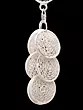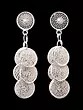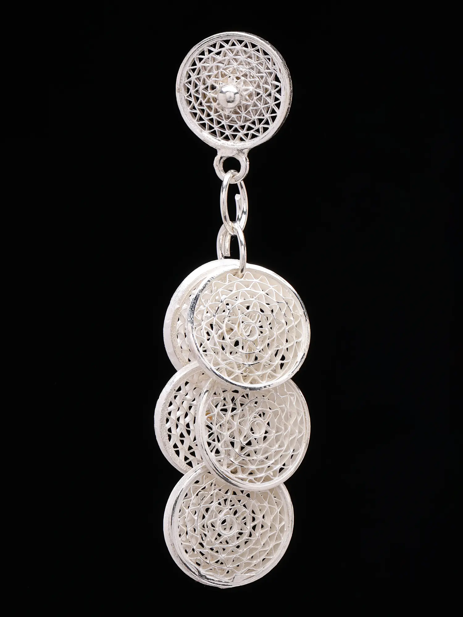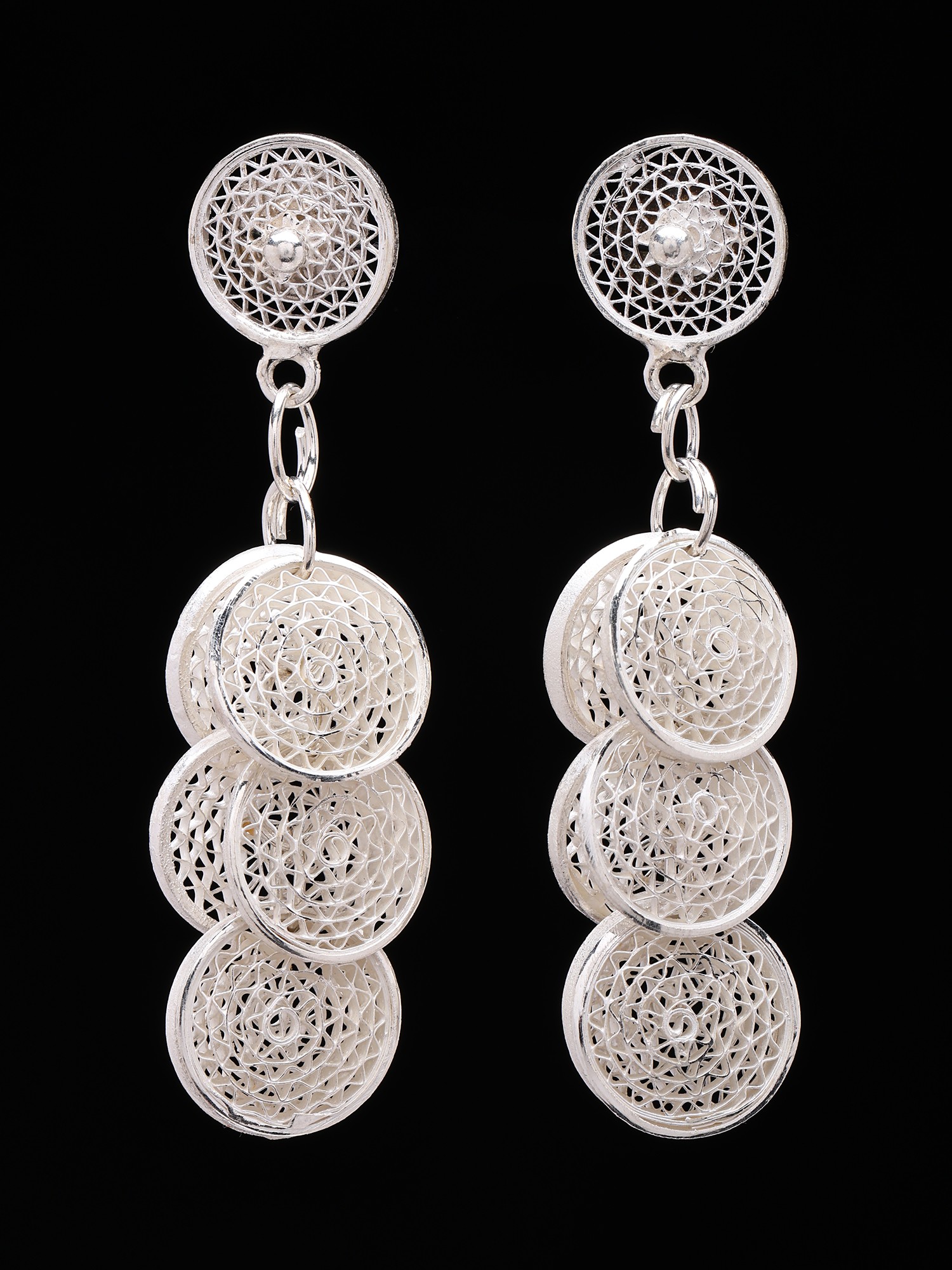 Observe the intricate circular motifs, reminiscent of celestial maps or miniature mandalas, that form the heart of their design. These openwork elements, measuring a mere 0.2 inches in width, allow light to pass through, creating a captivating play of transparency. Suspended beneath a delicate filigree stud, a cascade of three shimmering discs, each echoing the fine latticework above, adds graceful movement. With an overall height of 2.15 inches, they achieve a perfect balance, making a statement without overwhelming.