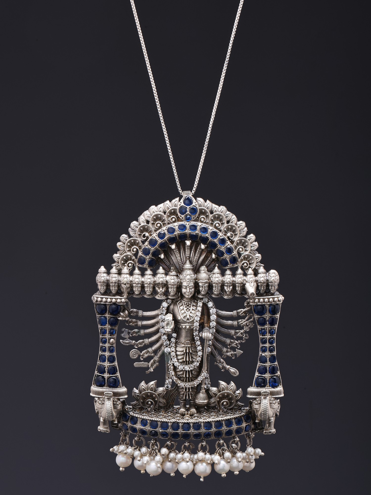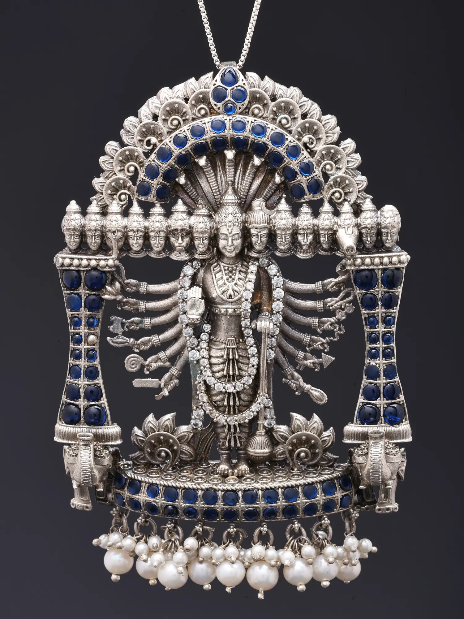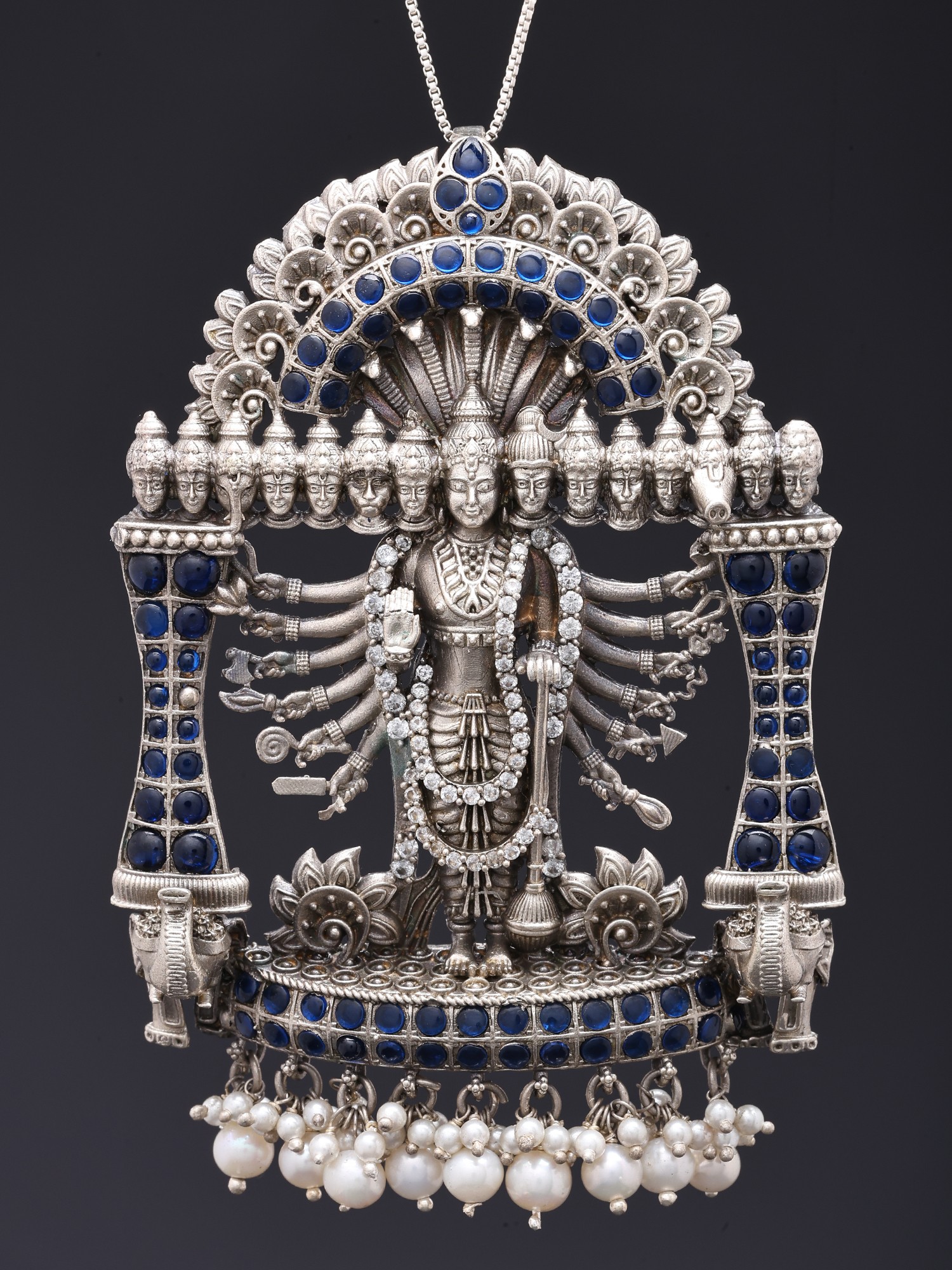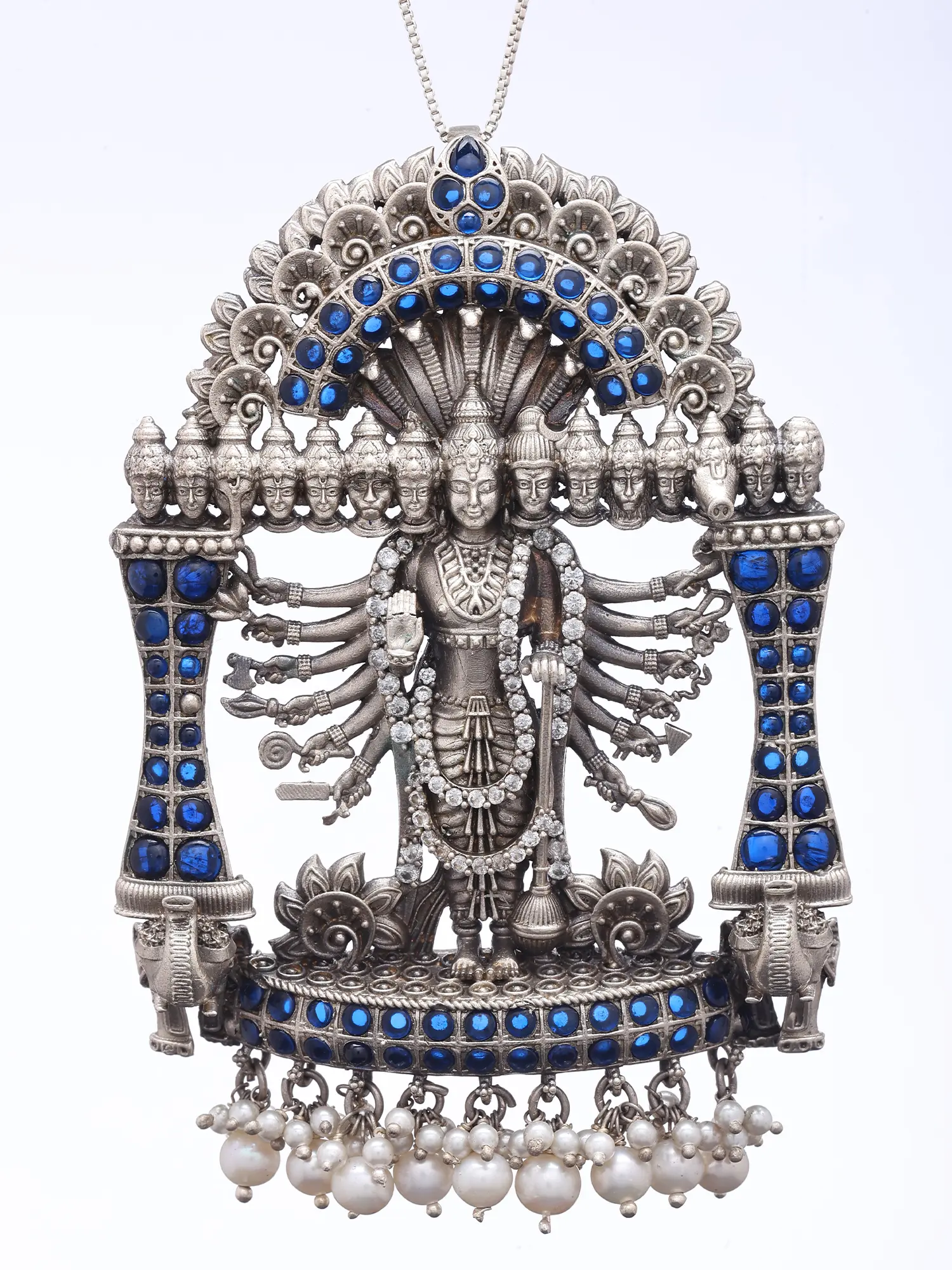 This magnificent pendant showcases the divine form of Lord Vishnu, depicted with his myriad arms, each holding symbolic weaponry or gestures. The surrounding arc, embellished with vibrant blue stones that capture the light with every movement, evokes the celestial realms from which the divine emanates. Delicate pearls cascade from the base, adding a touch of luminous grace.