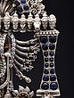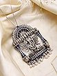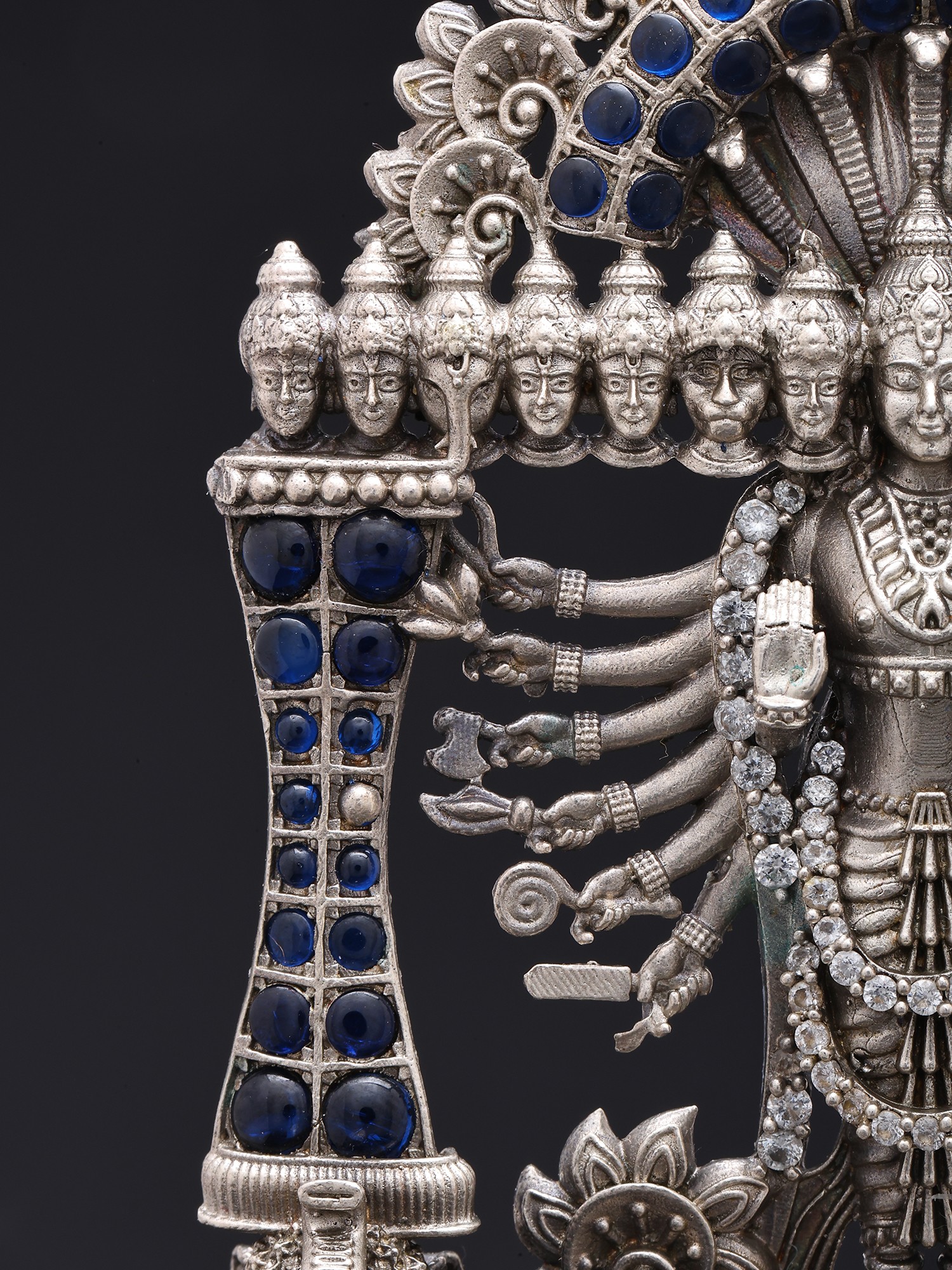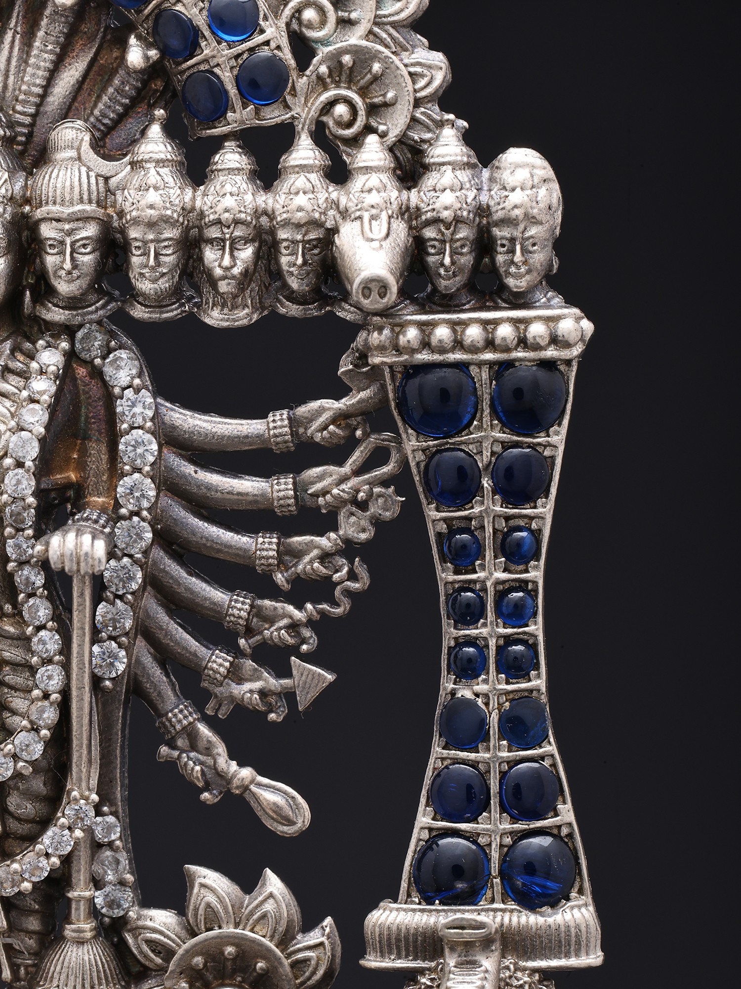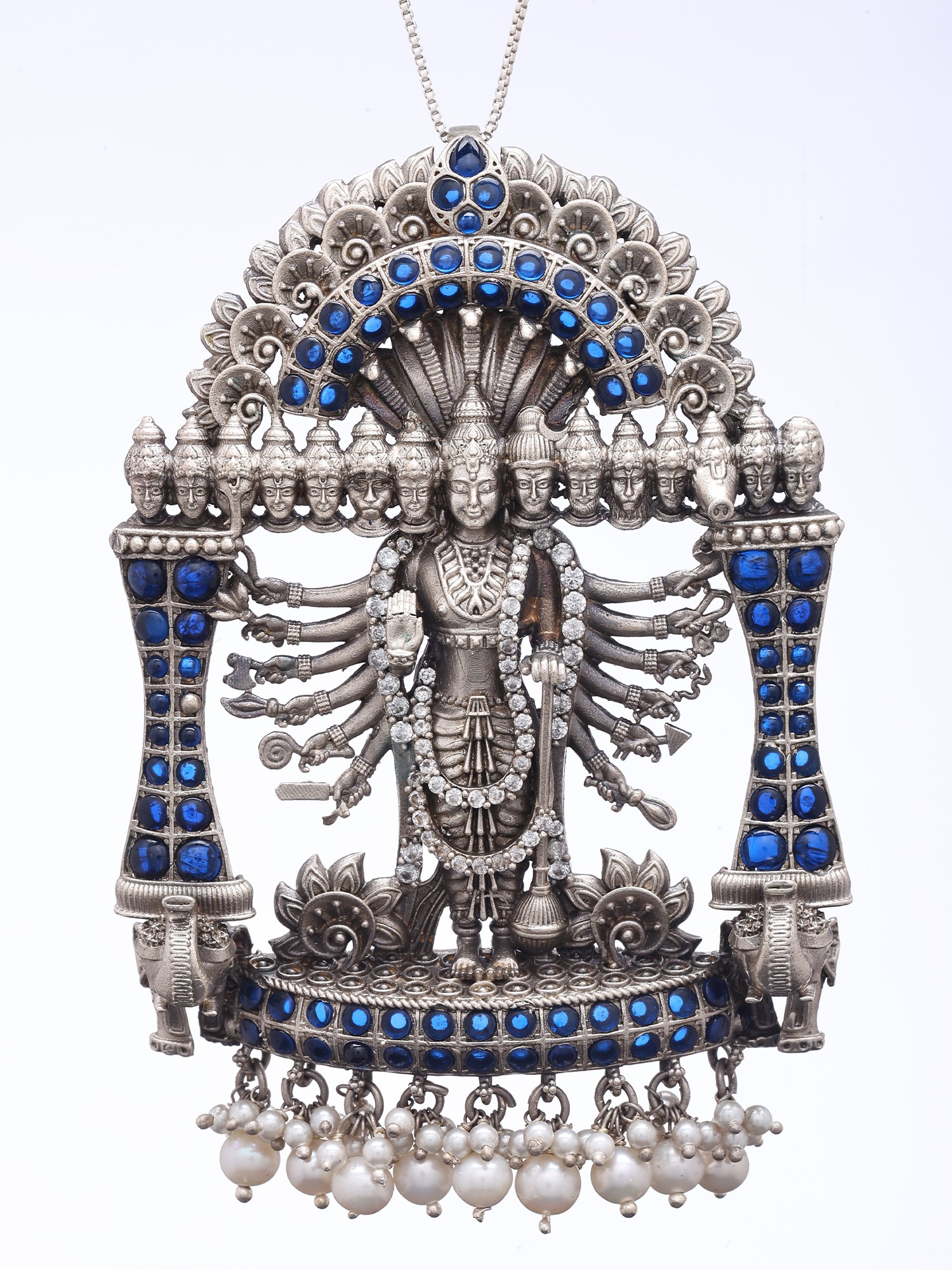 This magnificent pendant showcases the divine form of Lord Vishnu, depicted with his myriad arms, each holding symbolic weaponry or gestures. The surrounding arc, embellished with vibrant blue stones that capture the light with every movement, evokes the celestial realms from which the divine emanates. Delicate pearls cascade from the base, adding a touch of luminous grace.