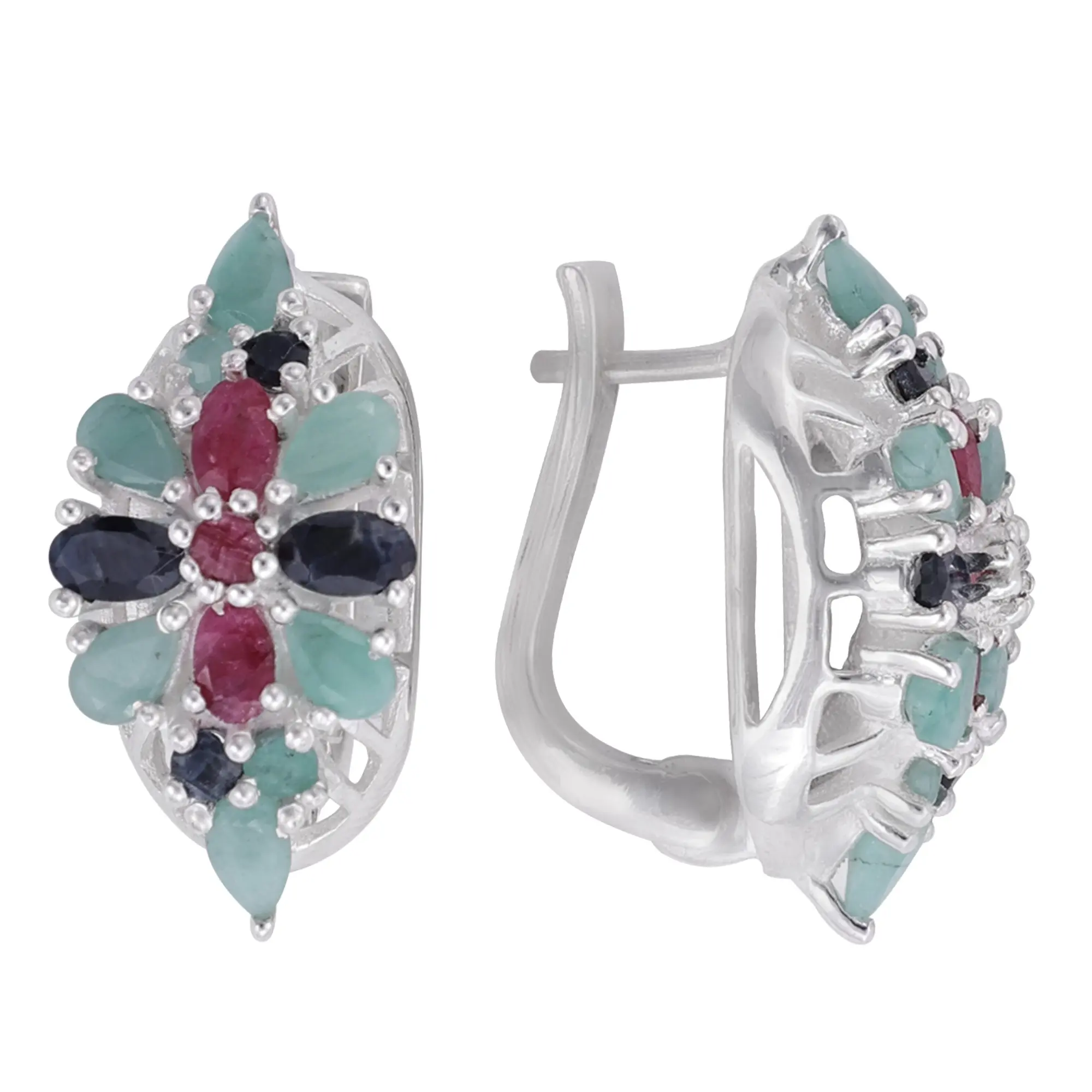 These stunning earrings are a testament to the artistry of fine jewelry making. Crafted from gleaming sterling silver, they feature a captivating arrangement of vibrant gemstones, creating a piece that is both elegant and eye-catching. The meticulous detail in the design is evident in the intricate silver framework that gracefully cradles each gemstone, allowing their brilliance to shine. These earrings are a perfect blend of classic design and modern sophistication, making them a timeless addition to any jewelry collection. The vibrant hues of the rubies, emeralds, and sapphires create a dynamic display of color that will effortlessly complement any outfit. Whether you're dressing up for a special occasion or adding a touch of sparkle to your everyday look, these earrings are sure to make a statement.