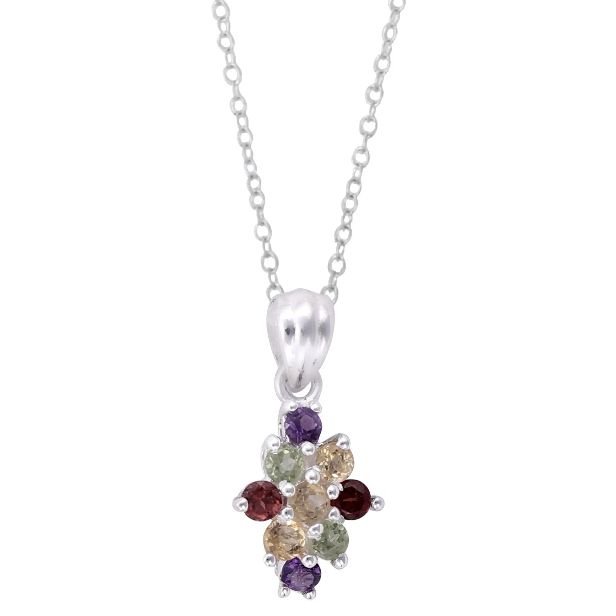This pendant is crafted from high-quality sterling silver, known for its durability and lustrous shine. The sterling silver complements the vibrant gemstones beautifully, allowing their natural beauty to shine through. The use of sterling silver ensures that your pendant will maintain its brilliance and elegance for many years, resisting tarnishing and wear. Its polished finish adds to the overall refinement and sophistication of the piece. The delicate yet strong construction ensures its longevity.