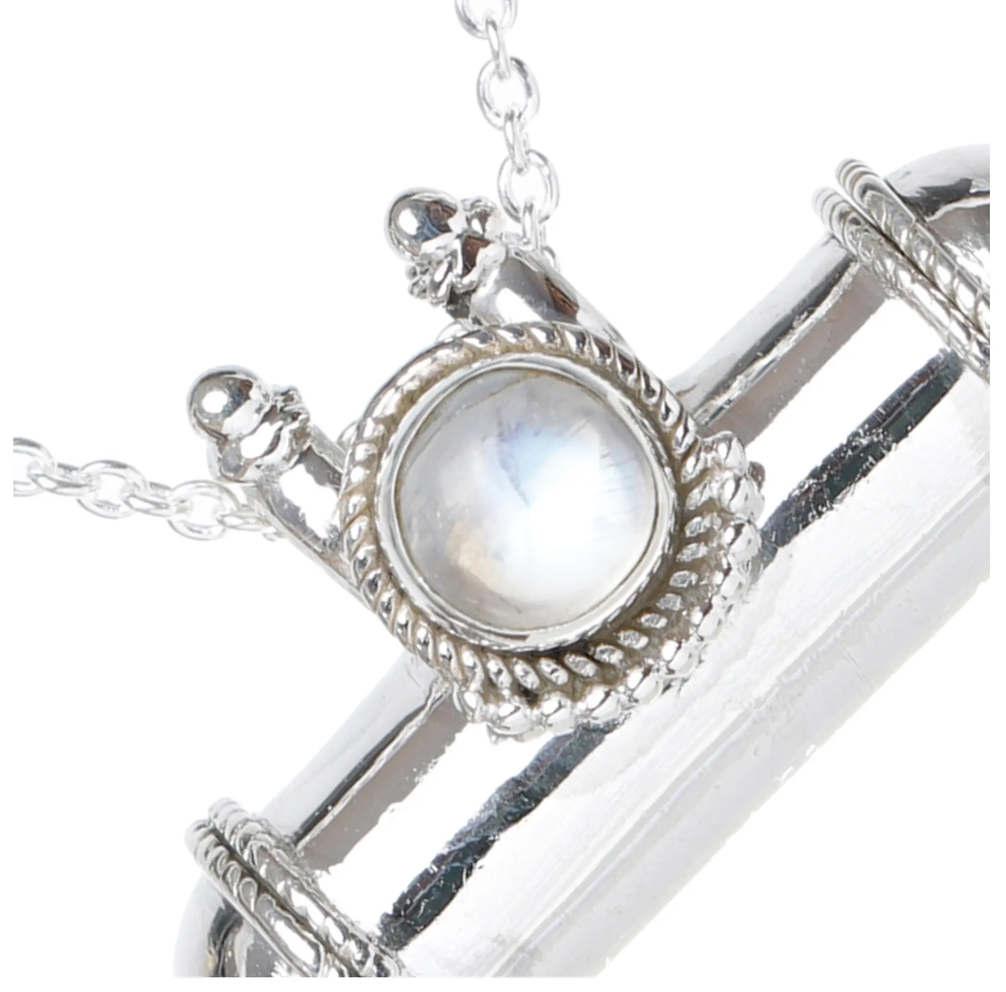 The sterling silver setting of this pendant is a testament to meticulous craftsmanship. The tabiz itself is a hollow, cylindrical chamber, elegantly capped at both ends with smooth, rounded terminals, each accented with a subtle, decorative knob. The central moonstone is securely held within a bail that showcases a classic rope-like texture, adding a touch of vintage charm and visual interest. This intricate detailing not only enhances the aesthetic appeal but also speaks to the quality and care invested in its creation. The pendant is designed to hang gracefully, allowing the rainbow moonstone to catch the light and reveal its full spectrum of beauty.