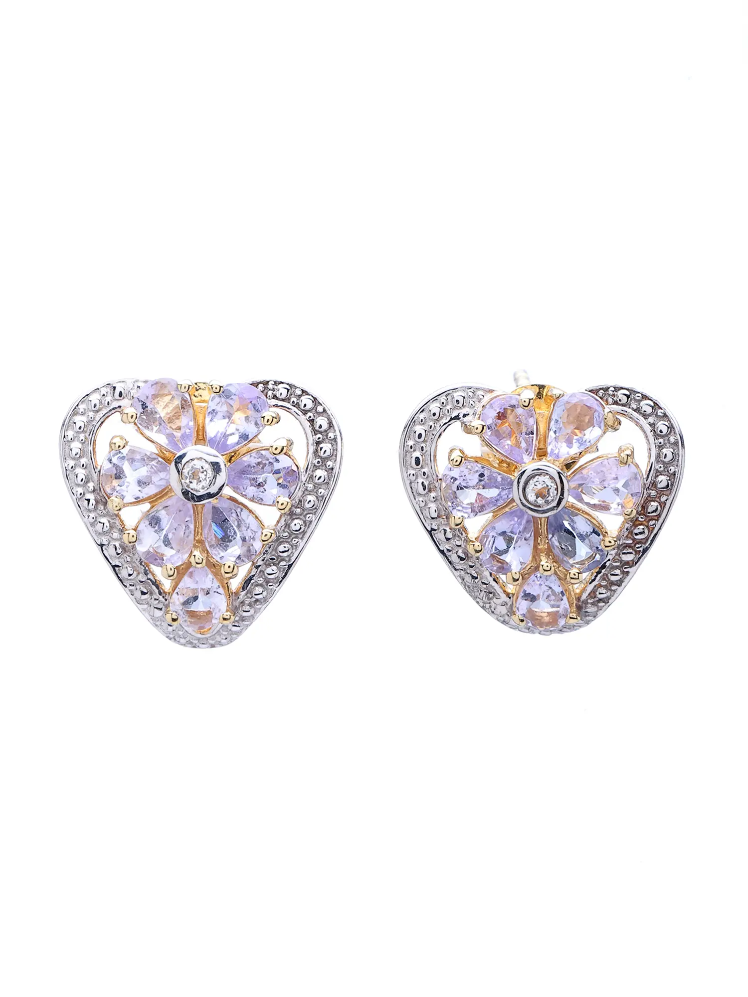 Adorn yourself with the enchanting allure of these heart-shaped stud earrings, each a miniature garden of sparkling gemstones. Designed to capture the essence of natural beauty, these earrings feature a captivating floral cluster at their center, radiating delicate charm and sophisticated elegance. The soft, ethereal hue of the tanzanite stones evokes a sense of serene beauty, reminiscent of a twilight sky or the gentle blush of dawn. Each teardrop-shaped tanzanite is meticulously arranged to form a graceful bloom, drawing the eye with its subtle yet mesmerizing color.