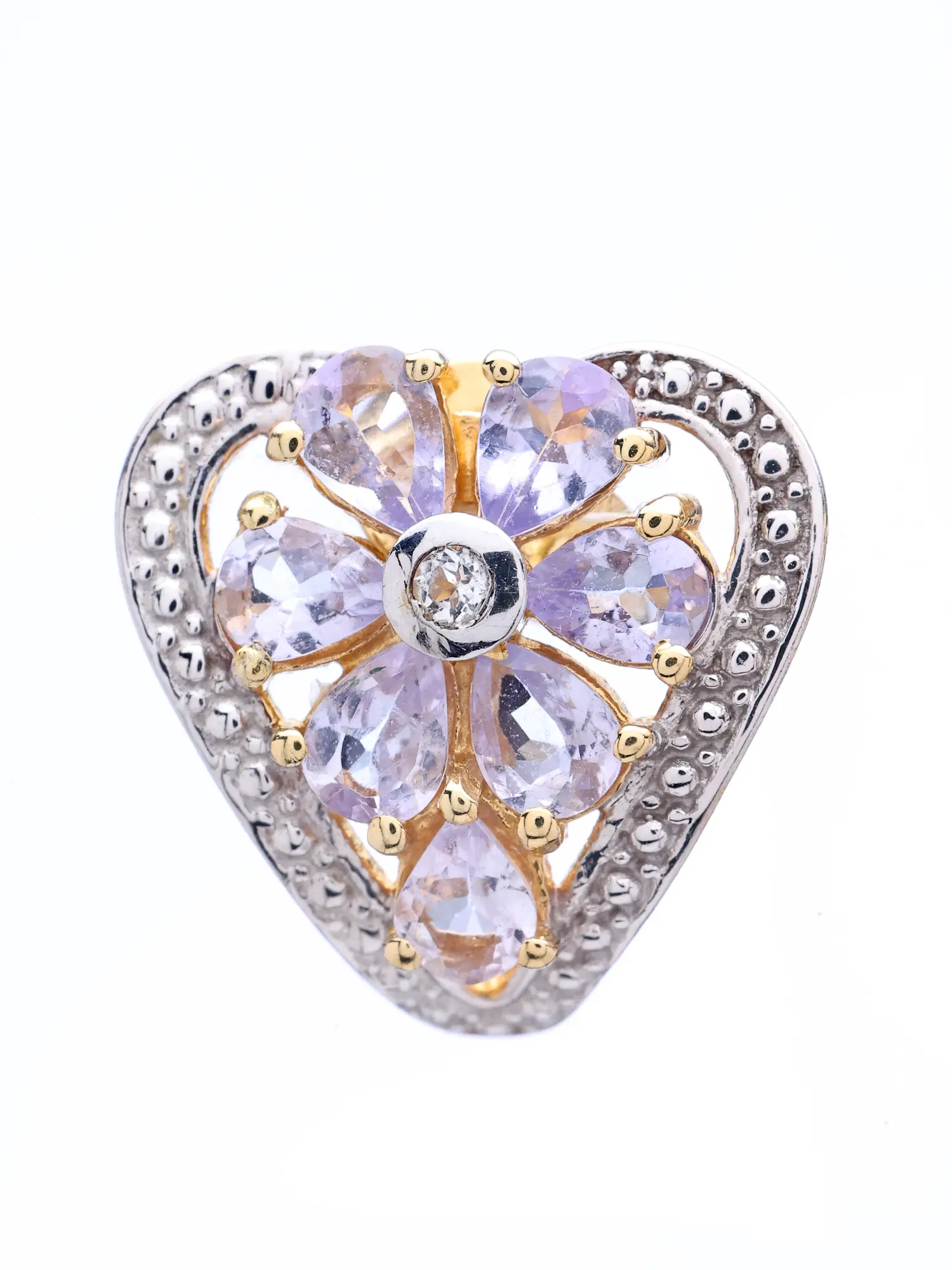 These earrings are expertly crafted from high-quality sterling silver, offering a durable and lustrous foundation for their intricate design. The brilliance of the silver is enhanced by a warm, complementary gold tone that accentuates the central floral motif, creating a striking two-tone effect. This interplay of metals adds depth and dimension, making each earring a truly unique piece of art. The heart-shaped outline of the earrings is further embellished with a subtle, textured detailing, reminiscent of dew drops on a petal, adding a touch of organic sophistication. The polished finish ensures these earrings will catch the light with every movement, making them a dazzling addition to any ensemble.