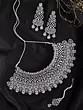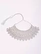 The necklace, with its adjustable dori, drapes gracefully, measuring 3.05 inches in height, allowing you to customize its fit for perfect comfort and style. Complementing this centerpiece, the striking earrings extend to 3.50 inches in height and 1.35 inches in width, featuring a cascade of geometric shapes and teardrop accents. The accompanying maang tikka, a delicate 5.50-inch length, adds a final touch of regal charm, designed to draw the eye with its exquisite symmetry.