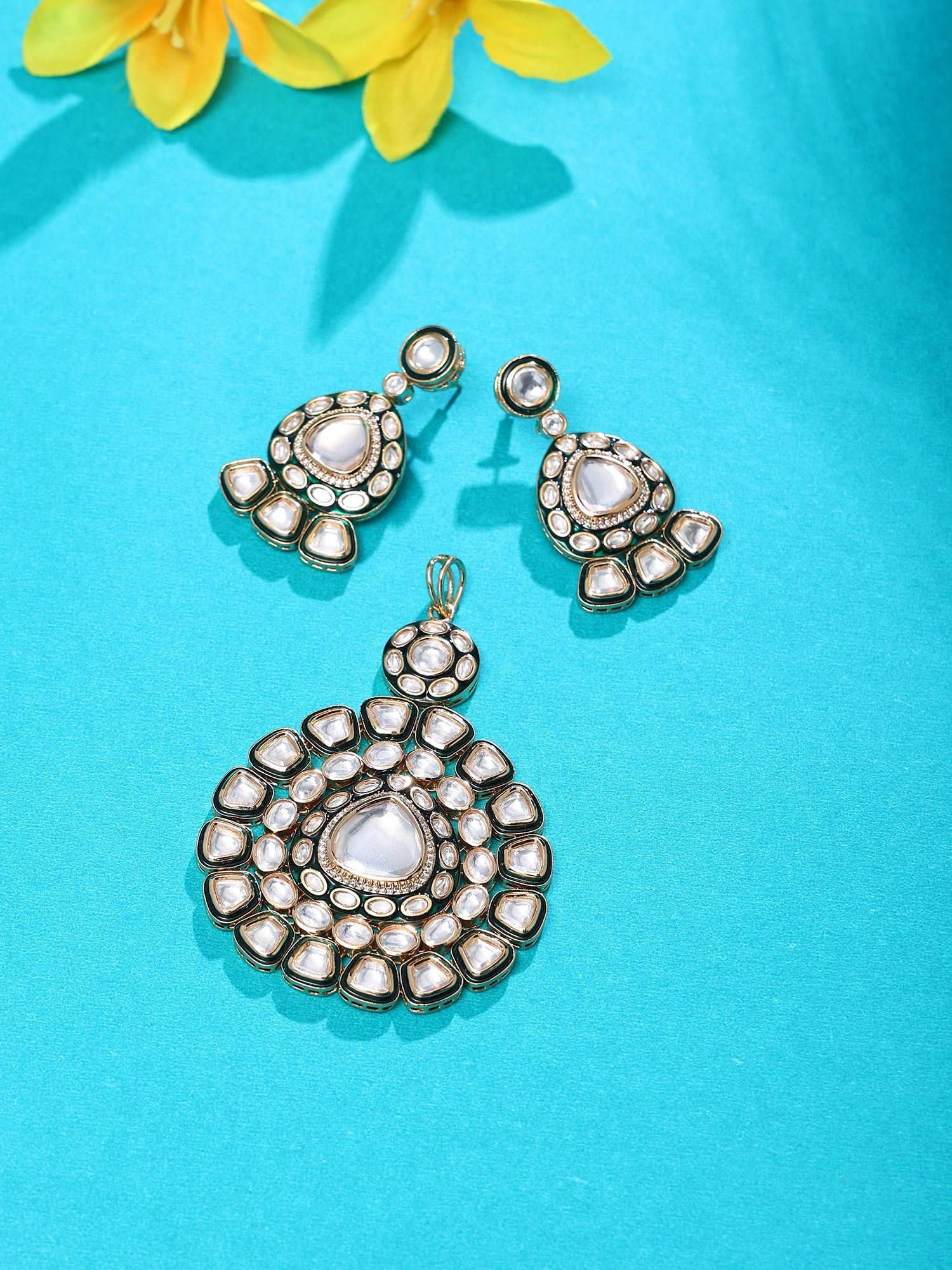 Mandala-Inspired Polki Studded Lacquer Pendant and Earring Set
