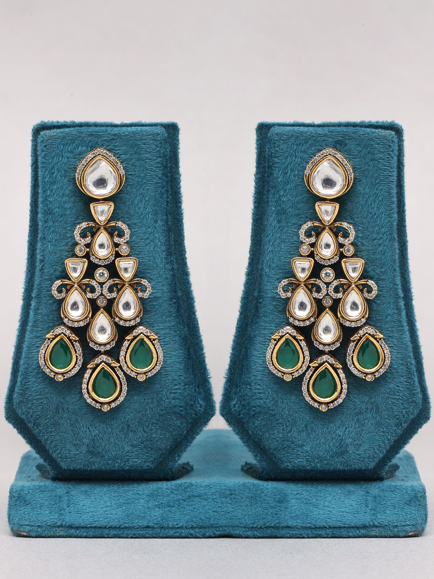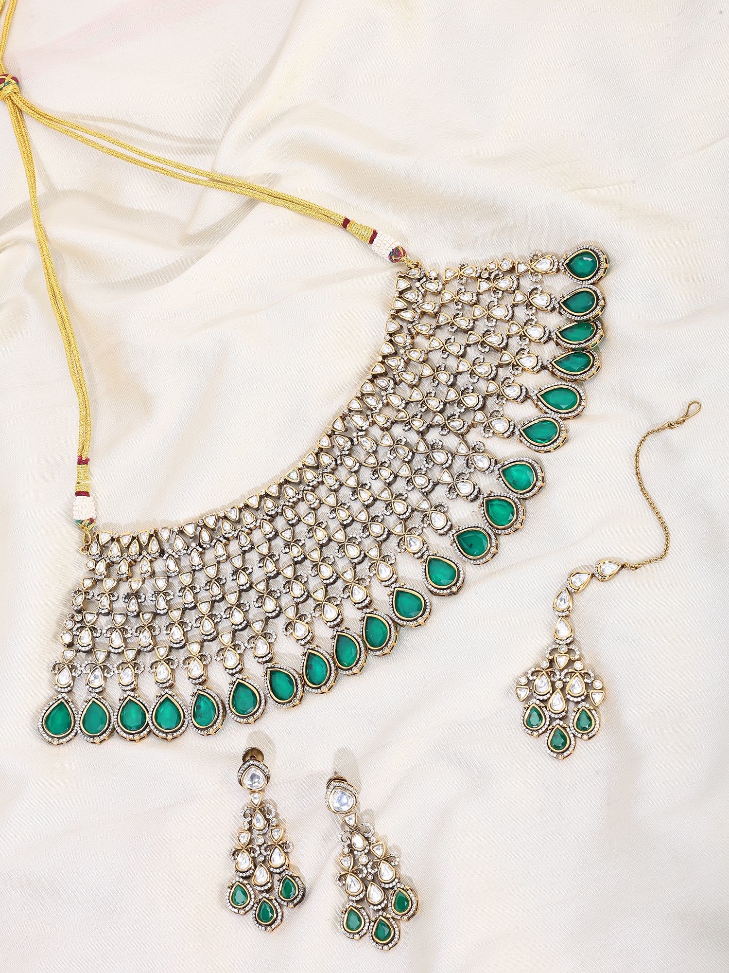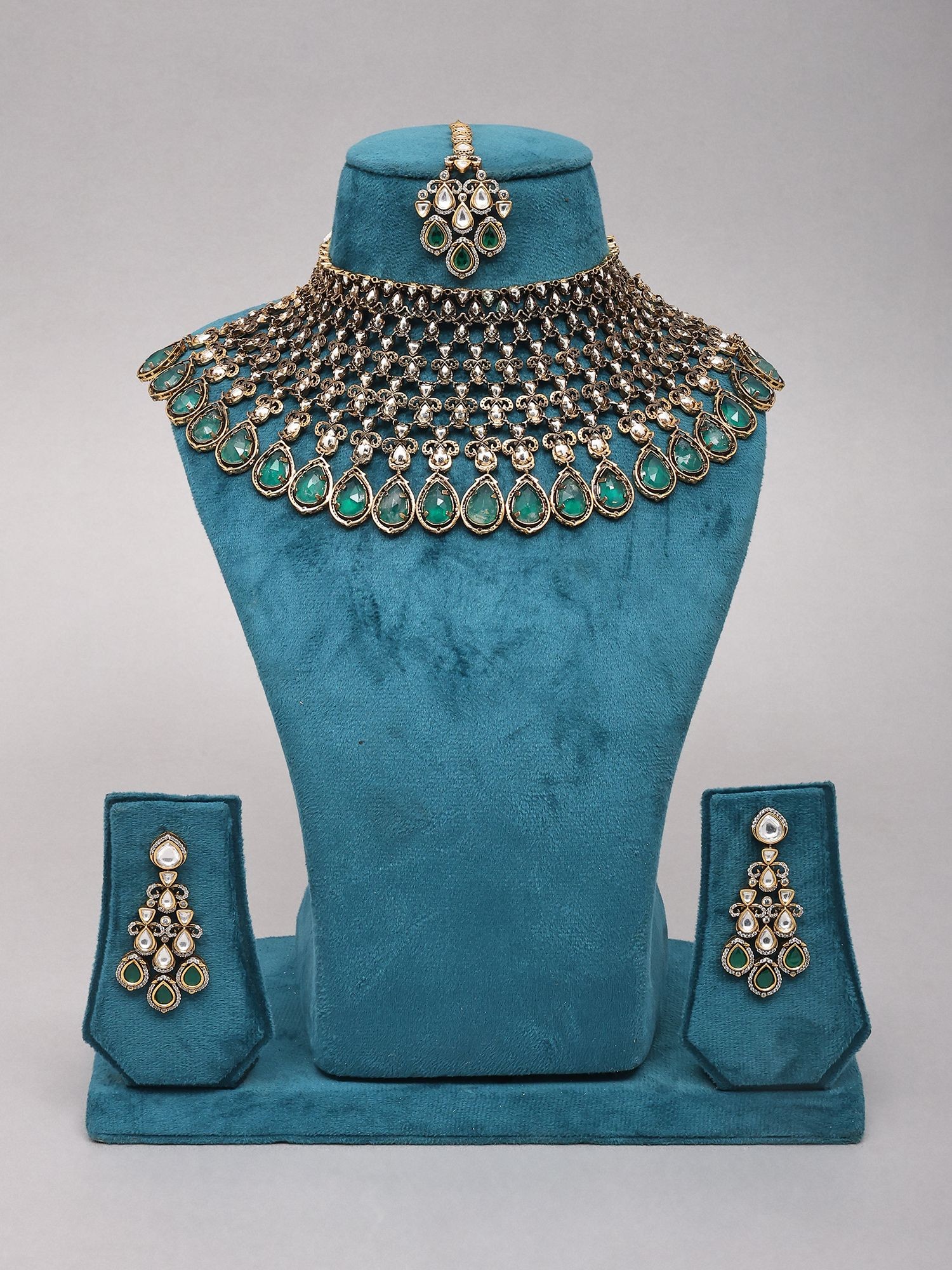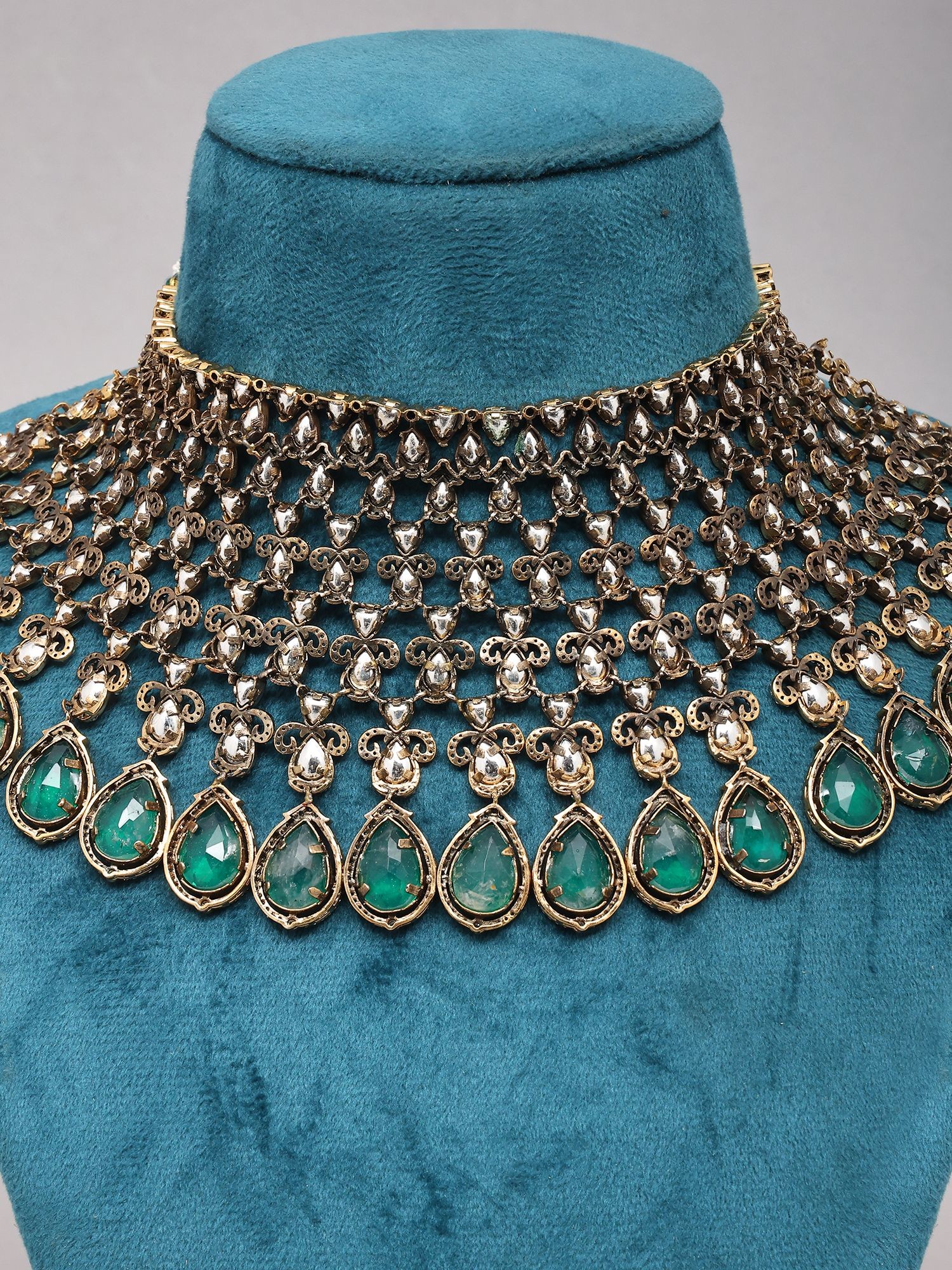 Features captivating teardrop-shaped emeralds set in intricate Kundan work.