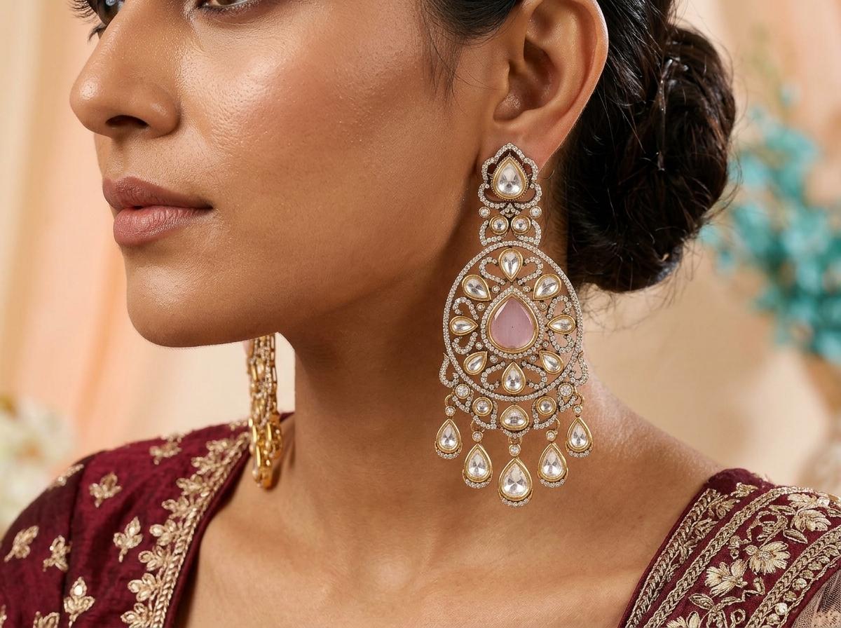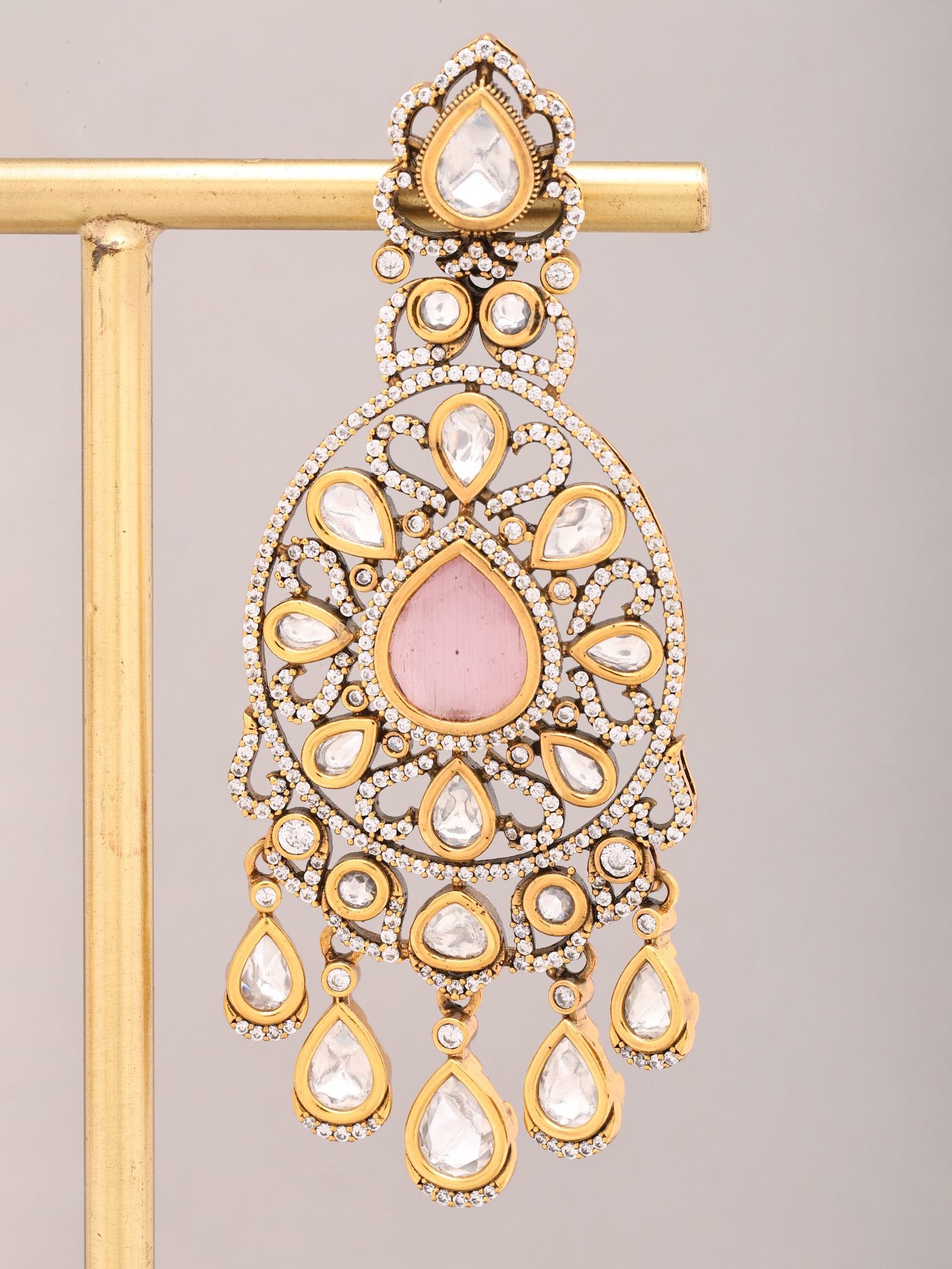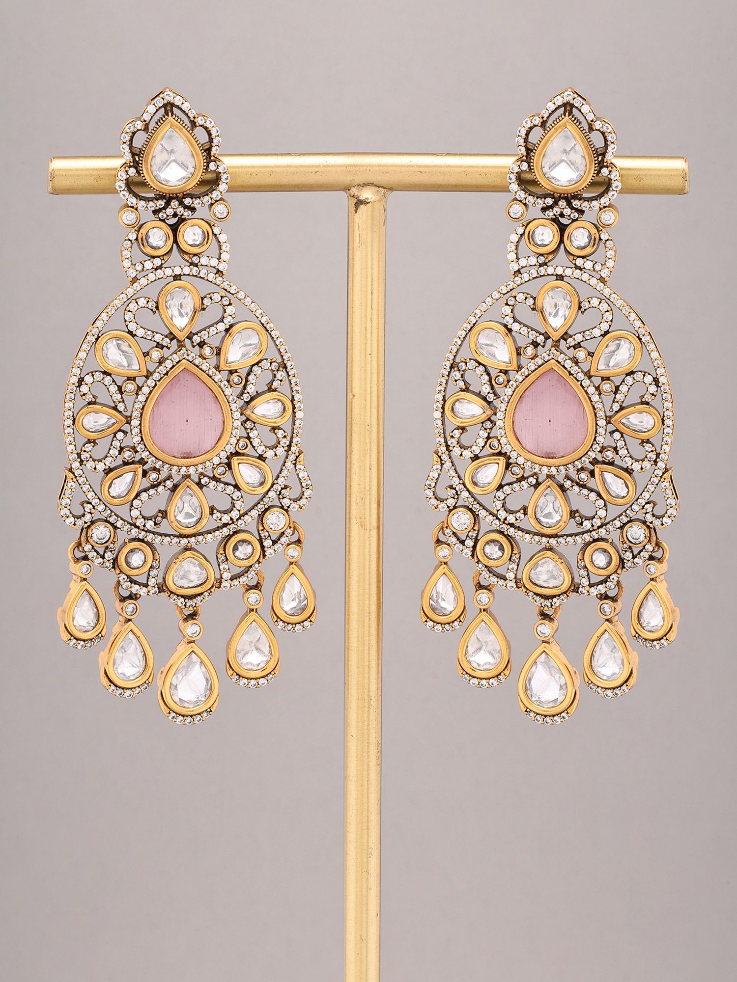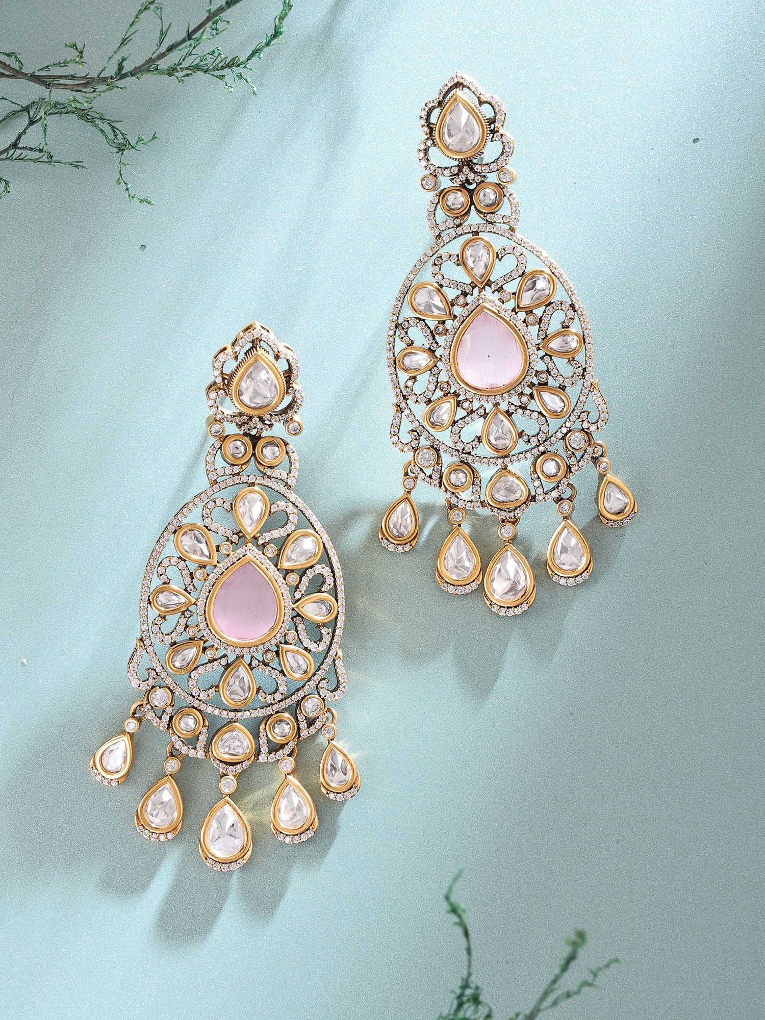 Teardrop Pink Stone Kundan Bridal Chandelier Earrings