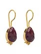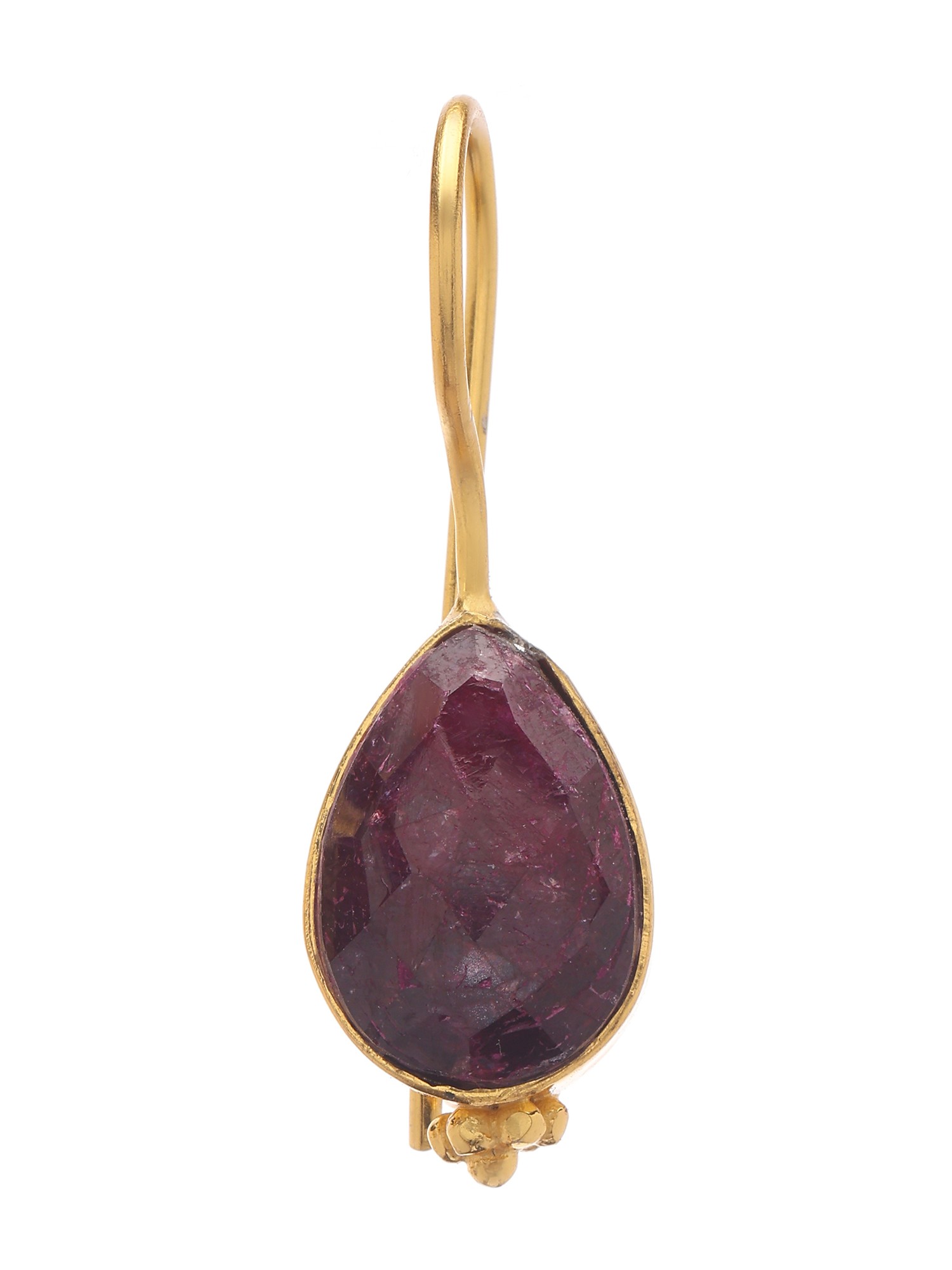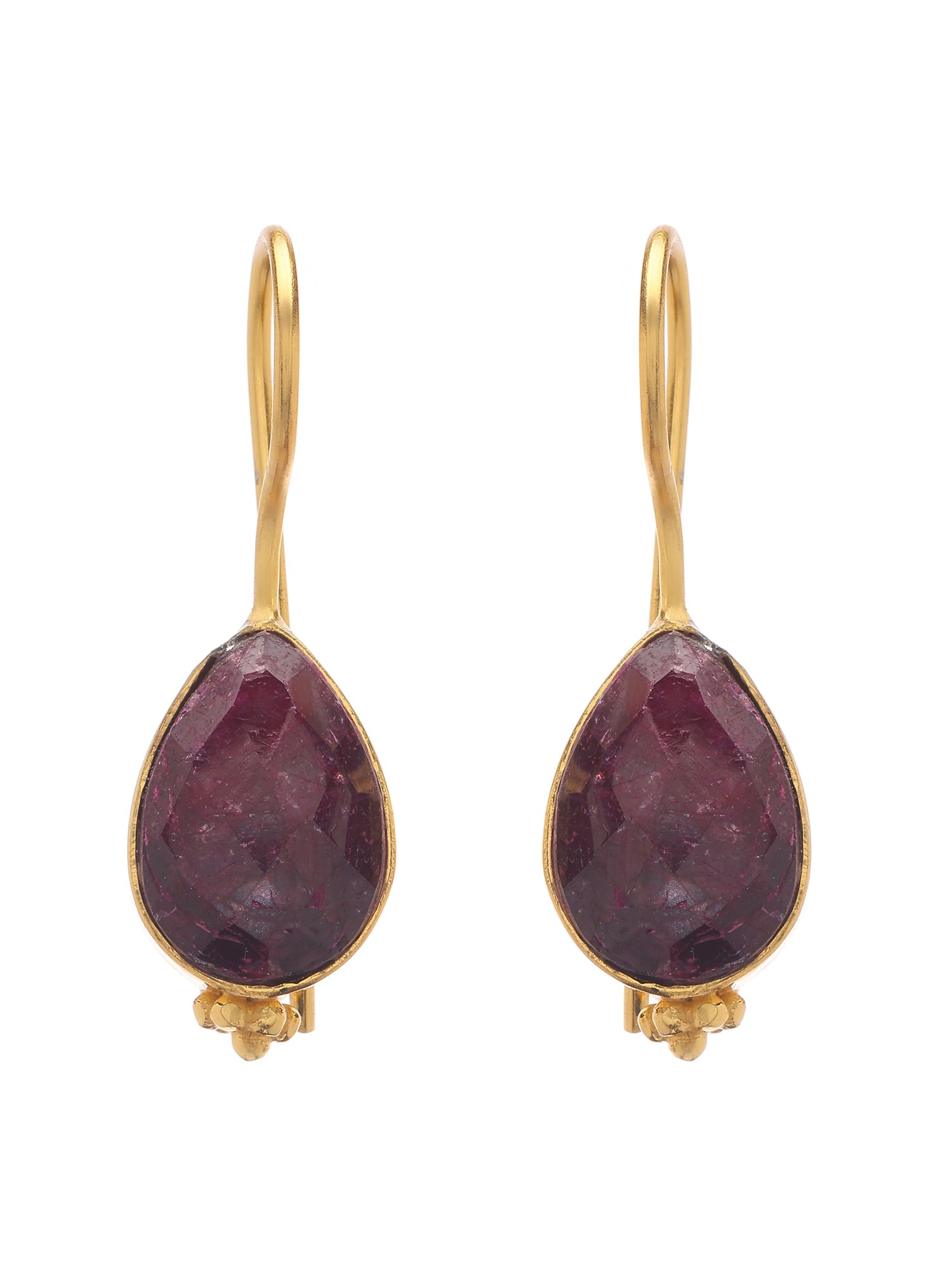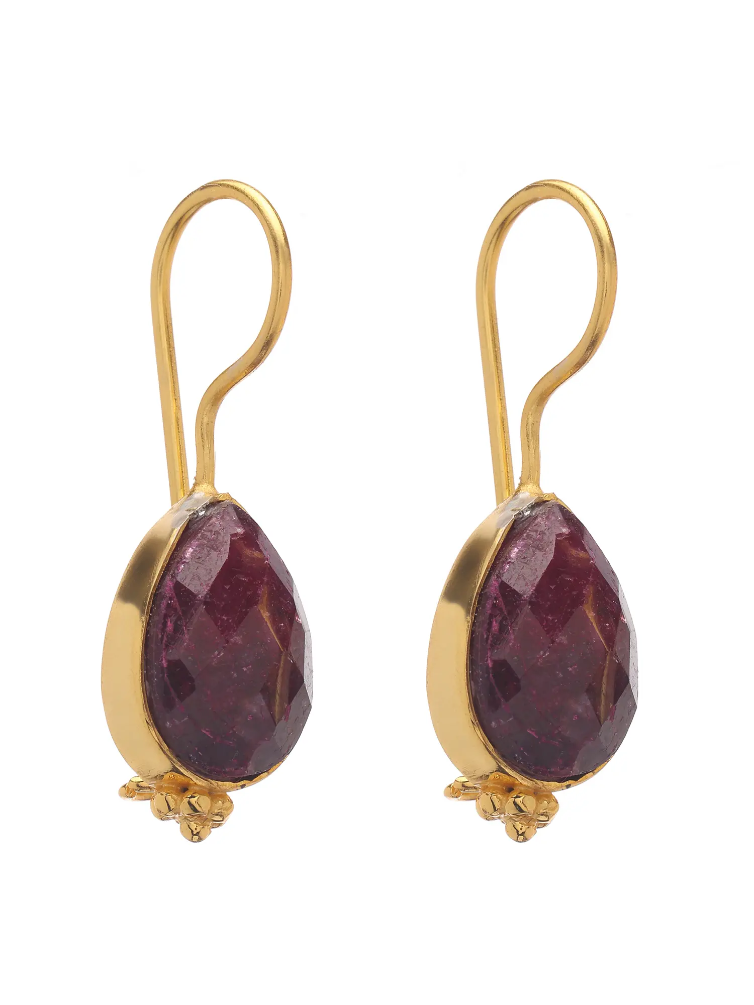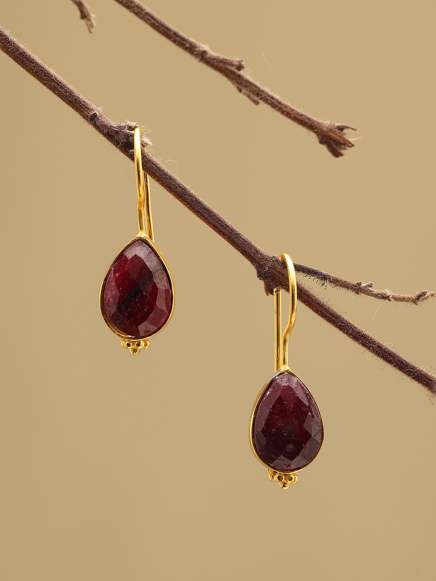 These earrings are expertly crafted from sterling silver, providing a durable and high-quality base. A lustrous gold plating enhances the radiance, creating a beautiful contrast with the vibrant red stones. The stones are carefully faceted to maximize their brilliance, catching the light with every movement. The teardrop shape is not only elegant but also flattering, drawing the eye and elongating the neckline. The meticulous attention to detail is evident in the smooth finish and secure setting, ensuring lasting beauty and comfortable wear.