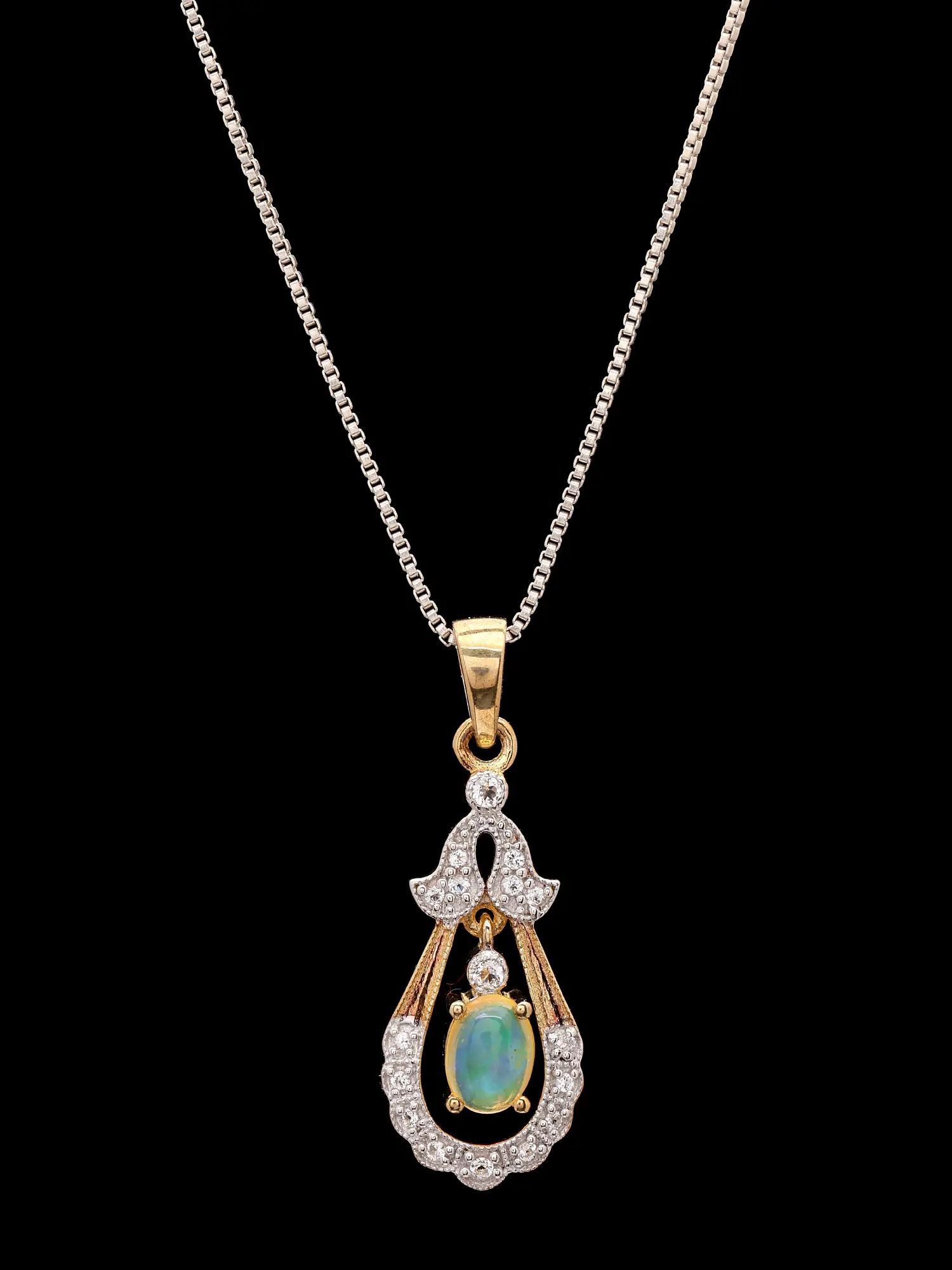 Discover a piece of wearable art that captures the ethereal beauty of nature. This exquisite pendant, designed with a graceful teardrop silhouette, is a testament to sophisticated craftsmanship and timeless elegance. The sterling silver frame, meticulously paved with shimmering stones, cradles a captivating oval opal at its heart. The opal, with its mesmerizing play of light and color, seems to hold the very essence of a moonlit sky, shifting and swirling with every subtle movement.