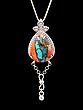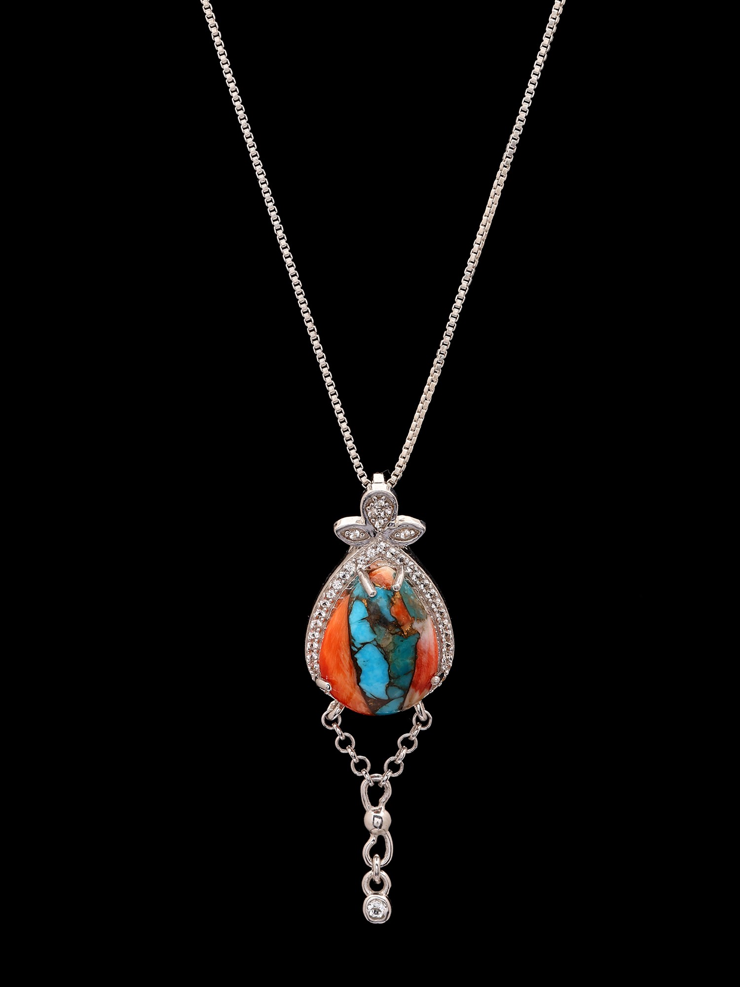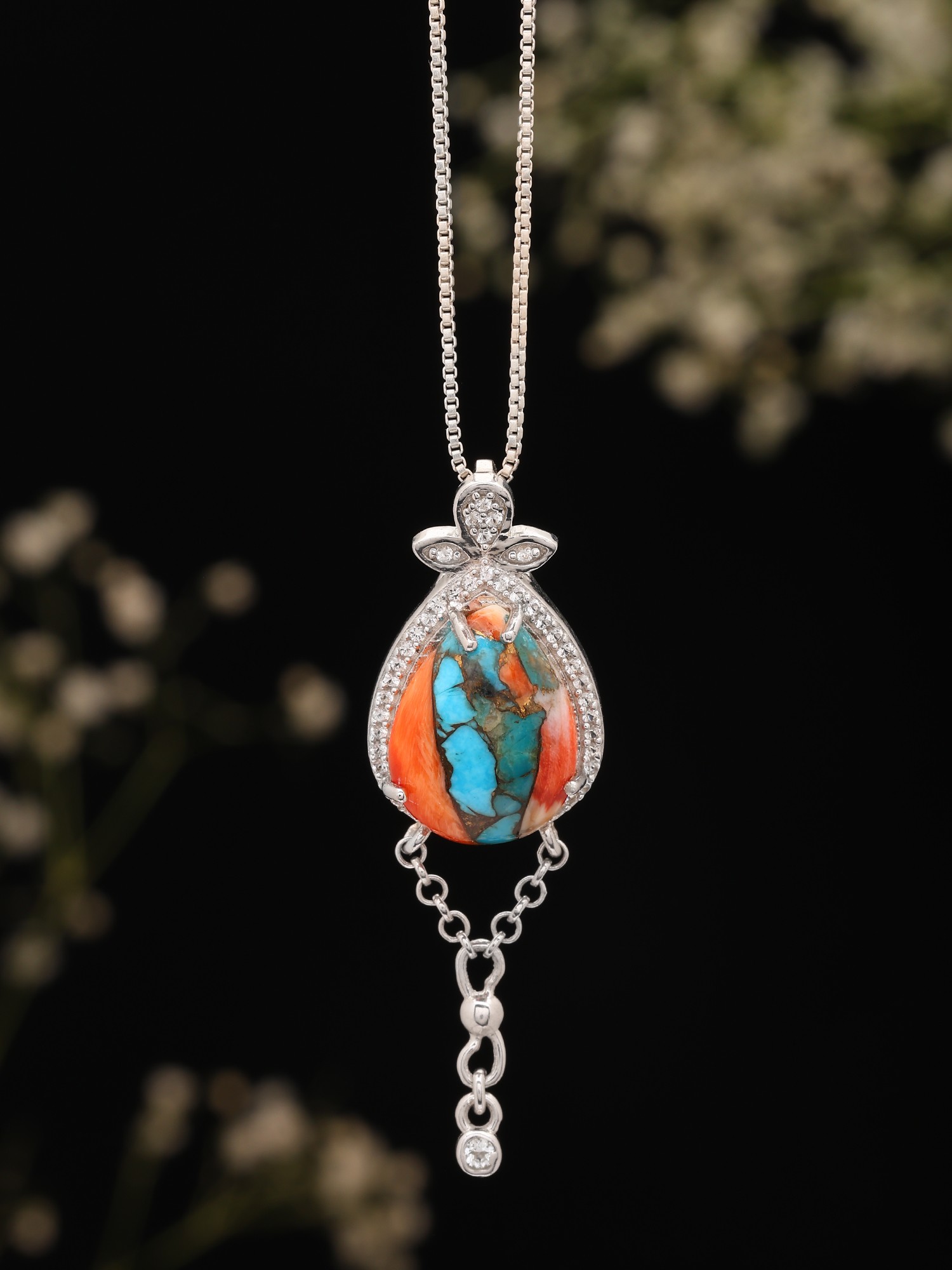 Experience the captivating allure of nature's artistry with this exquisite sterling silver pendant. At its heart lies a stunning teardrop-shaped gem, a mesmerizing fusion of vibrant turquoise hues and fiery orange spiny oyster shell. This unique combination creates a breathtaking display of color, reminiscent of a desert sunset or a tranquil ocean reef. The natural patterns within the stone are a testament to its origin, each vein and swirl telling a story of geological wonder. Encircling this captivating centerpiece is a delicate halo of sparkling cubic zirconia stones, adding a touch of timeless glamour and catching the light with every movement.