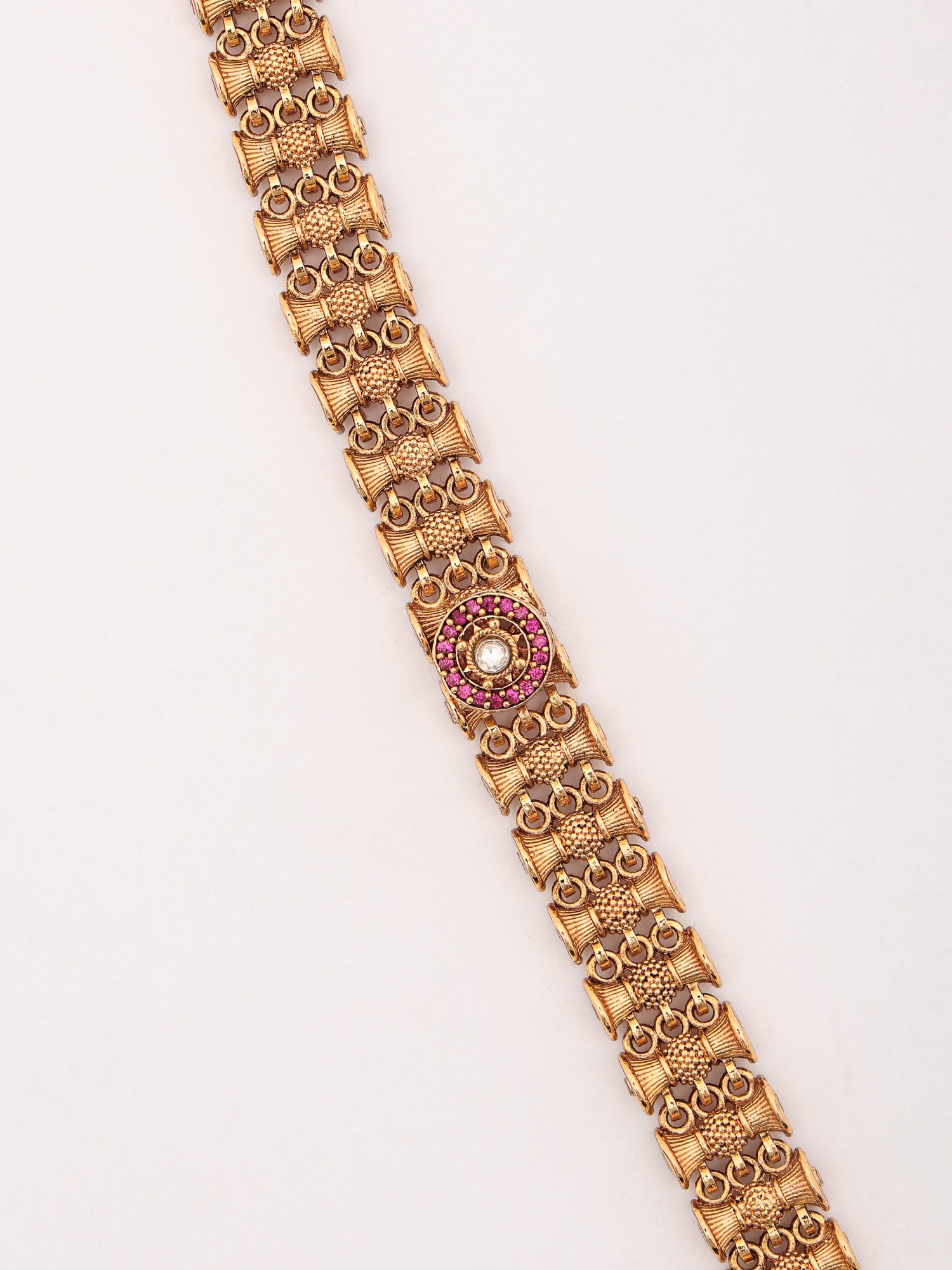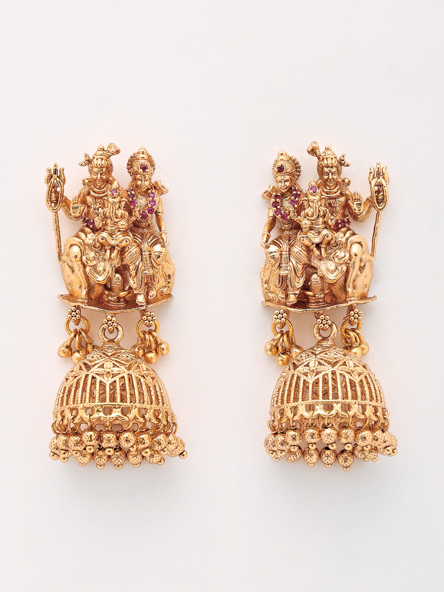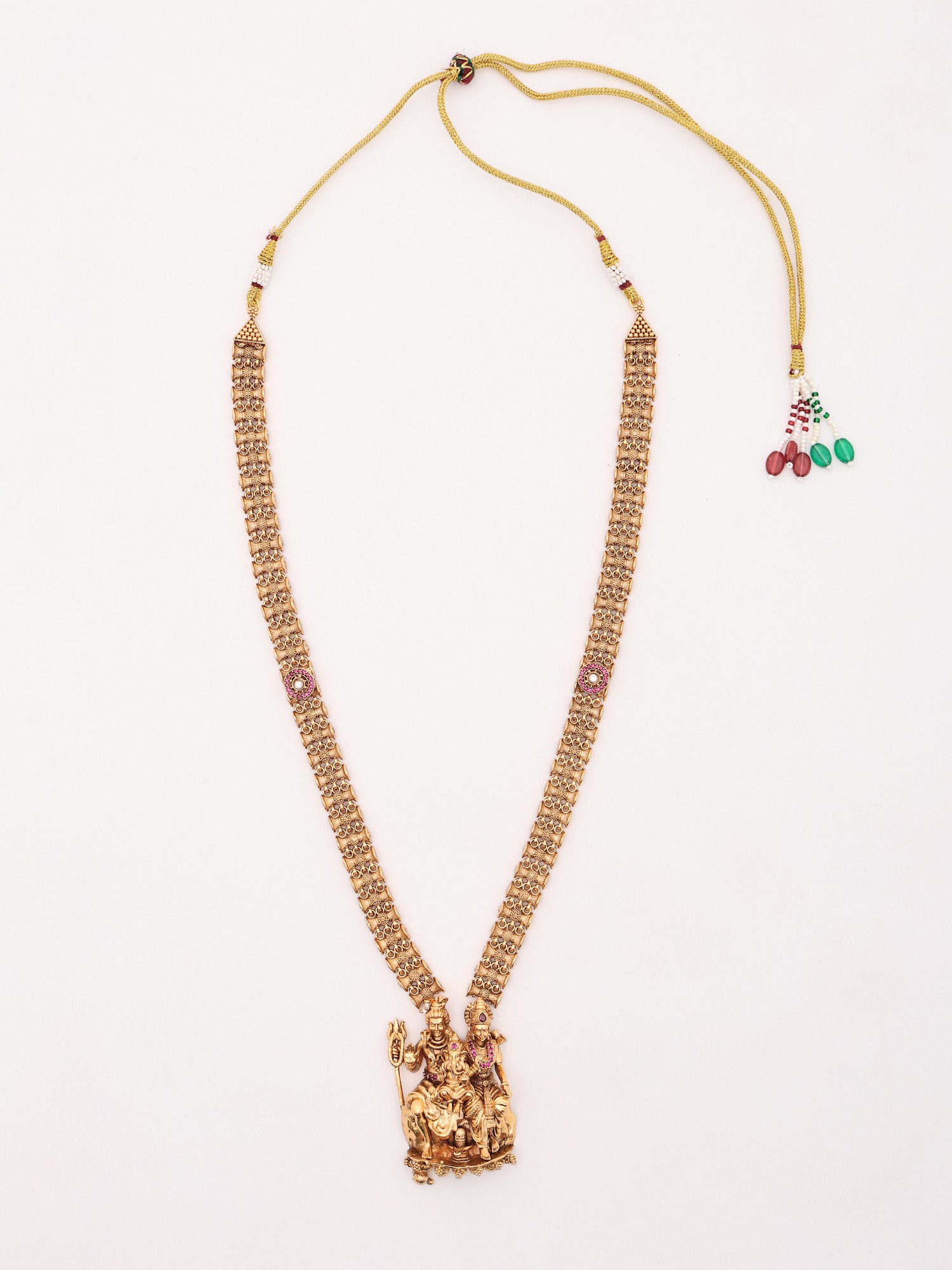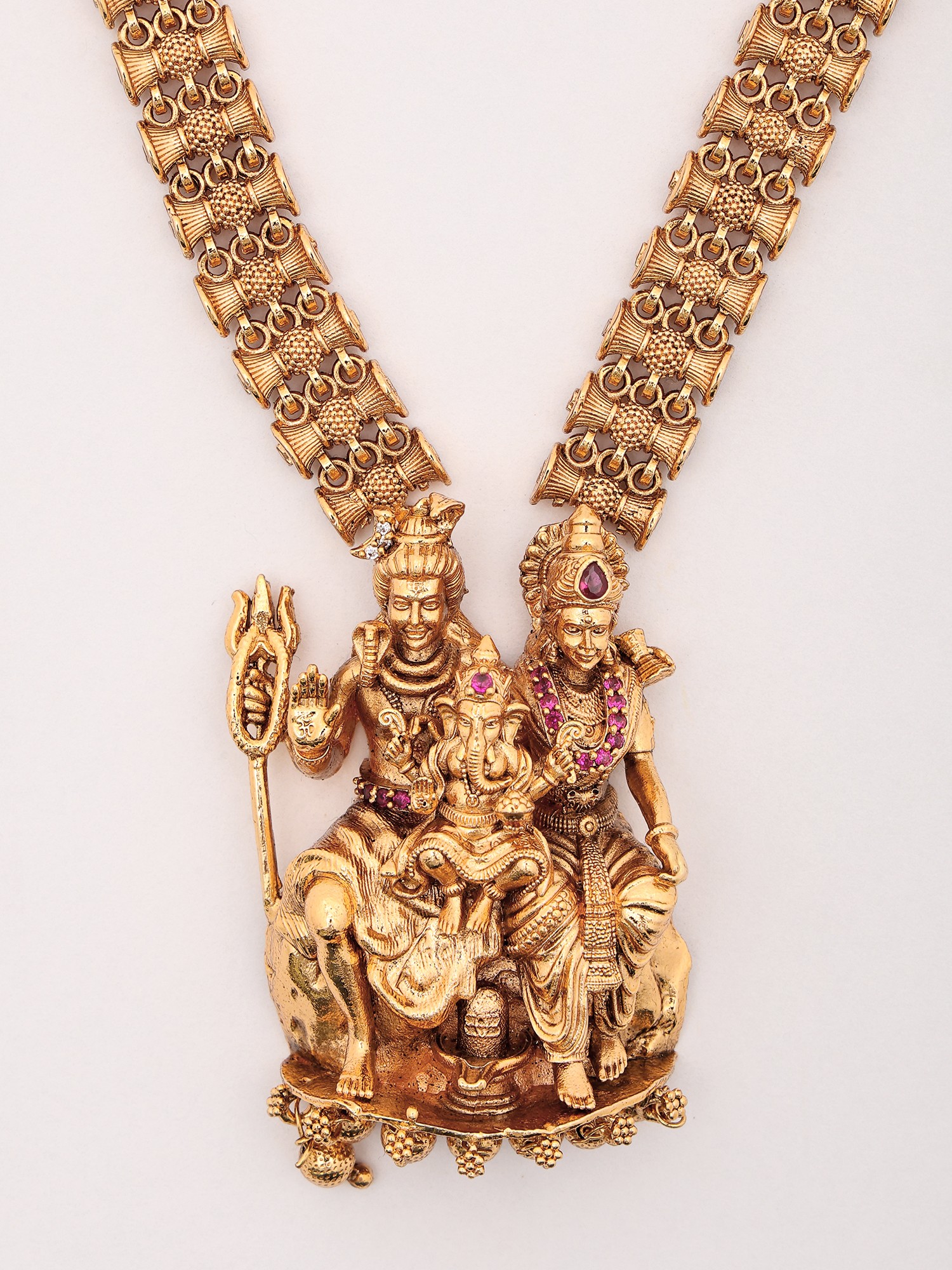 The necklace itself is a masterpiece, extending to a generous 22.5 inches with an adjustable chain for a perfect fit. The striking pendant, measuring 11.4 inches from the front end, features a divine trio rendered with breathtaking fidelity. Complementing this, the matching earrings boast a height of 2.25 inches and a width of 0.8 inches, their dangles echoing the intricate design of the pendant. Subtle ruby accents are strategically placed, adding a touch of vibrant color that enhances the overall regal appeal.