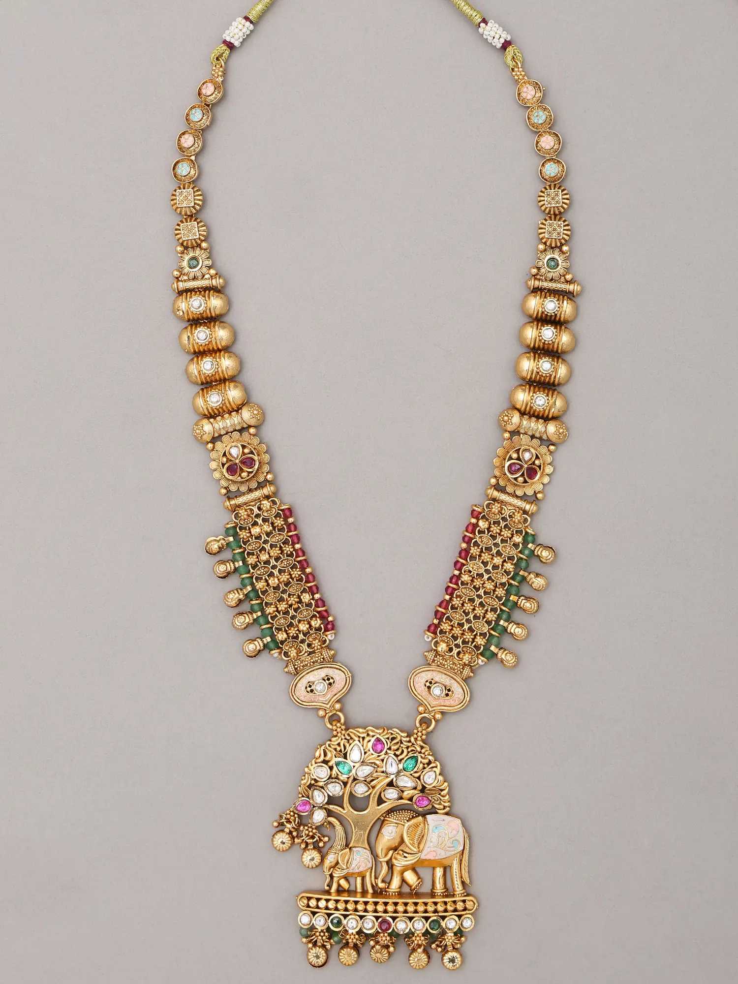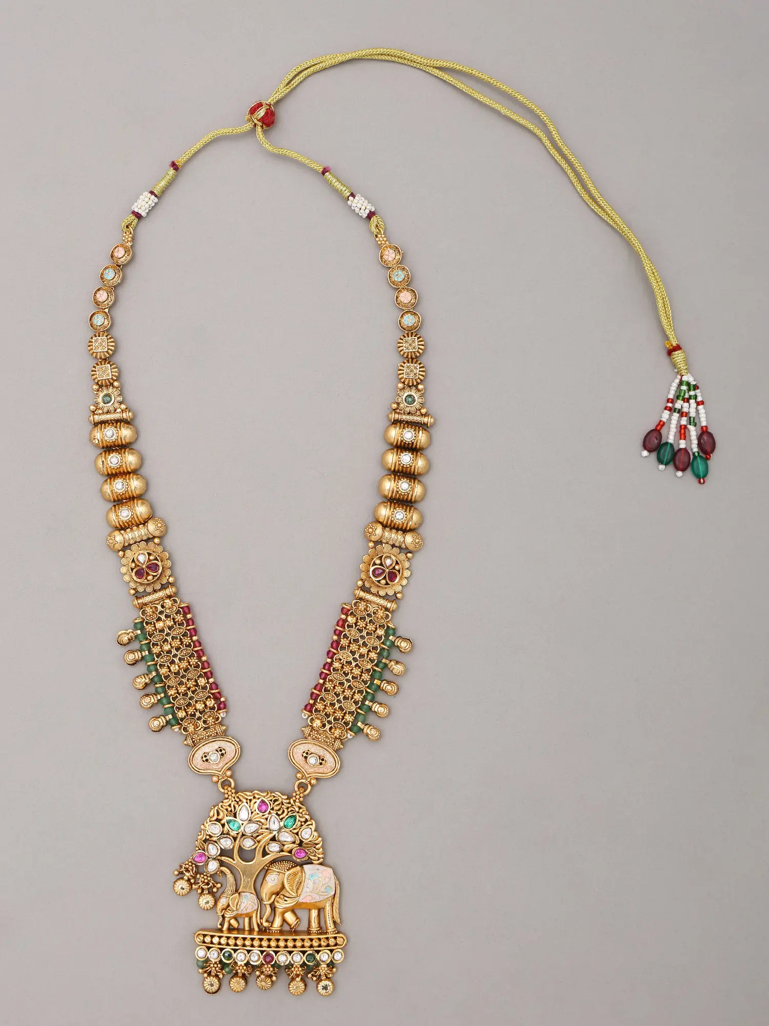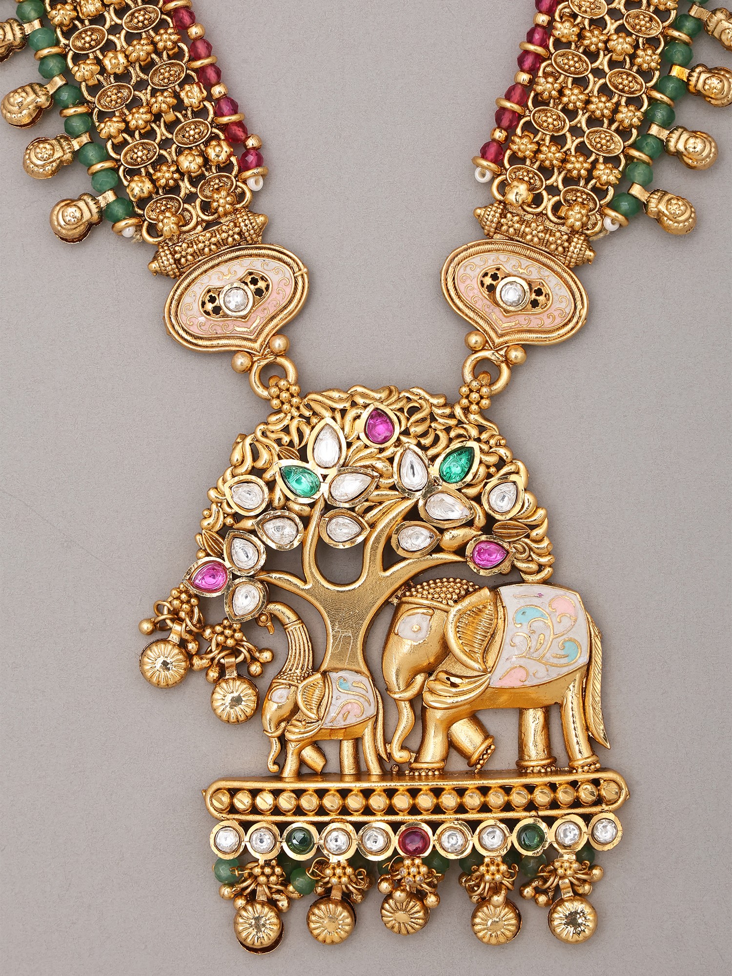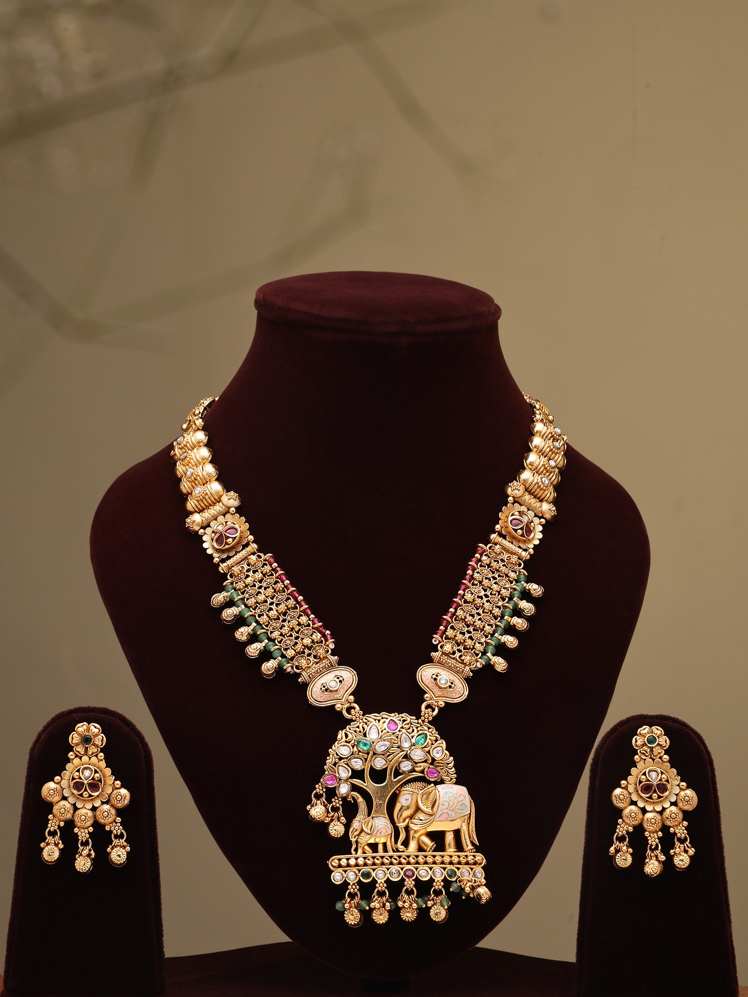 The central pendant presents a breathtaking temple-style motif, featuring elephants beneath a lush tree, rendered with stunning detail. Vibrant accents of color, reminiscent of ancient gemstones, are carefully inlaid, adding depth and allure. The accompanying earrings echo this ornate design, boasting delicate cascades that sway with elegant movement. The necklace itself measures approximately 10.50 inches in height, offering a statement piece that gracefully frames the décolletage. Each earring, measuring 1.80 inches in height and 1.10 inches in width, provides a perfect complement.