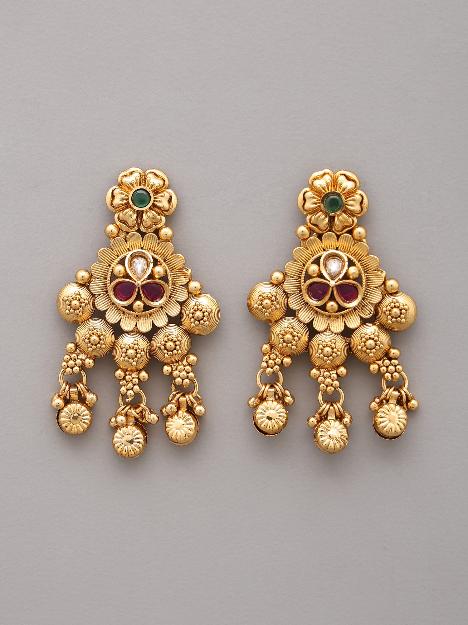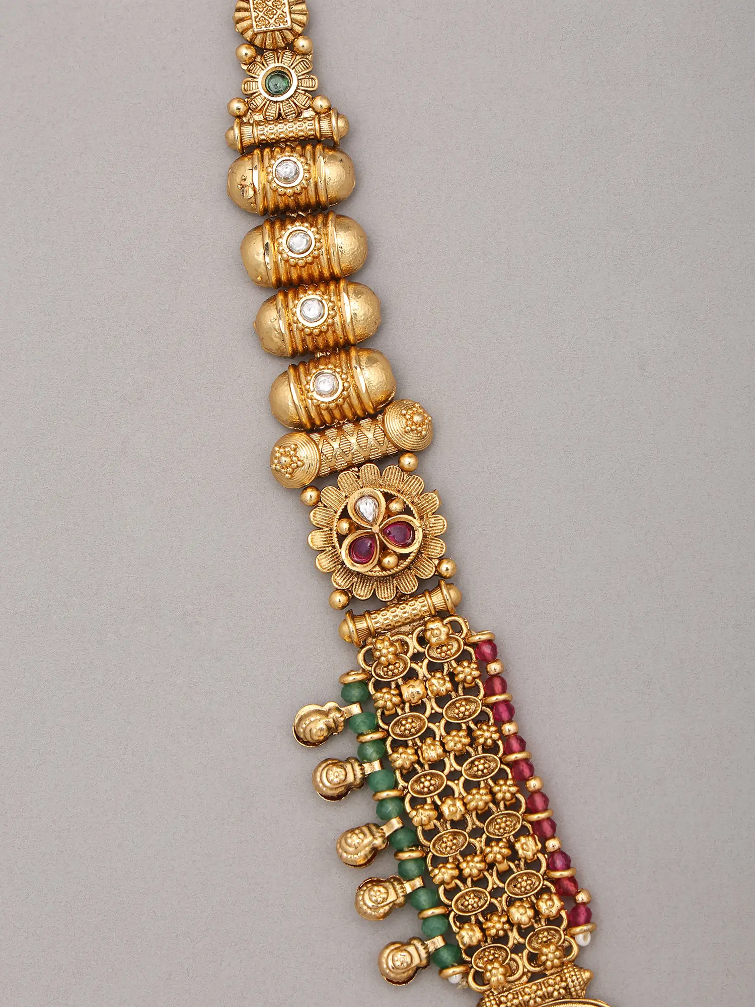 This design draws inspiration from the revered temple jewelry of South India, a tradition steeped in centuries of religious and cultural significance. These pieces were historically created to adorn deities and were later embraced as symbols of prosperity and auspiciousness for women. Wearing this set connects you to a rich tapestry of cultural artistry and spiritual reverence.