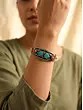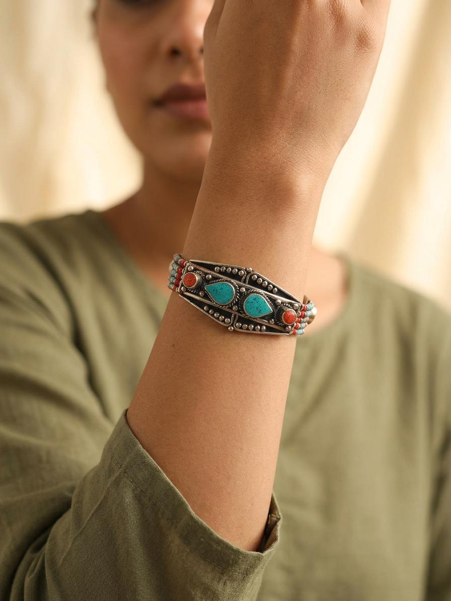 Adorn your wrist with a piece of worldly charm. Inspired by the rich cultural tapestry of Tibet, this handcrafted bracelet evokes a sense of ancient traditions and timeless beauty. This bracelet is a stunning statement piece that will add an element of intrigue to any ensemble. The centerpiece of this bracelet features an intricately designed band, embellished with vibrant stones that catch the light with every movement. The careful craftsmanship is evident in the detailed metalwork that frames the colorful stones, creating a mesmerizing focal point.