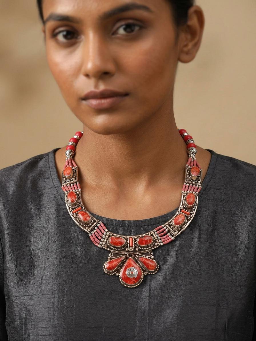 The necklace is meticulously crafted from brass, offering a durable yet lightweight foundation. A brilliant silver polish enhances the intricate details and gives it a lustrous shine. At the heart of its design are vibrant red stones, known for their grounding energy and captivating color. These stones are carefully set within the brass framework, creating a stunning contrast between the warmth of the red and the cool gleam of the silver. The piece’s design is a blend of geometric shapes, flowing lines, and tribal motifs, making each detail visually appealing.