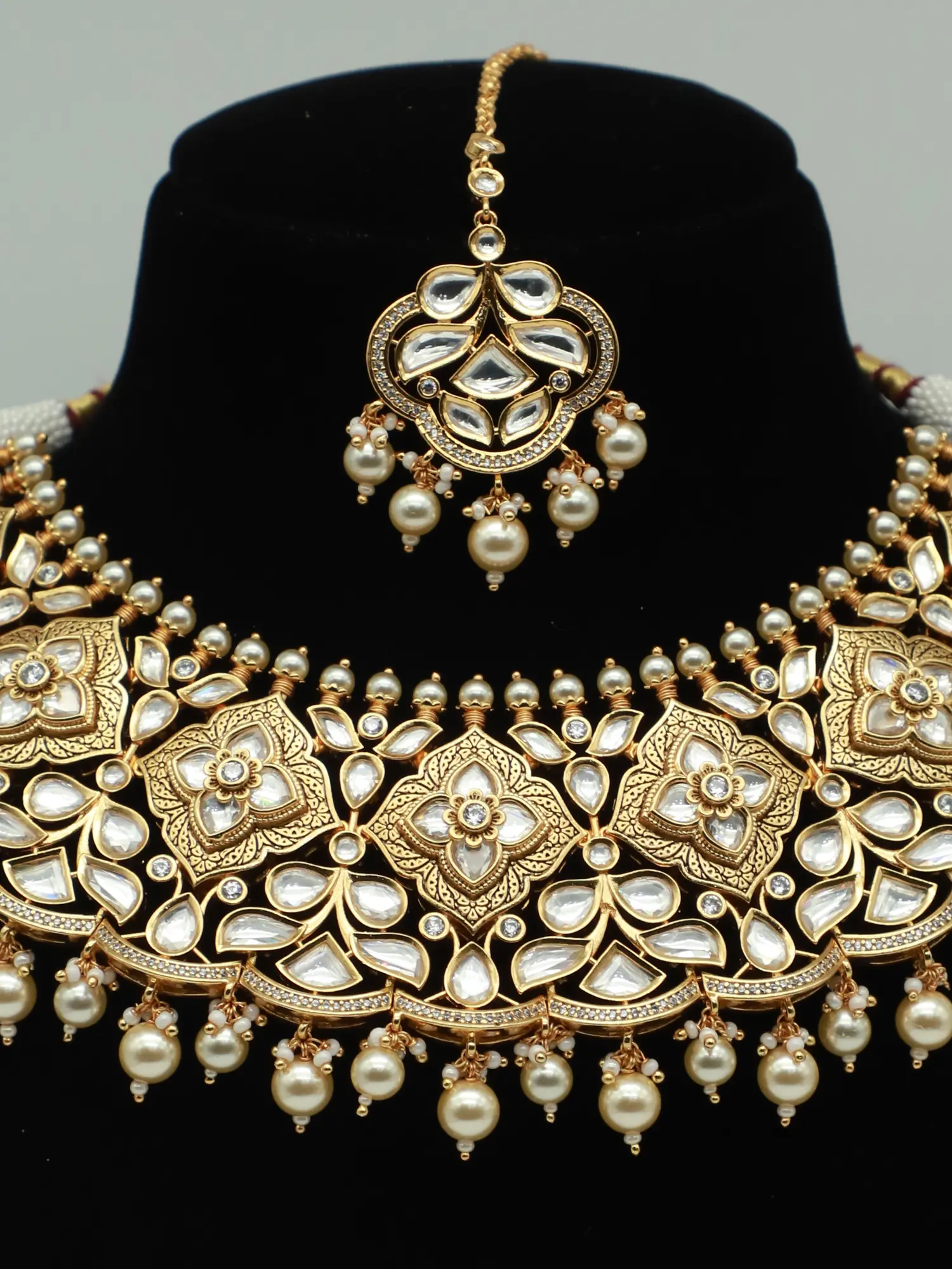 Includes a traditional choker necklace, matching earrings, and a maang tikka.