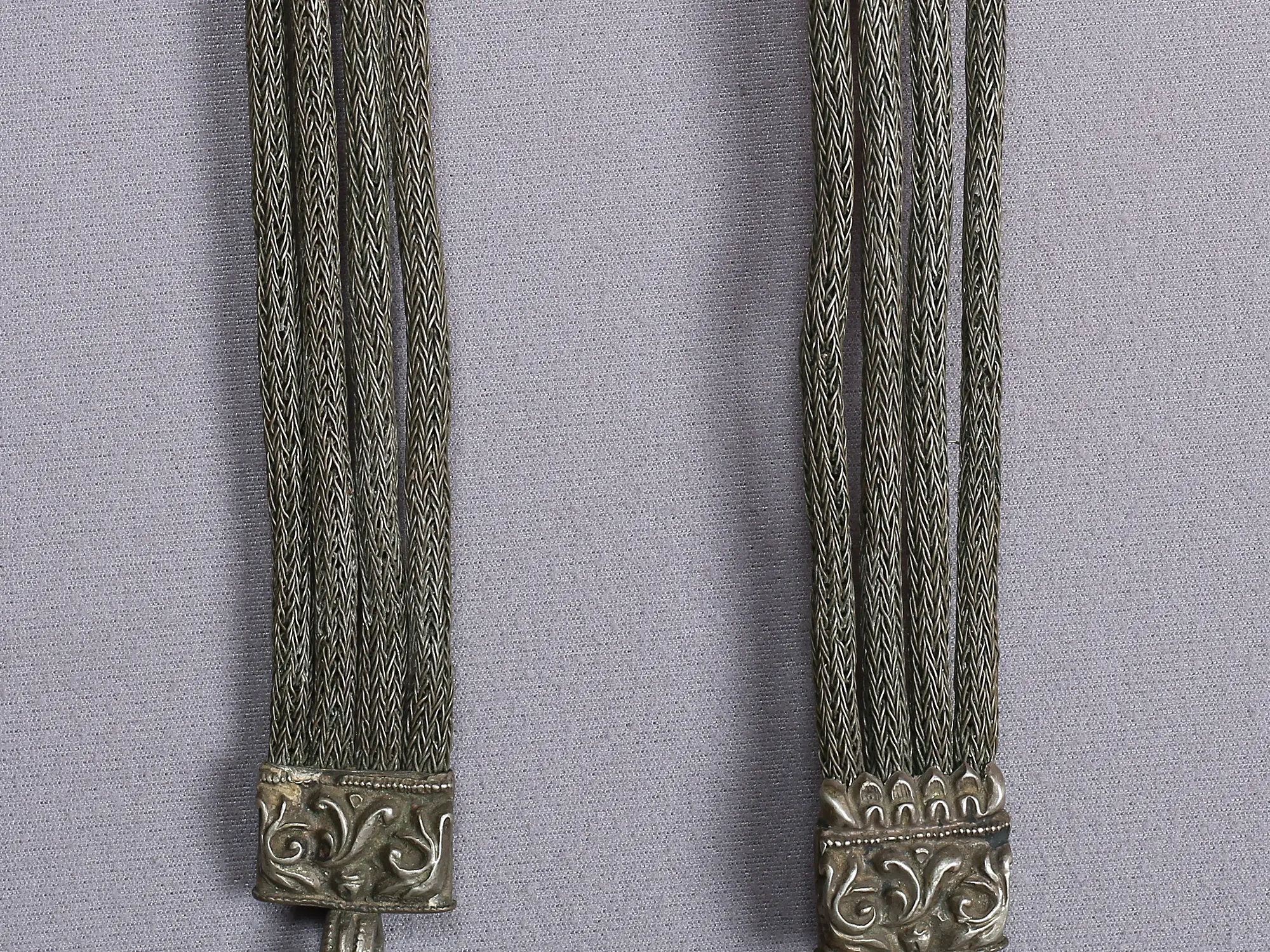 This Traditional Silver Necklace is worn by the women of East Nepal. It is made with silver and carries the ethnic motifs native to the area. The necklace consists of three parts. One is the upper motif, the middle set of chains, and the lower pendant. The lotus blossom-styled clasp at the top, and the square amulet box at the bottom are the main attraction of the piece. The semi-precious stone at the center of the amulet) adorn this amulet necklace. The vegetal patterns at the extremities of the supporting bands are motifs. Made of sterling silver, this kind of jewelry was popular in East Nepal. Adorning the wearer is not just jewelry; it's a journey into the heart of Nepal's cultural tapestry, a captivating blend of history and adornment.