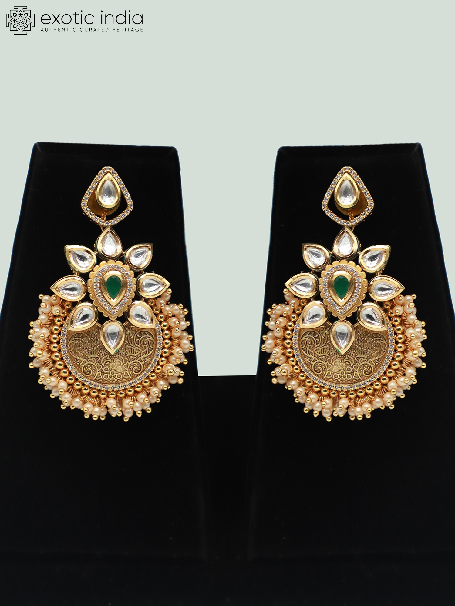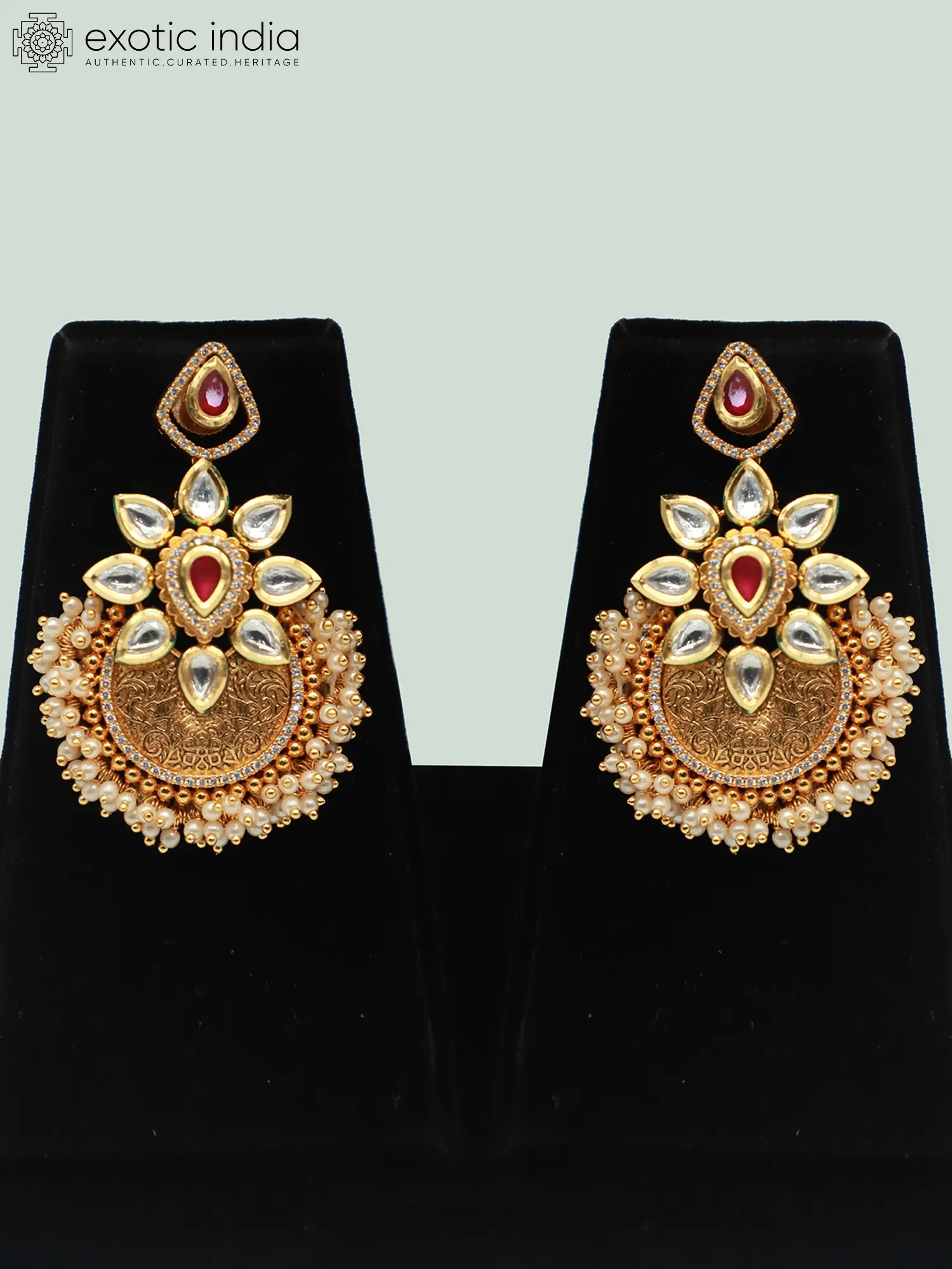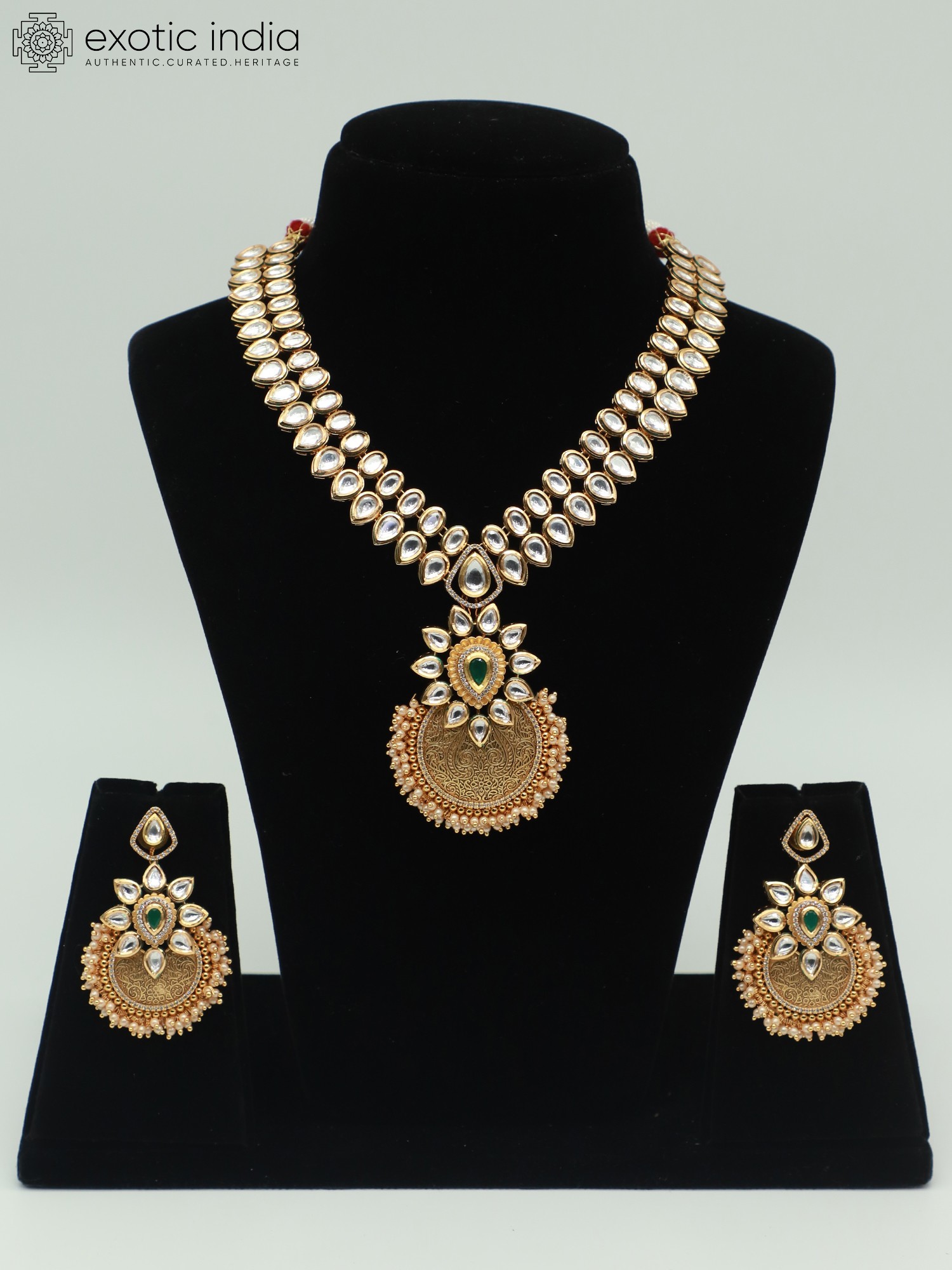 The necklace is composed of a beautifully arranged sequence, leading to a stunning pendant. The pendant itself is a work of art, featuring delicate engravings. The design is completed with pearls and a central stone, adding a vibrant and elegant touch. The earrings complement the necklace perfectly, echoing the pendant's design and creating a cohesive and balanced look. The pair is crafted from brass, with each element carefully placed to ensure both beauty and durability. The overall design reflects a deep appreciation for traditional aesthetics, seamlessly blending classic motifs with contemporary sensibilities.