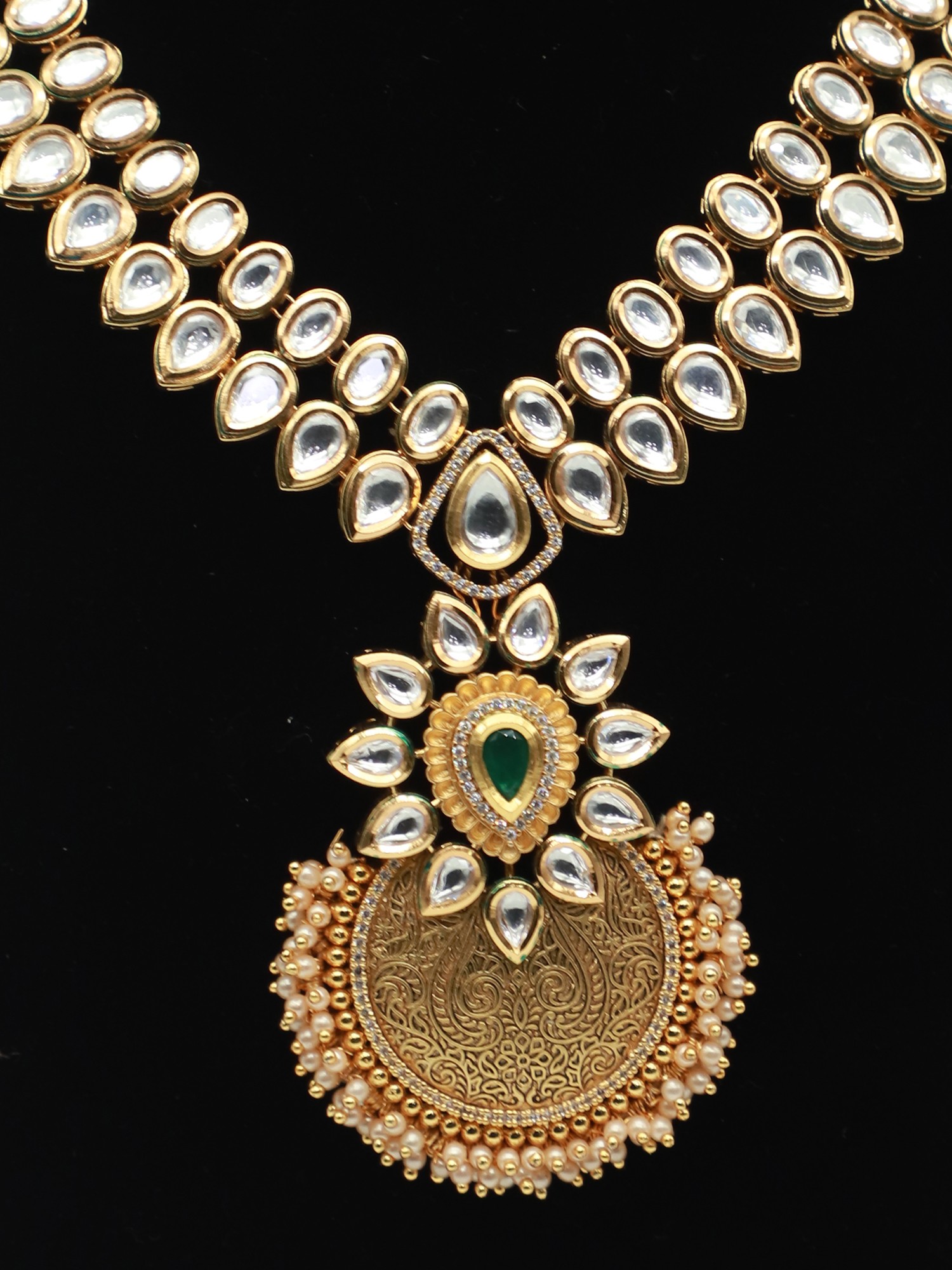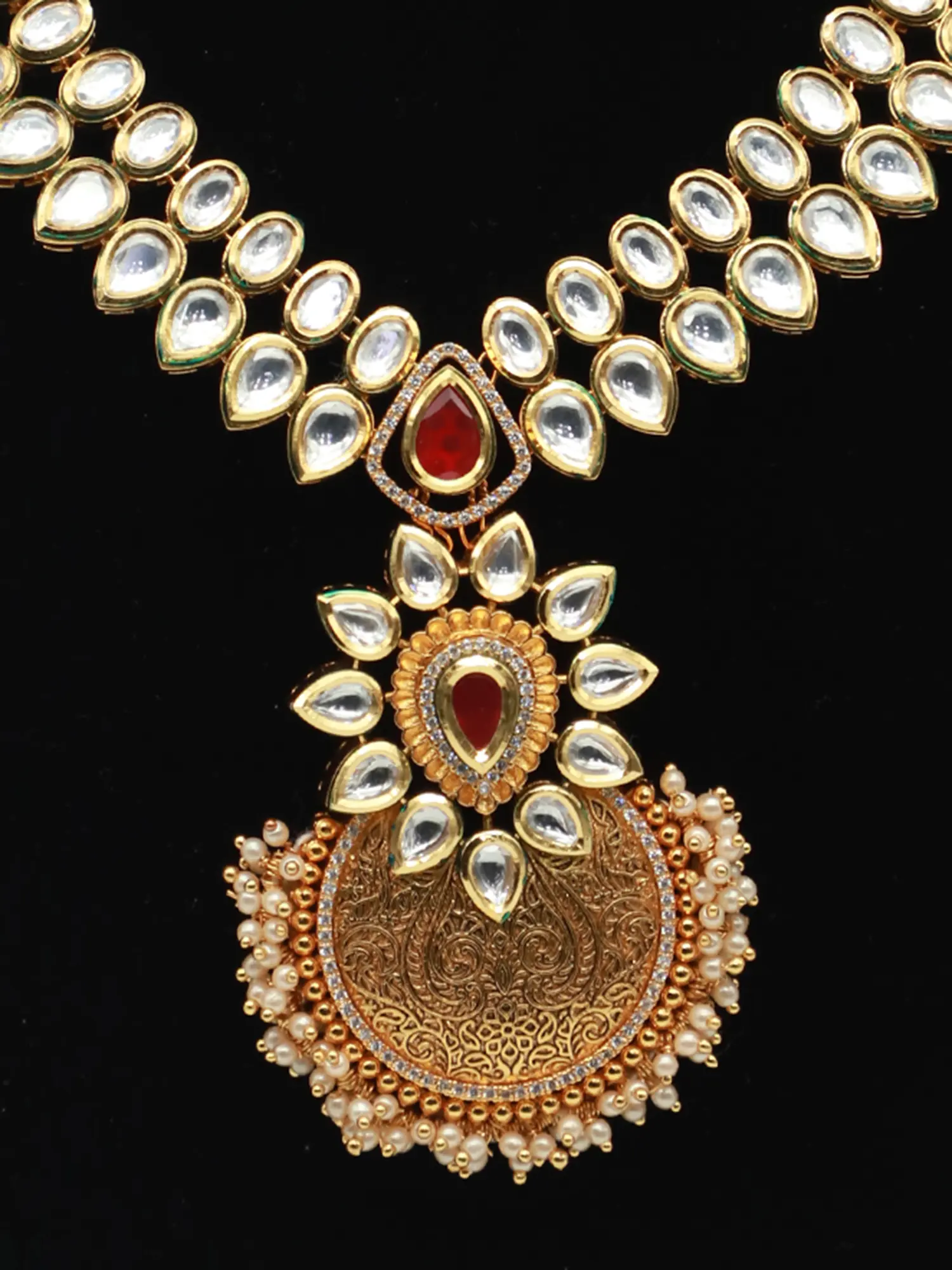 This exquisite necklace set is more than just jewelry; it's a statement piece, a testament to timeless elegance and traditional artistry. Crafted with meticulous attention to detail, this set is designed to elevate any ensemble, adding a touch of regal charm and sophisticated grace. The necklace features a captivating pendant design, drawing the eye with its intricate detailing and harmonious blend of classic elements. Perfect for weddings, festive celebrations, or any occasion where you want to radiate confidence and style, this set is sure to become a cherished heirloom in your jewelry collection.