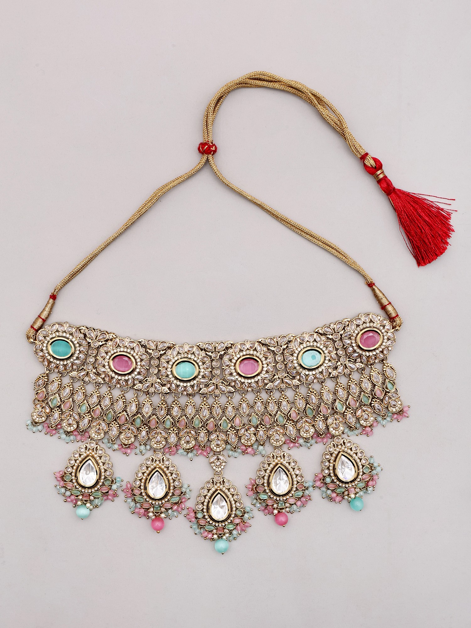 Multicolor Designer Stone Studded Choker Jewelry Set With Earrings