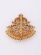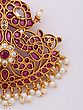 Adorned with a vibrant tapestry of richly hued stones, meticulously set to catch and reflect light with every turn. Delicate pearl drops cascade gracefully, adding a touch of gentle opulence and subtle movement that enhances its allure. The thoughtful arrangement of these precious elements, set within a frame measuring approximately 2 inches in height and 1.95 inches in width, creates a harmonious visual balance.