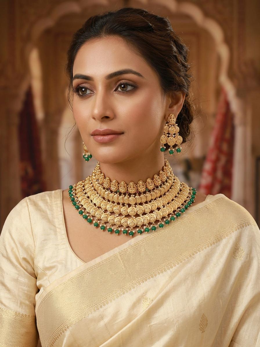 This set features representations of Lakshmi, the Hindu goddess of wealth, prosperity, and fortune. Each meticulously crafted detail evokes a sense of reverence and bestows blessings upon the wearer. The presence of Lakshmi symbolizes abundance and auspiciousness, making this set not only a beautiful accessory but also a meaningful emblem of prosperity.