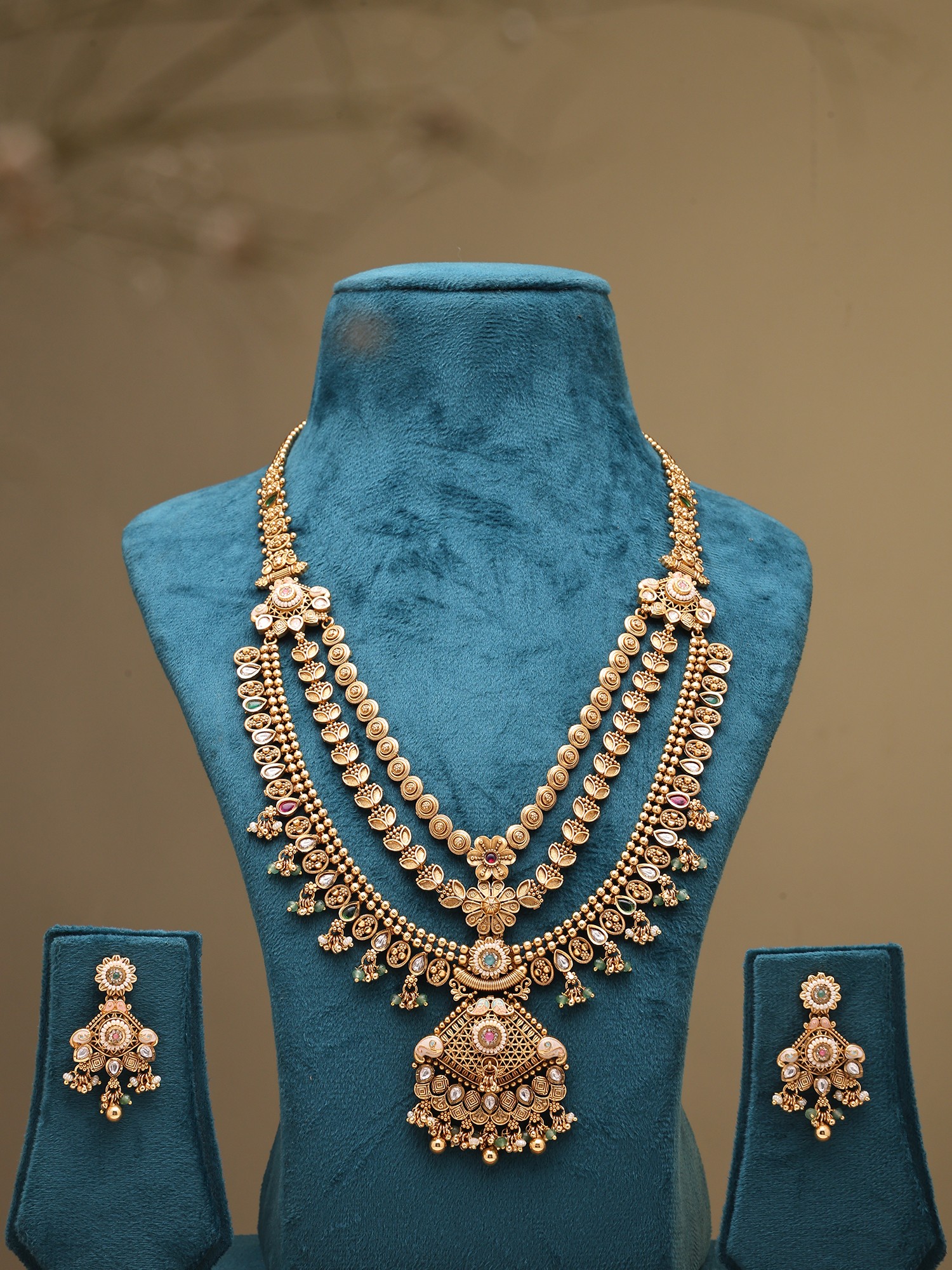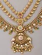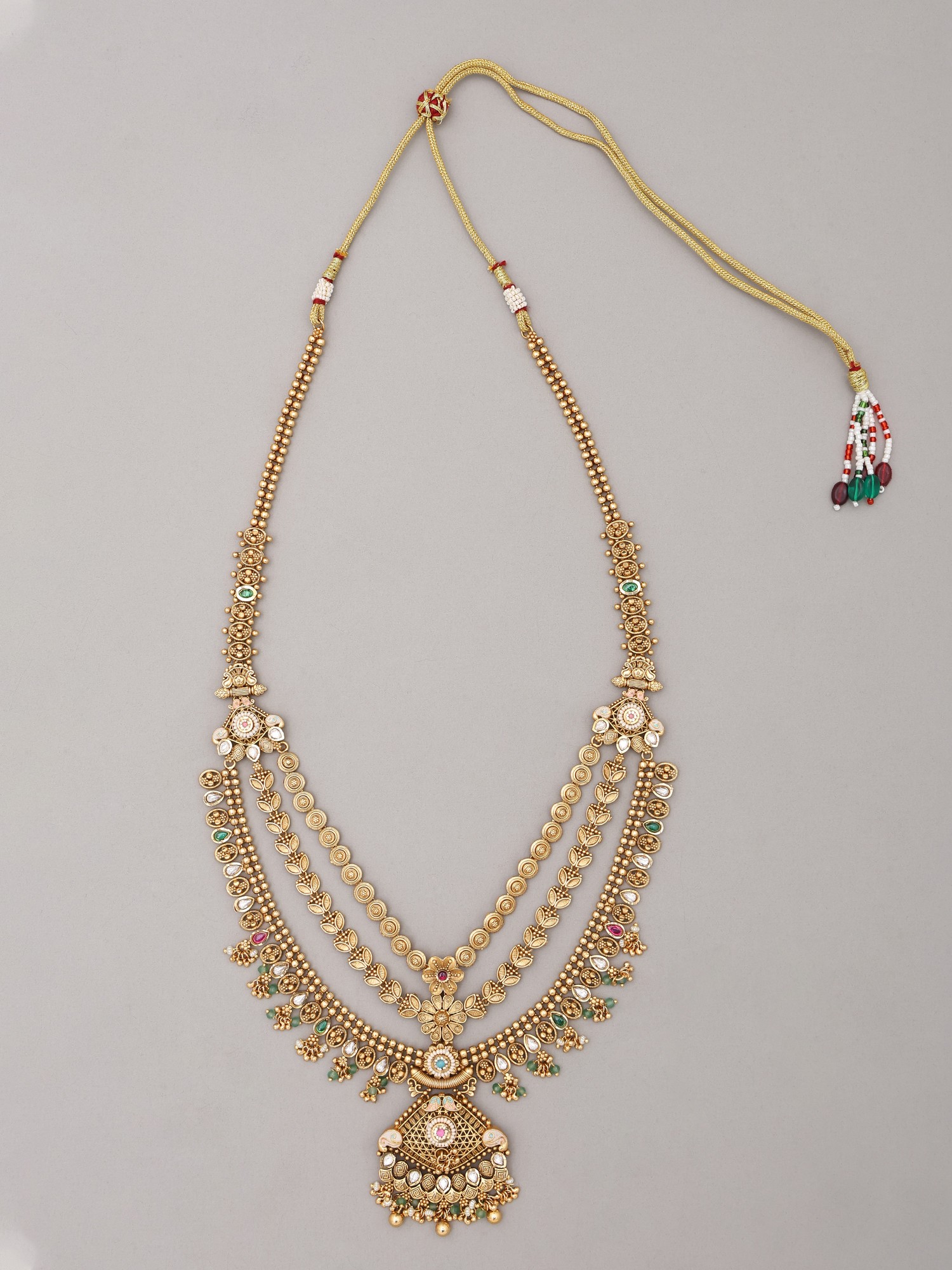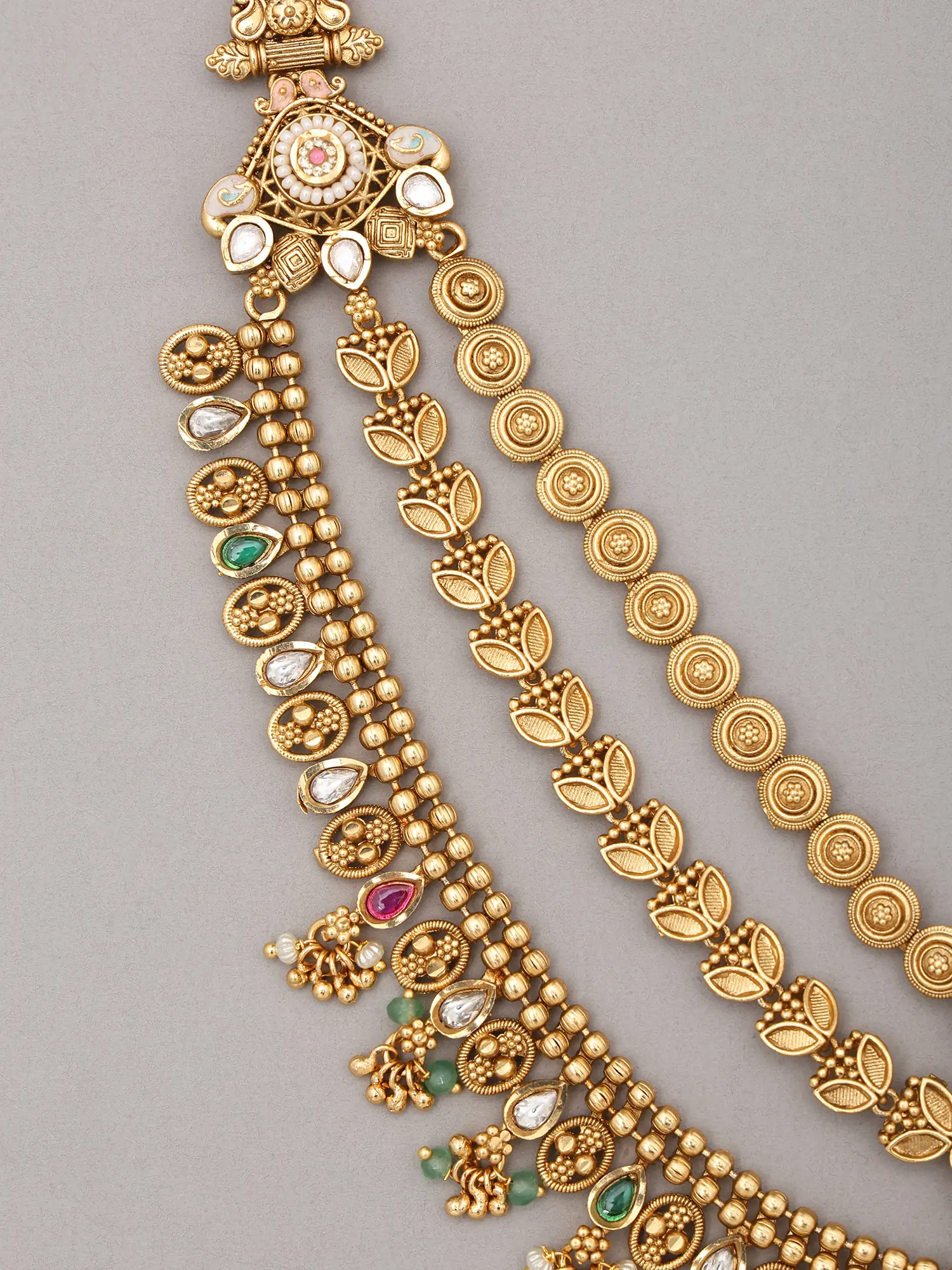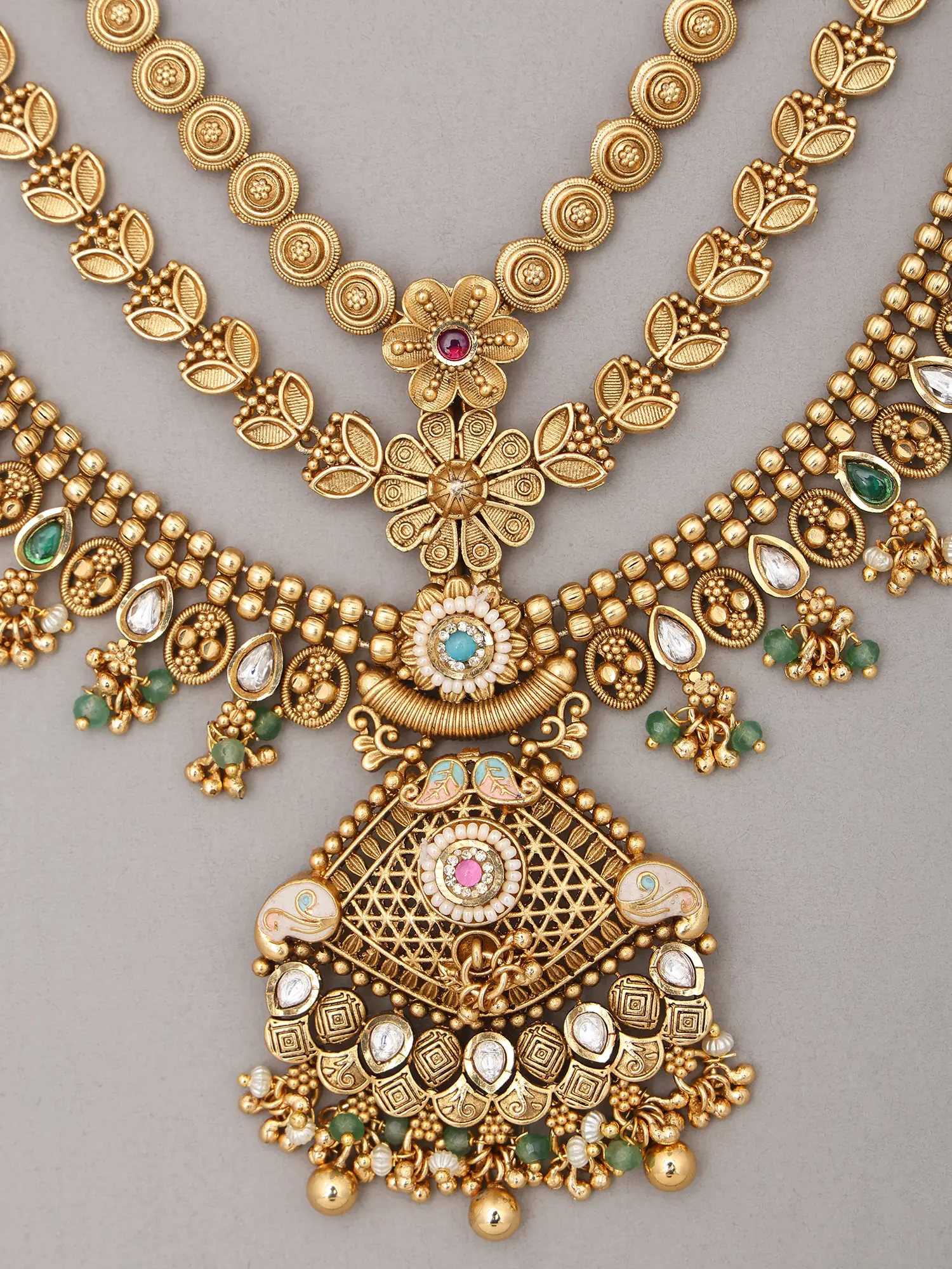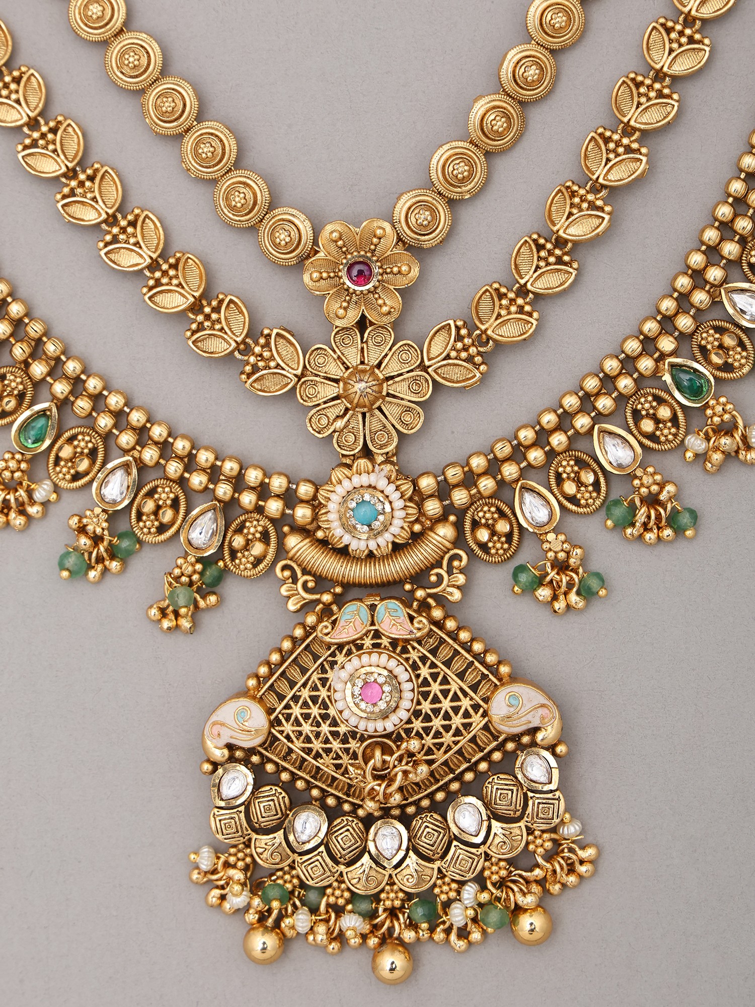 Traditional Jharokha Carved Three Layer Rajwadi Rani Haar Set with Bead Drop