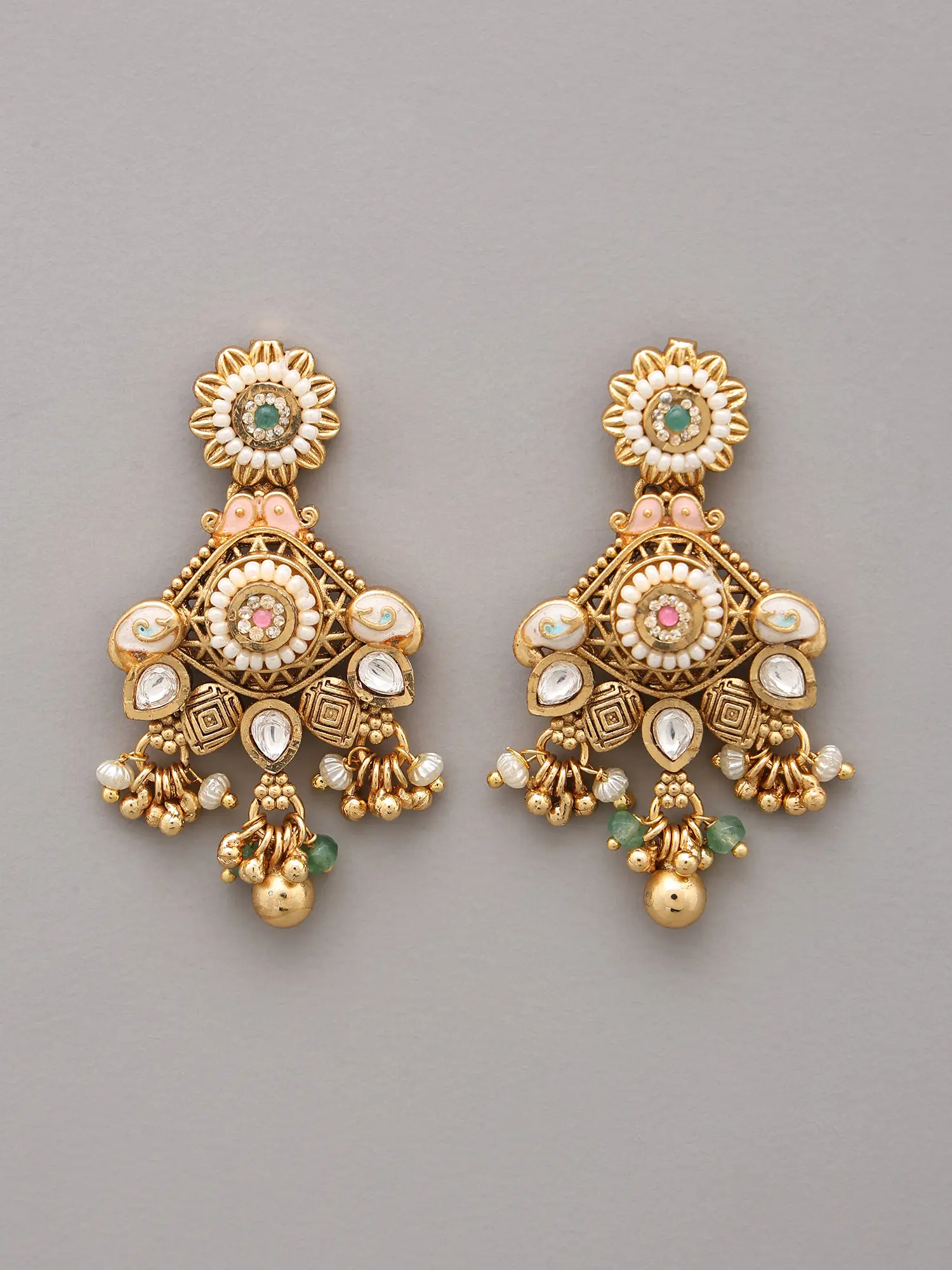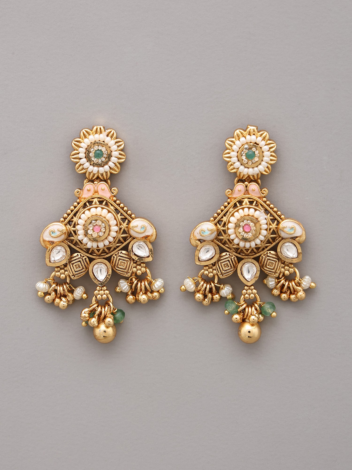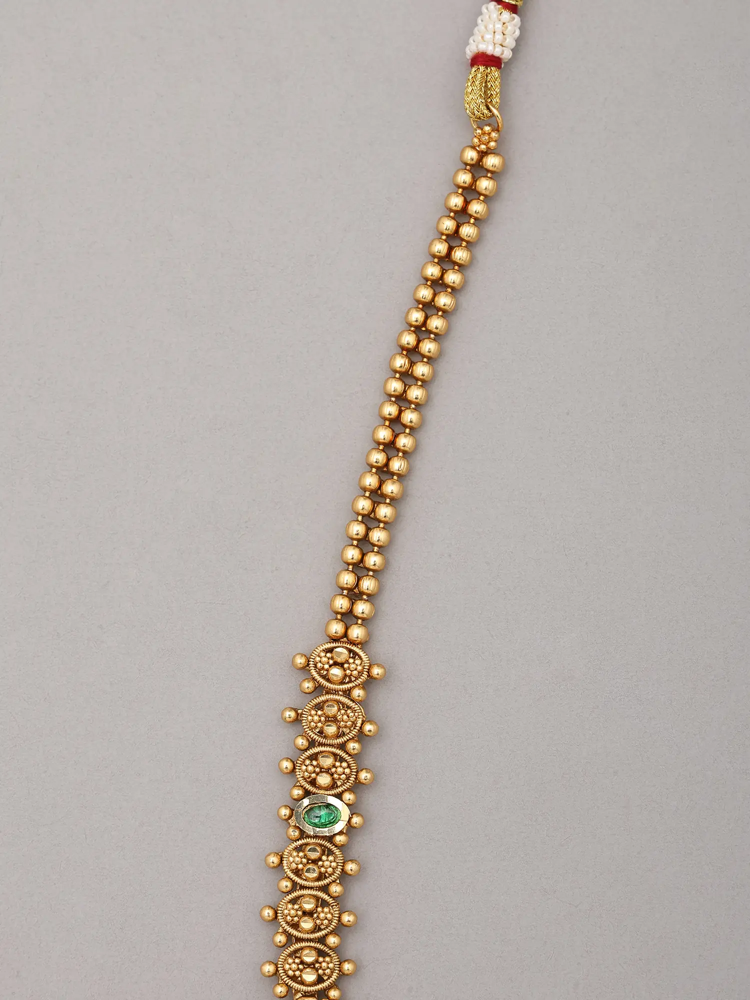 Meticulously handcrafted from high-quality brass, this ensemble showcases the dedication of skilled artisans. Each element, from the intricate floral motifs to the delicate bead drops, is thoughtfully shaped and assembled. You'll appreciate the substantial yet comfortable weight, a testament to its robust construction and enduring appeal.