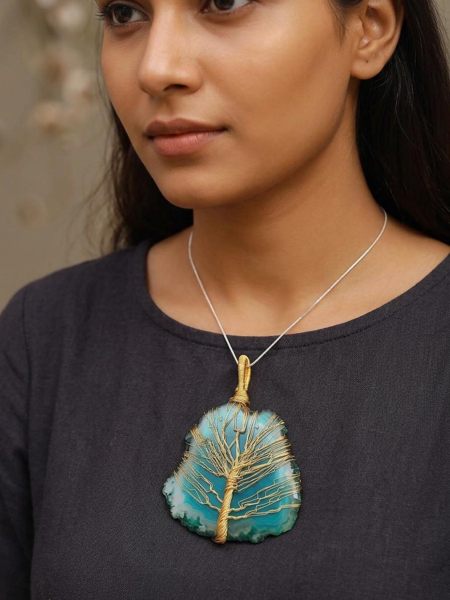 Each pendant is a testament to meticulous craftsmanship, born from the skilled hands of artisans who pour their passion into every detail. Gleaming brass wire is painstakingly sculpted to form a majestic tree, its branches embracing a breathtaking teal-blue stone. The natural variations within the stone, coupled with the intricate wirework, ensure that your piece is a unique work of art, reflecting hours of dedicated creation.