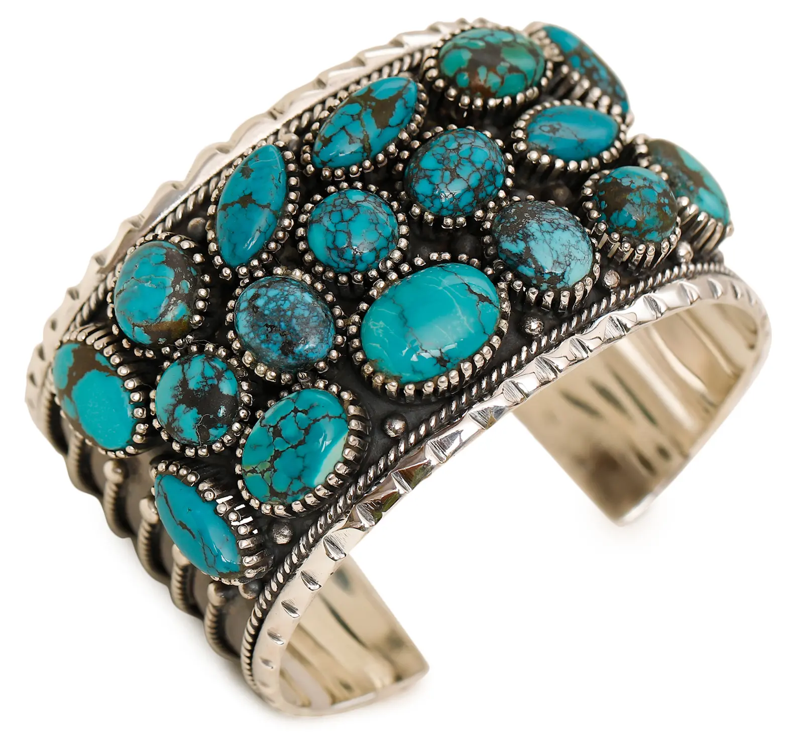 Embrace the spirit of the American Southwest with this exquisite cuff bracelet, a masterpiece of artisanal craftsmanship. Each element of this piece speaks to a rich heritage of design, where natural beauty and skilled artistry intertwine. The vibrant, sky-blue hues of the carefully selected turquoise stones are the undeniable stars, each possessing its unique matrix of earthy brown veins, creating a captivating mosaic that reflects the raw, untamed landscapes from which they originate. These stones, varying in shape and size, are meticulously bezel-set into a bed of gleaming sterling silver, each secured with individual, decorative silver beads that add a subtle yet significant textural dimension.