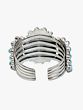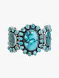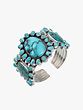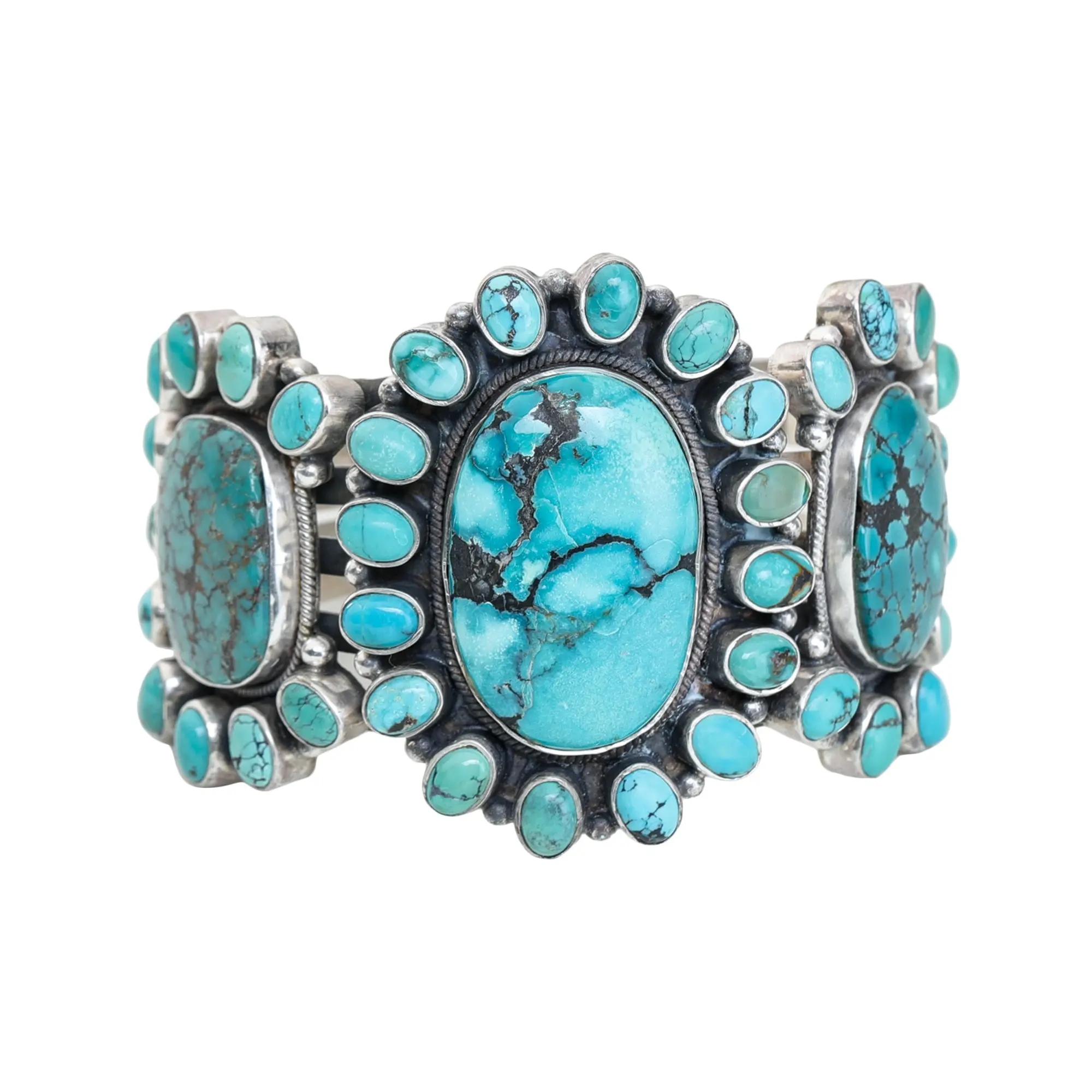 Meticulously handcrafted, this bracelet showcases exceptional attention to detail. The centerpiece stones, each displaying a stunning turquoise pattern, are carefully selected and polished to bring out their natural brilliance. Smaller, complementary turquoise stones surround the larger ones, creating a captivating cluster effect. The sterling silver setting is expertly crafted to both secure the stones and enhance their inherent beauty. The adjustable band ensures a comfortable and customized fit, allowing you to wear this masterpiece with confidence.