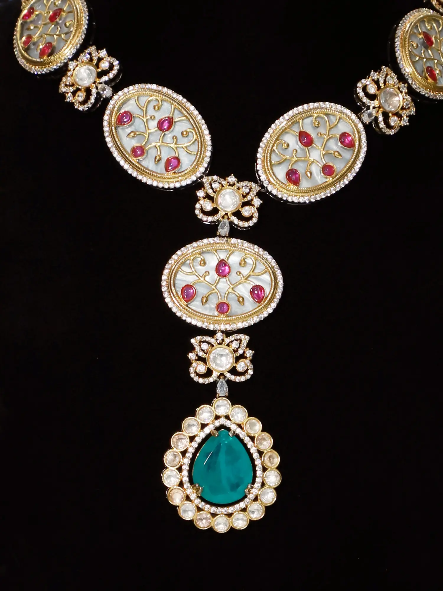Green And Pink Color Necklace Set In Meenakari With Beautiful Earrings For Women