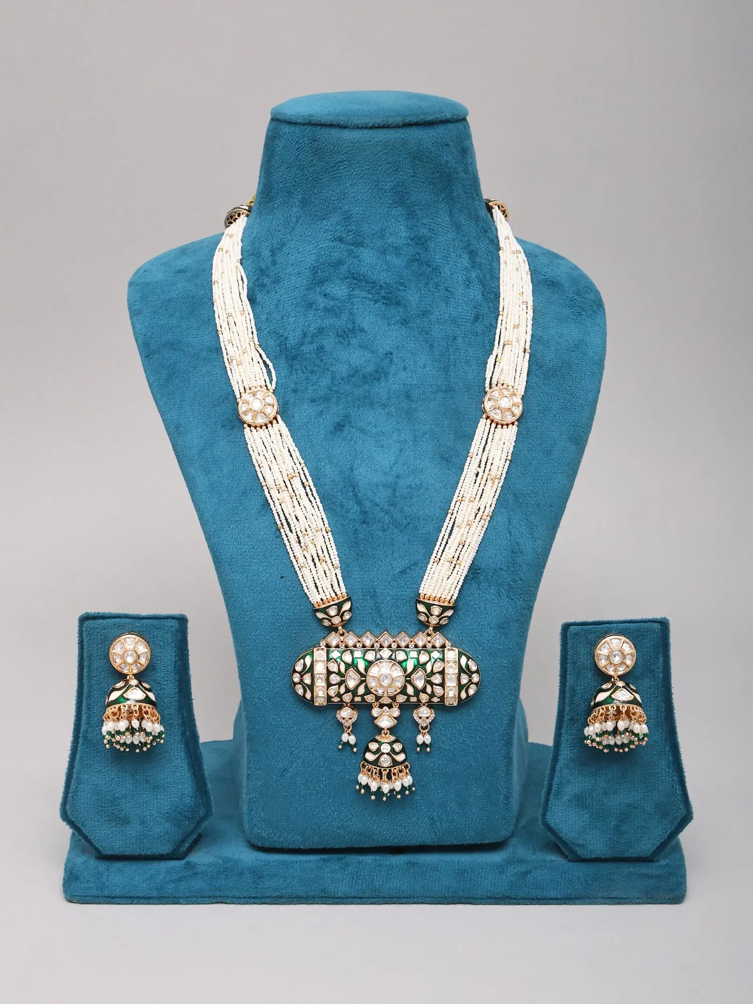 Each element of this remarkable piece is meticulously handcrafted by skilled artisans who pour generations of expertise into their work. Constructed from high-quality brass, its foundation is built for enduring beauty. The multi-strand arrangement of delicate white beads, interspersed with subtle gold accents, speaks volumes of patient dedication. The intricate Meenakari enameling, a hallmark of traditional Indian craftsmanship, is applied with precision, creating a rich tapestry of color and detail that sets this creation apart.