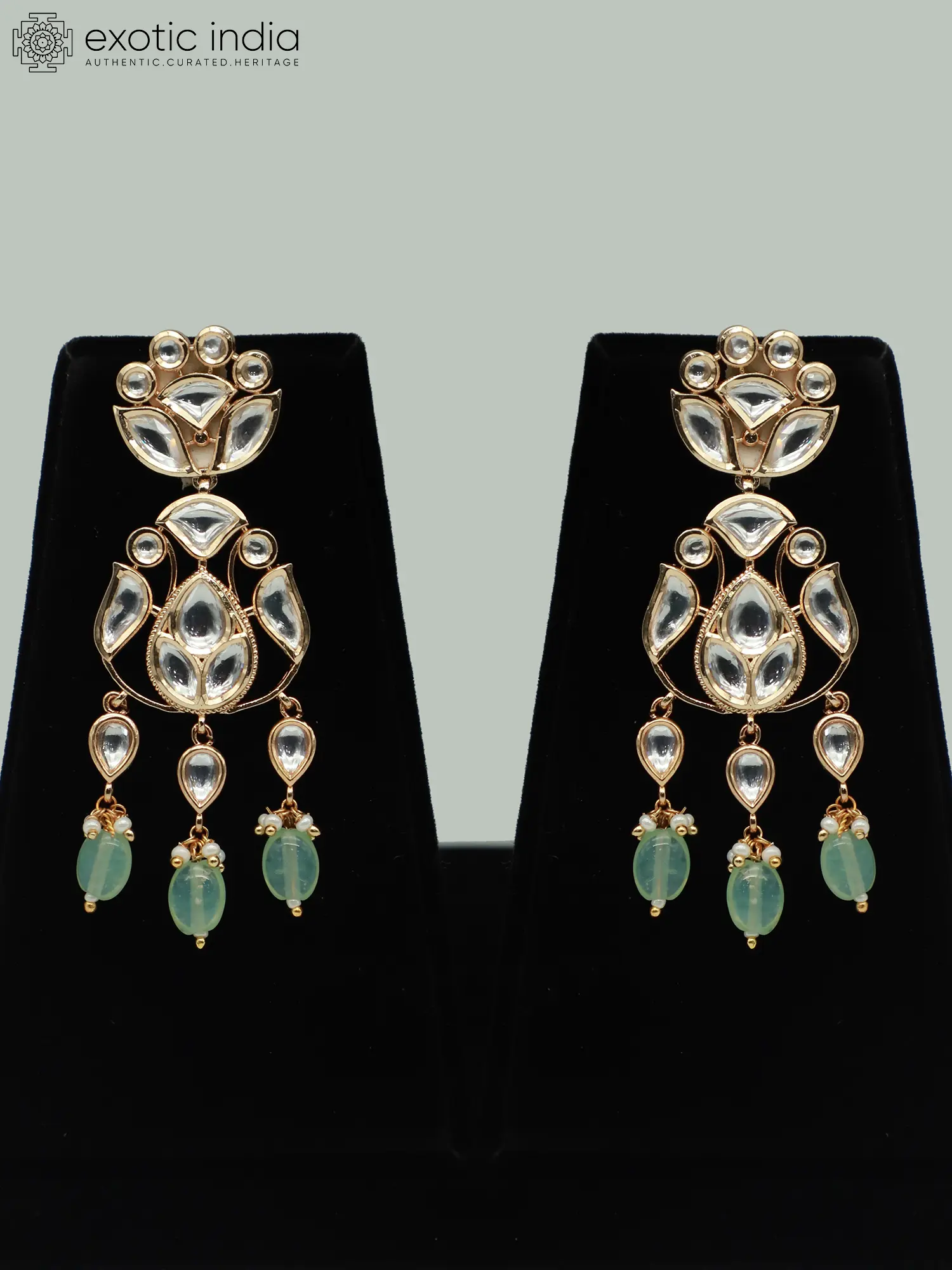 Meticulously fashioned from quality brass, this set showcases a commitment to fine artistry. The intricate details are evident in the elegant framework that holds the clear, shimmering stones securely in place. These stones capture the light beautifully, creating a dazzling effect with every movement. Dangling gracefully from the base of the choker and earrings are vibrant green drop beads, offering a captivating contrast against the clear stones and warm brass tones. These beads, punctuated by delicate pearl accents, add a playful touch to the overall design, making it both elegant and intriguing.
