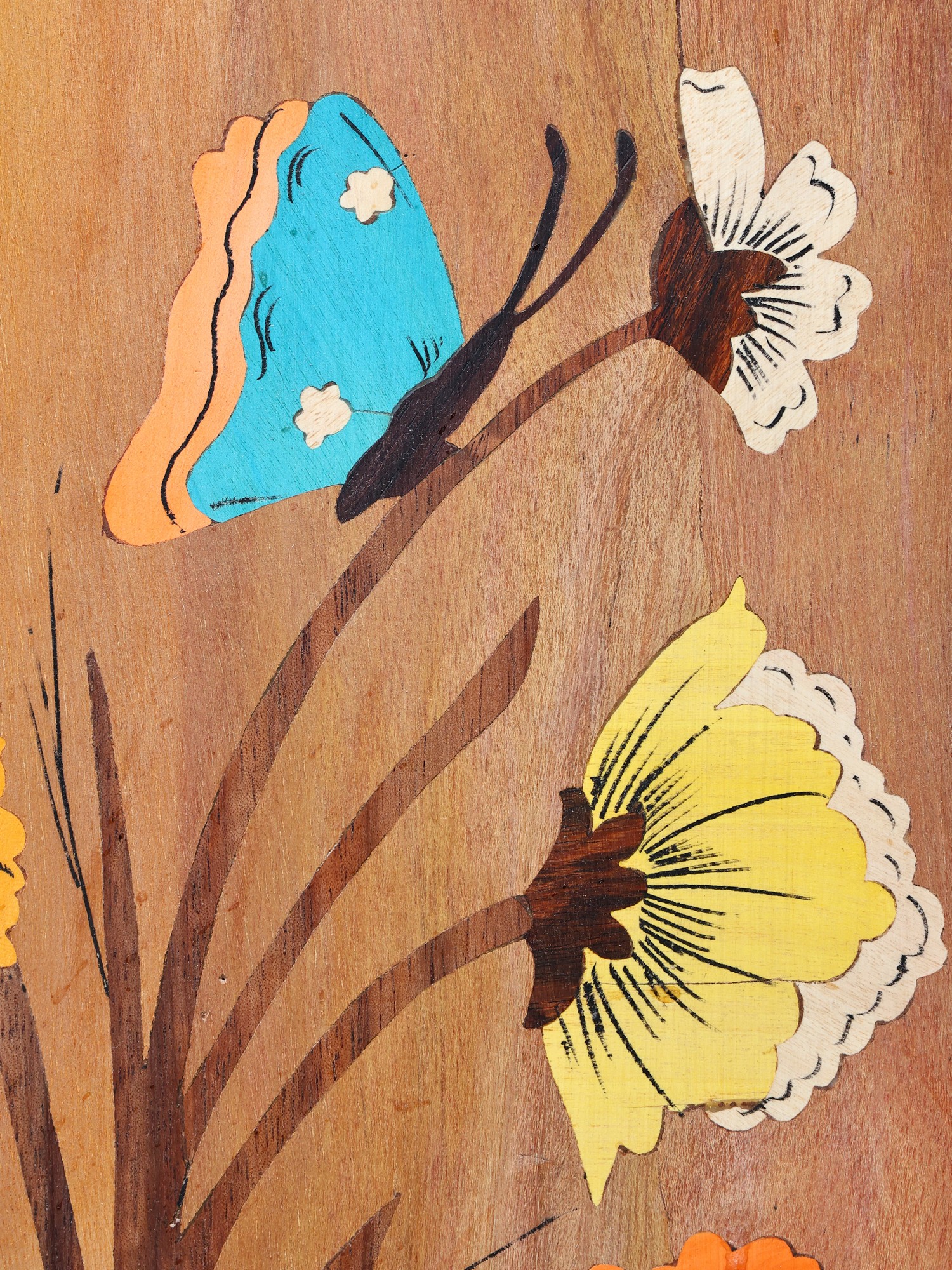 The rosewood panel serves as a canvas for the detailed inlay work. The meticulous process transforms the wood into a work of art, showcasing the artisan's dedication to precision. Each element, from the butterfly's wings to the delicate petals of the flowers, is crafted with utmost care. The warm tones of the rosewood complement the carefully chosen inlay materials, creating a visual interplay that is both striking and harmonious. The rich texture of the wood adds depth and character to the artwork, making it a unique and visually captivating piece.