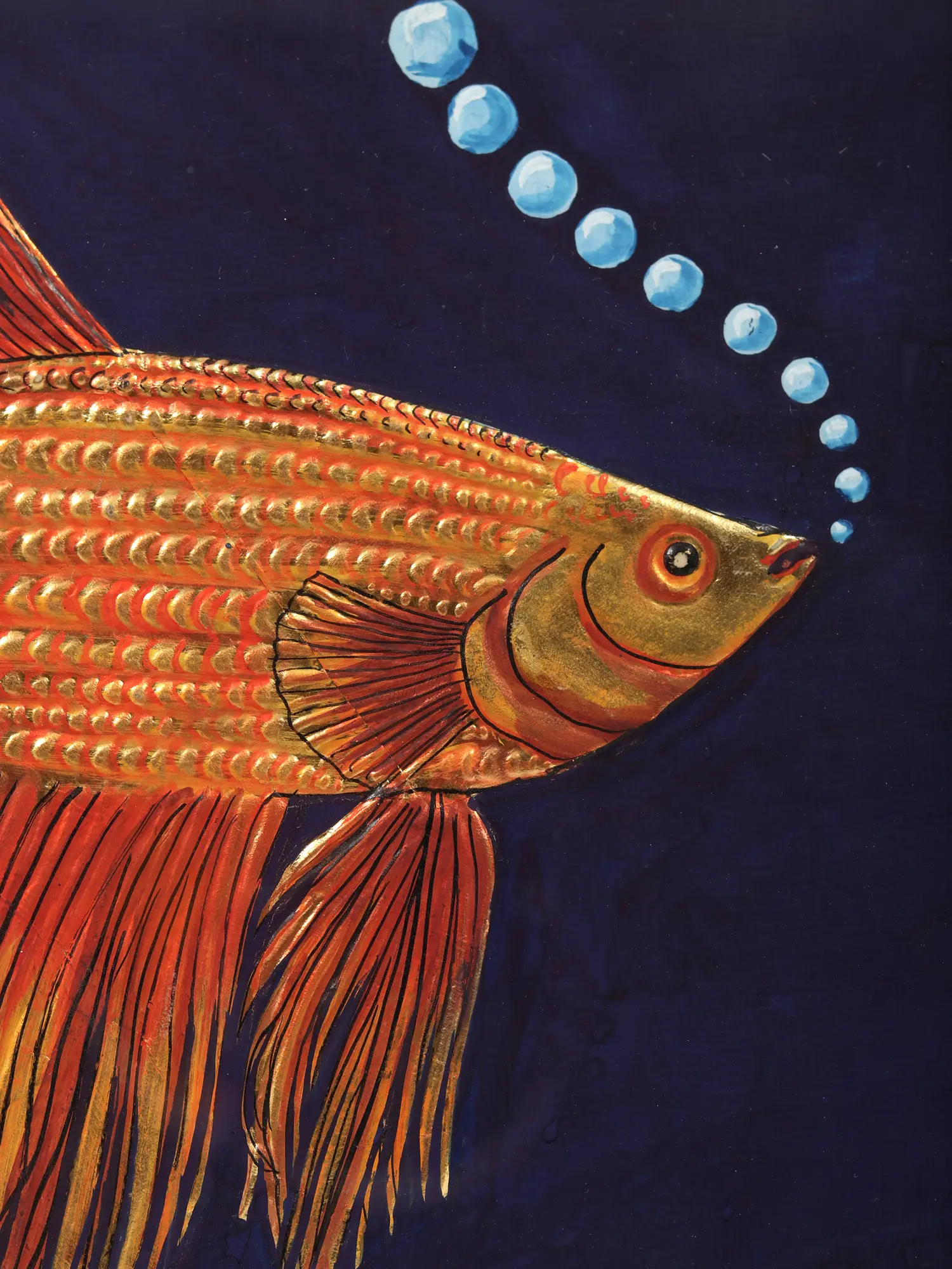 Dive into the enchanting realm of aquatic grace with our "Framed Betta," a Tanjore creation that gives you a glimpse into the mesmerising world beneath the water's surface, where vibrant colours and intricate patterns dance in harmony. Beyond mere aesthetics, this piece beckons you to contemplate the duality of nature, where beauty and strength converge.