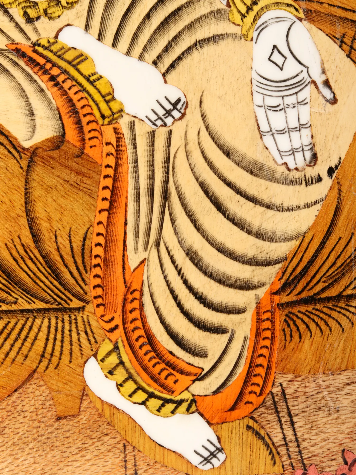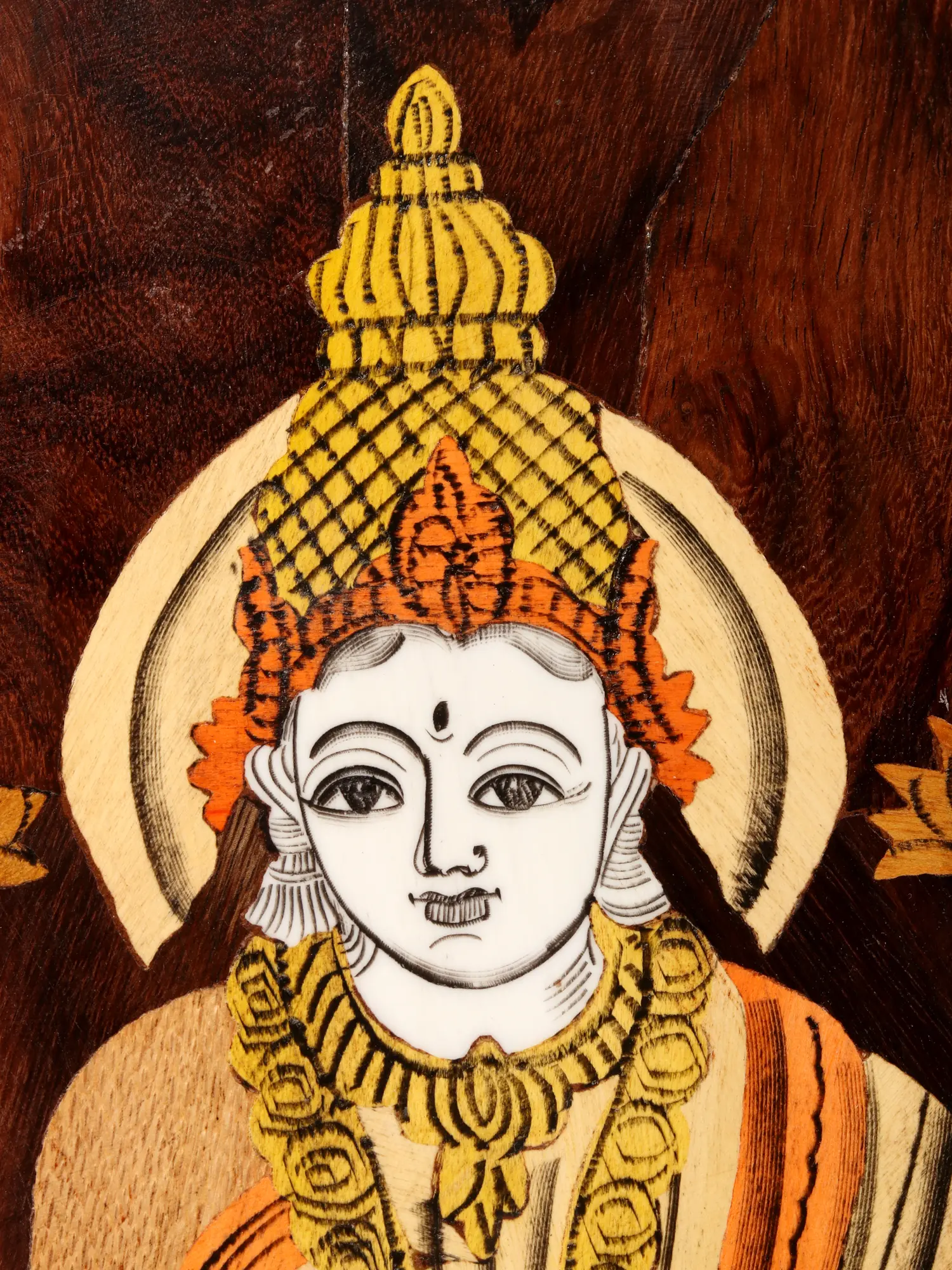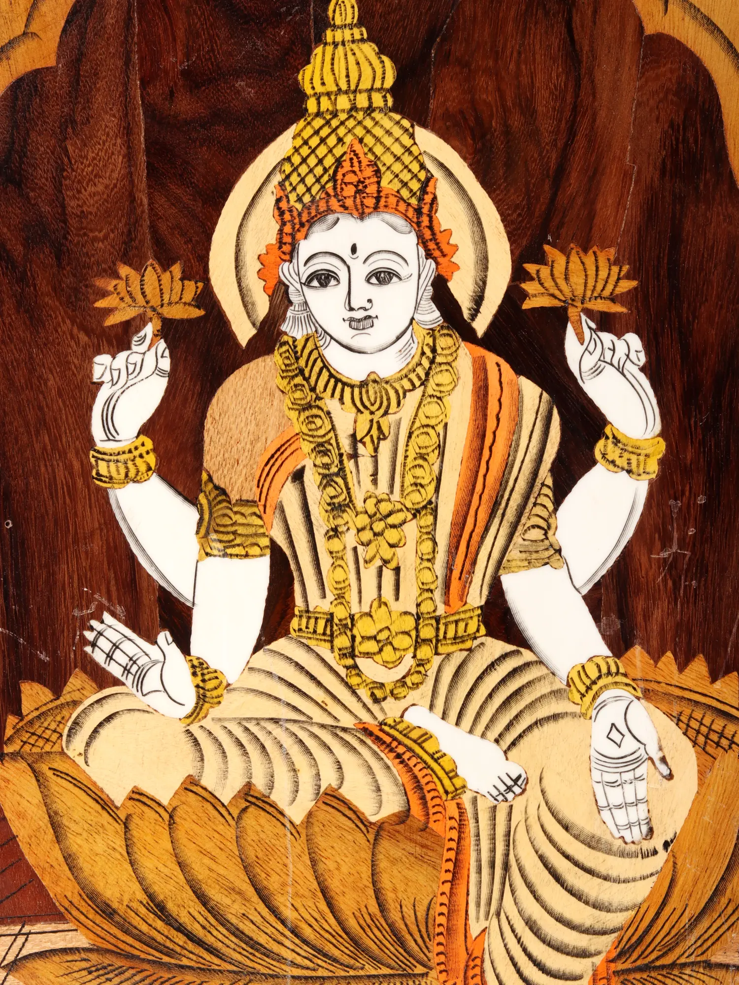 Witness the embodiment of prosperity and good fortune in this captivating artwork on a wood panel. Natural colours depict Goddess Lakshmi seated serenely on a lotus flower. The artist's use of simple lines and subtle shading creates a sense of grace and luck. This piece is a reminder of Lakshmi's blessings and the potential for abundance in our own lives.