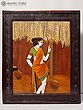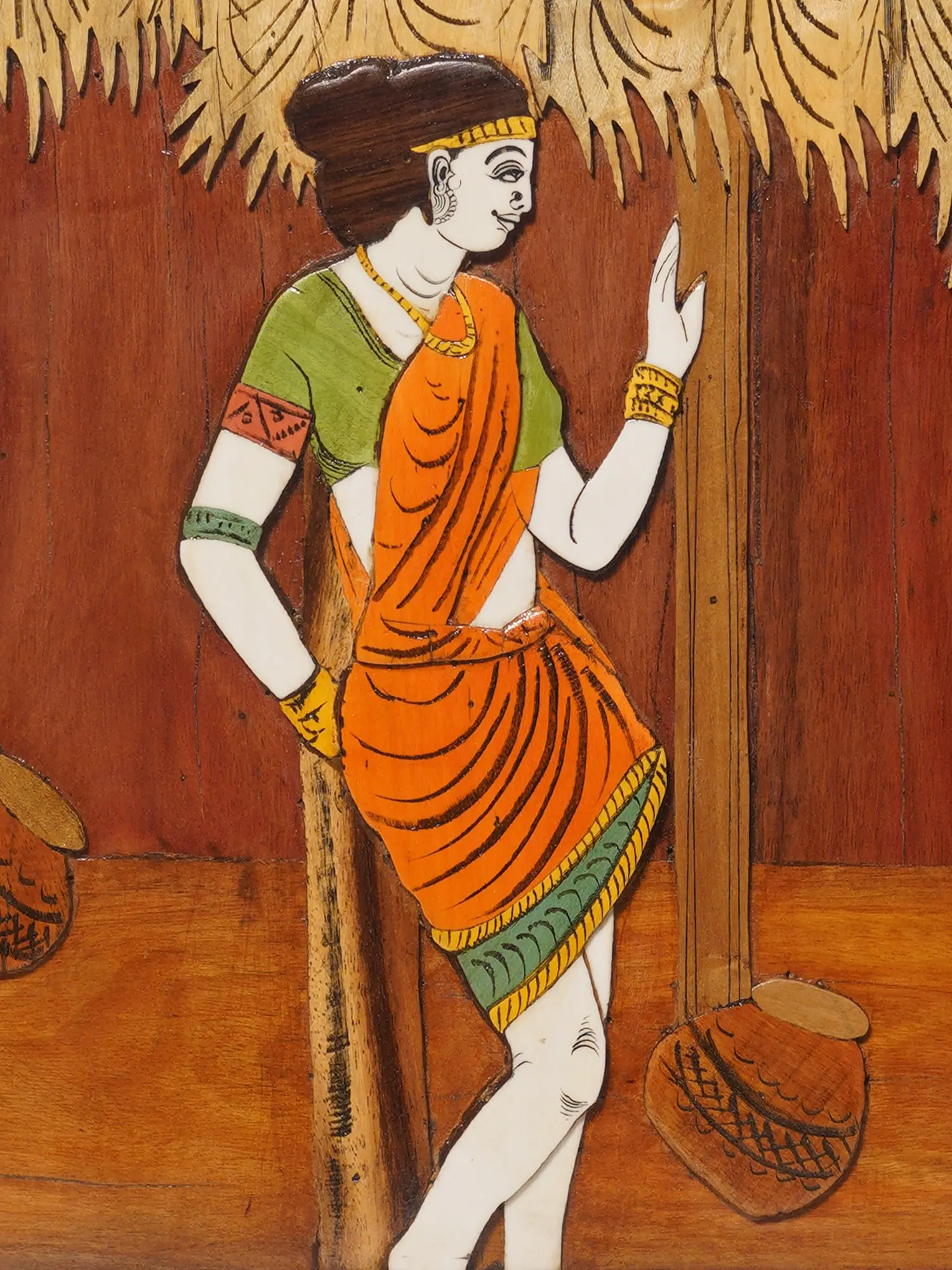 This panel is crafted from rosewood, a material prized for its rich color, durability, and fine grain. The inlay work is a testament to the skill and patience of the artisan. This method is often associated with Mysore, a region renowned for its exquisite woodwork and intricate inlay techniques, which were historically patronized by the royal families and temples. The technique, often passed down through generations, showcases a deep understanding of materials and a dedication to preserving traditional art forms. Each precisely placed piece of contrasting material contributes to the overall beauty and complexity of the image. The frame has delicate patterns engraved in it. The act of creating such a piece is itself a form of devotion, echoing the reverence for nature and beauty that permeates Indian art and culture. The woman depicted could be seen as an embodiment of Lakshmi, the goddess of prosperity and abundance, who is often associated with the fertile earth and the bounty of the harvest. While not explicitly a depiction of a deity, her grace and poise evoke a similar sense of reverence for the feminine principle and the life-giving forces of nature.