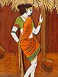 Step into a scene of quiet grace with this captivating rosewood panel. The intricate inlay work depicts a rural woman, poised in a standing gesture that suggests both welcome and serene confidence. Her simple yet elegant attire – a vibrant sari draped artfully – speaks of the everyday beauty found in the Indian countryside. The artist's attention to detail brings her to life, from the curve of her hand to the gentle sway of her garments. This is more than just a picture; it is a snapshot of a world where life unfolds at a slower pace, where the connection to the land is deep and enduring. The setting itself is suggestive of rustic simplicity. A roughly textured wall provides a backdrop, offering a sense of place and authenticity. The presence of earthen pots hints at the daily rituals of water gathering and storage, essential for life in a rural village. The overall composition evokes a feeling of warmth and nostalgia, transporting the viewer to a time and place far removed from the hustle and bustle of modern life.